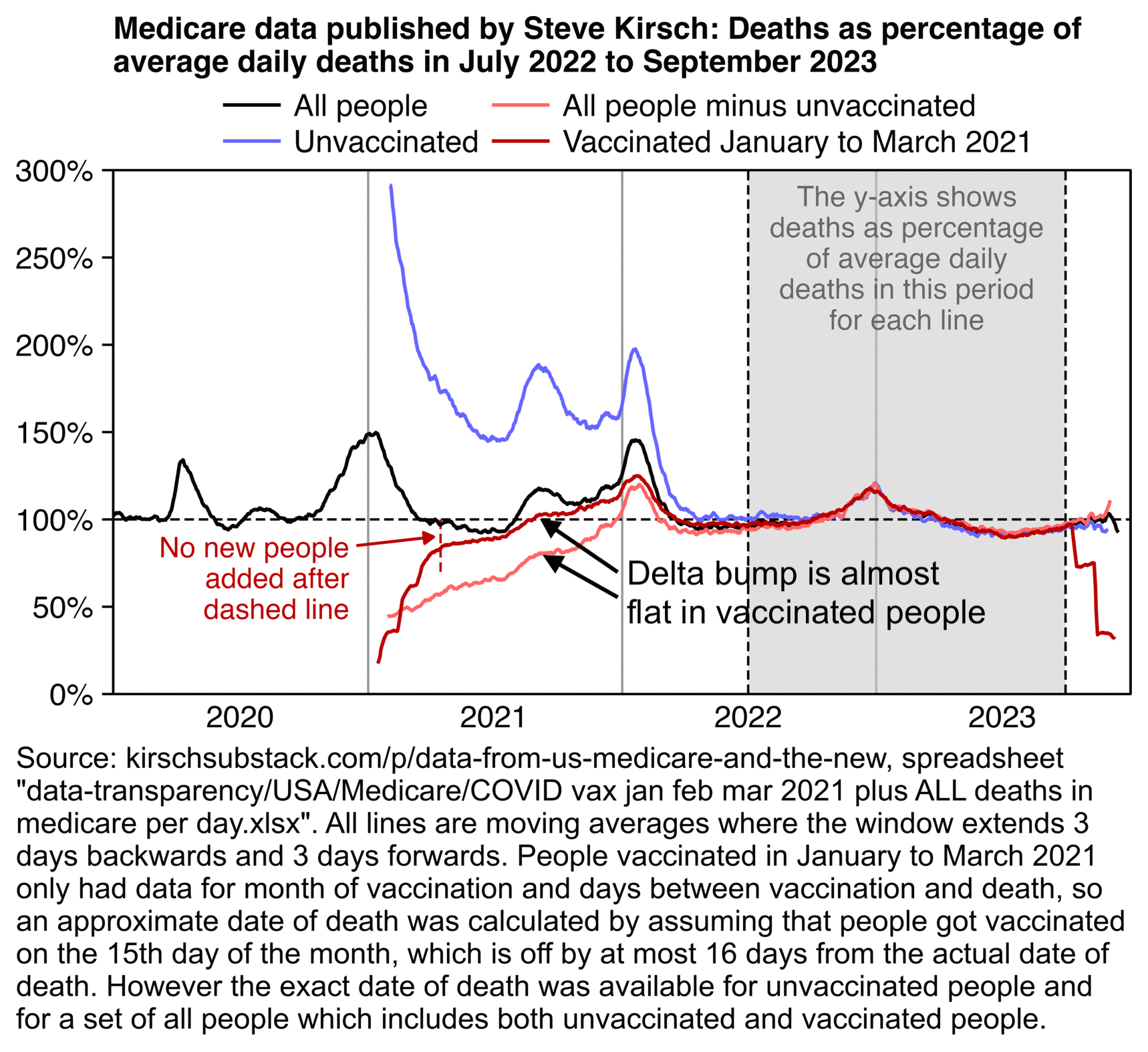 sub="Source: kirschsubstack.com/p/data-from-us-medicare-and-the-new, spreadsheet \"data-transparency/USA/Medicare/COVID vax jan feb mar 2021 plus ALL deaths in medicare per day.xlsx\". All lines are moving averages where the window extends 3 days backwards and 3 days forwards. People vaccinated in January to March 2021 only had data for month of vaccination and days between vaccination and death, so an approximate date of death was calculated by assuming that people got vaccinated on the 15th day of the month, which is off by at most 16 days from the actual date of death. However the exact date of death was available for unvaccinated people and for a set of all people which includes both unvaccinated and vaccinated people."