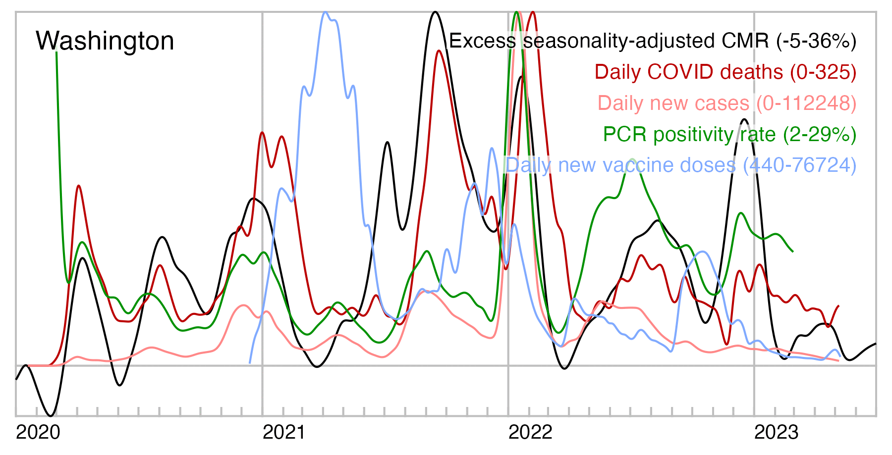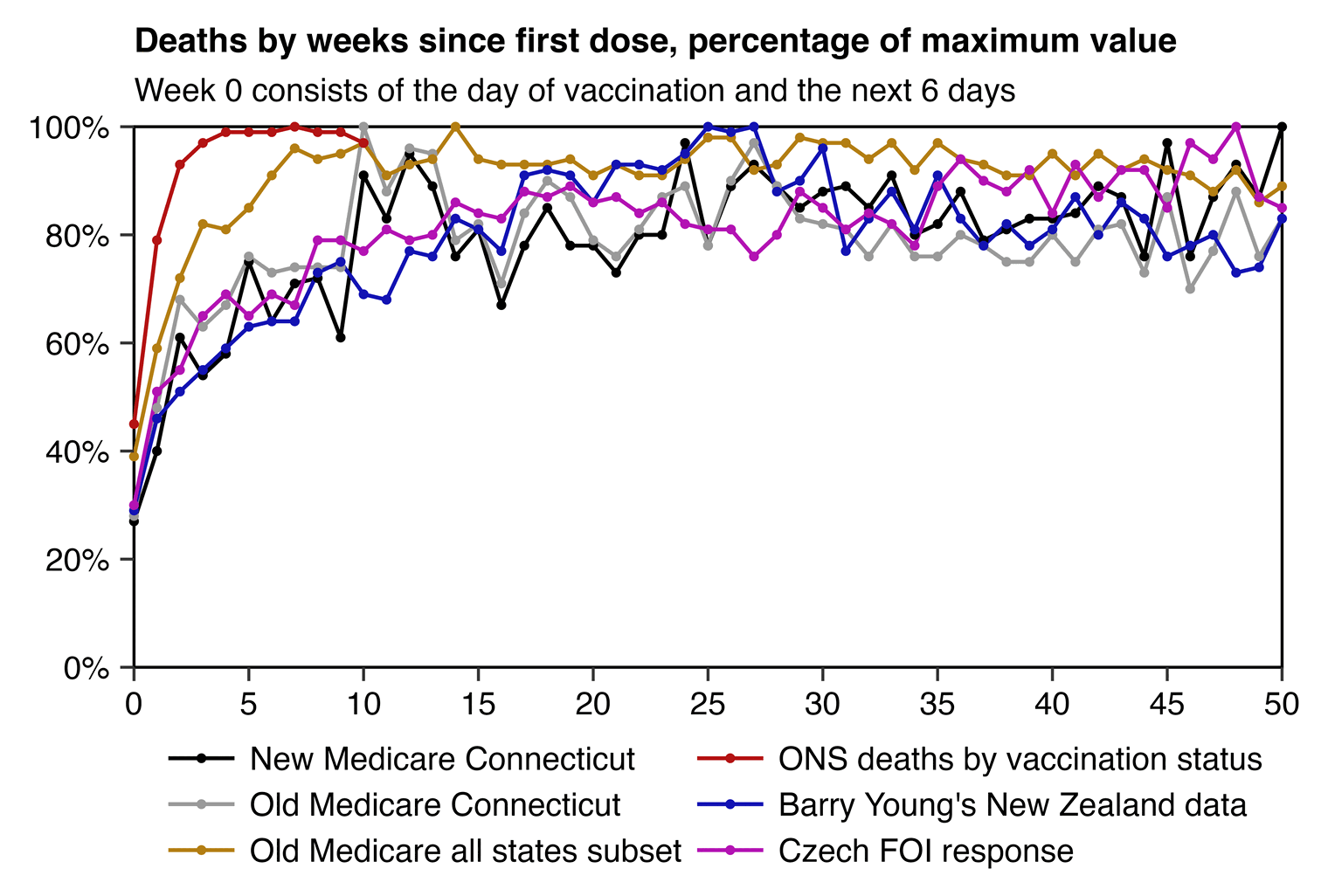 I believe a similar effect explains why the temporal HVE for first doses only appears to last about 3 weeks in Kirsch's Medicare data even though it lasts longer in Barry Young's New Zealand data, because in the US a lot of people got the first dose during the tail end of a COVID wave in early 2021, but New Zealand was free of COVID in 2021 when most people got the first dose: [connecticut.html#Comparison_of_deaths_by_weeks_since_vaccination_to_other_datasets]