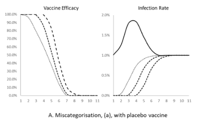 The abstract of Neil and Fenton's paper said: "Simulation demonstrates that this miscategorisation bias artificially boosts vaccine efficacy and infection rates even when a vaccine has zero or negative efficacy." But in their simulation the 1-to-3-week classification delay was only applied to the numerator for cases but not to the denominator for the population size: