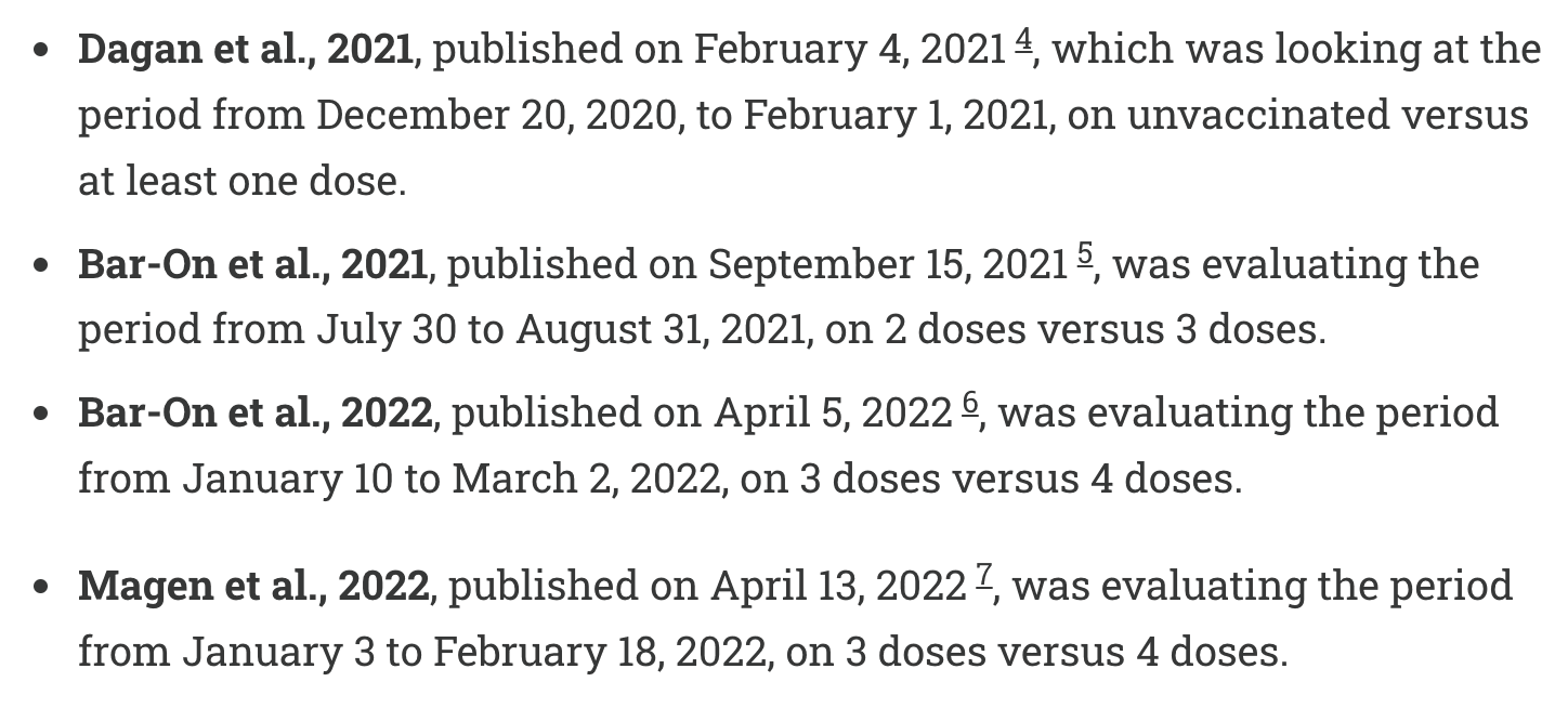 canceledmouse posted a similar analysis here: https://openvaet.substack.com/p/how-the-israeli-data-used-to-sell. It included this list that showed the observation period of each study: