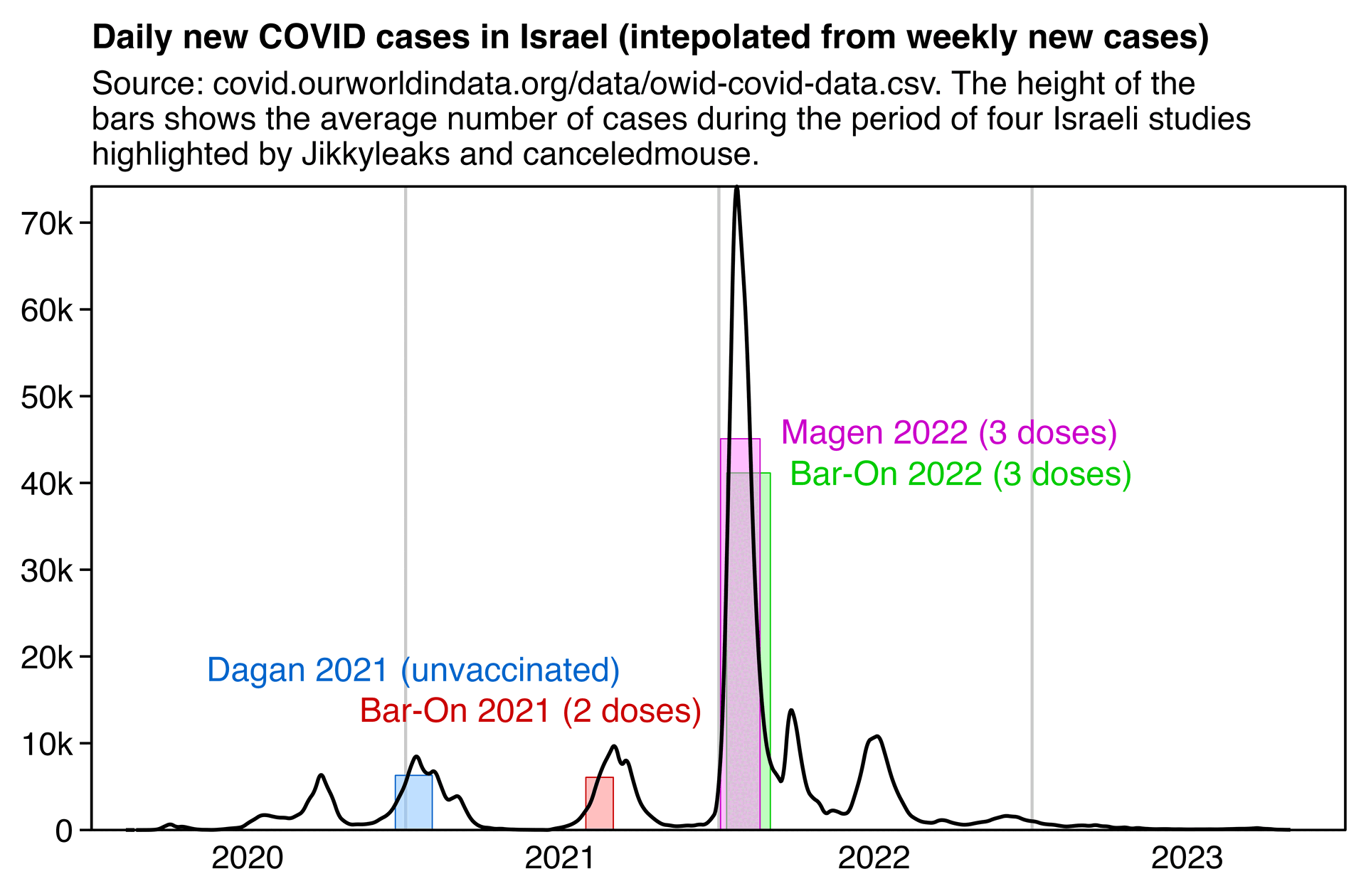 However the four studies were performed at different time periods when Israel had different rates of daily new COVID cases. When I divided the incidence values calculated by canceledmouse with the average daily new cases in Israel during the period of each study, I got a higher ratio for unvaccinated people in the first study than for people with three doses in the last two studies:
