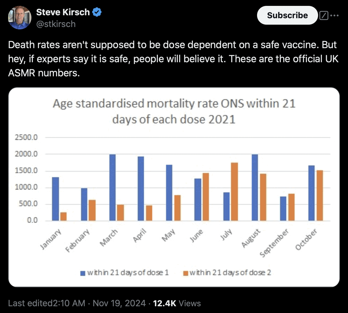 Kirsch also wrote: "Fenton, Neil, McLachlan and Craig also managed to successfully demonstrate to the UK Office of the Statistics Regulator that these miscategorisation processes meant official statistics in the UK could not be relied upon when used to support arguments of Covid-19 vaccine effectiveness (link)".