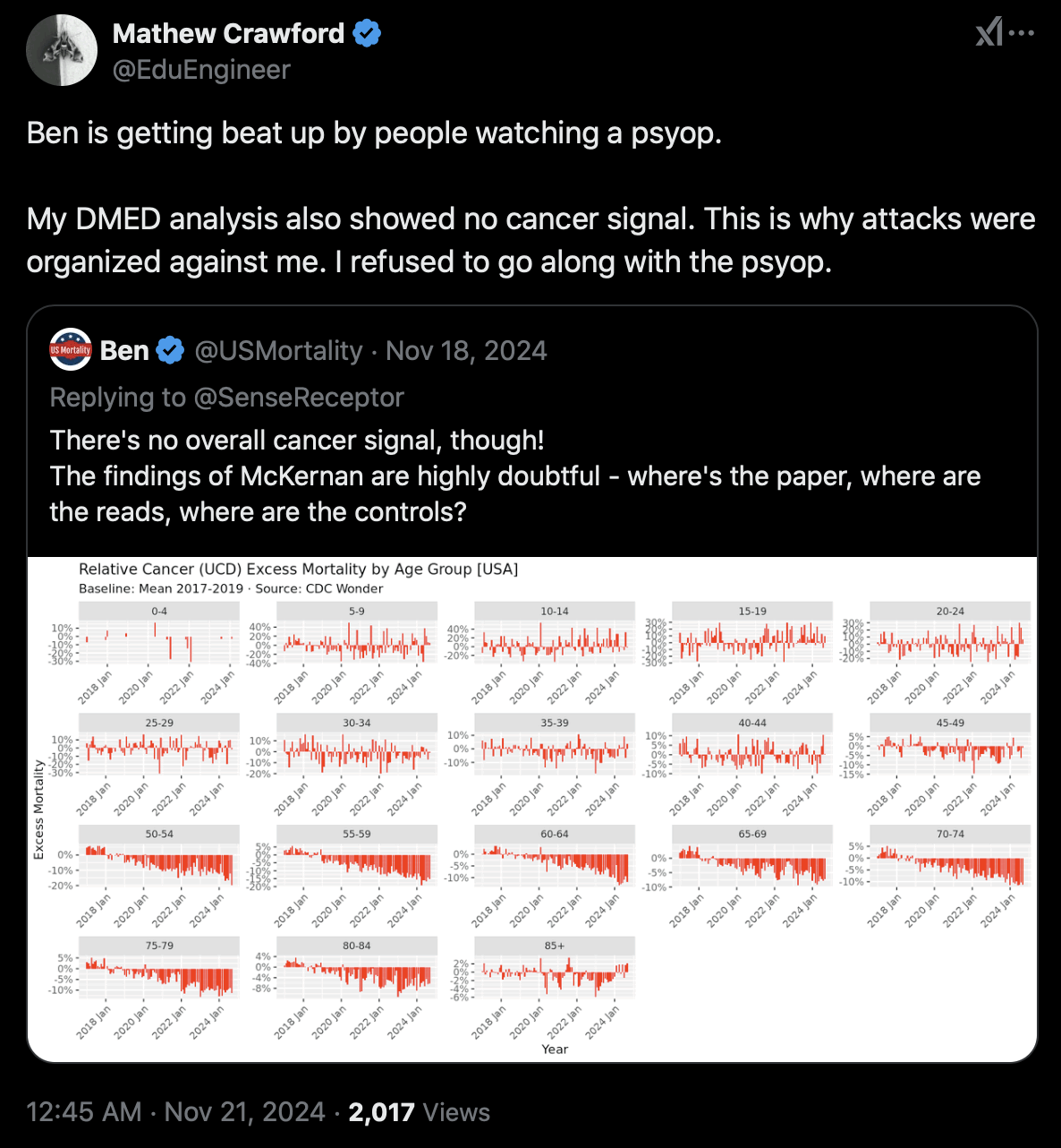 In 2022 Martin Neil tweeted: "The ONS's December report claims anomalies we identified are caused by healthy vaccinee effect. We examined the new ONS data and found NO evidence to support this claim". [https://x.com/MartinNeil9/status/1481561698792267779] And in March 2024 Neil tweeted: "There is no evidence of a healthy vaccinee effect. You are signing up to an assumption usually exploited to pretend vaccines are effective. We demonstrated this using the ONS's own data." [https://x.com/MartinNeil9/status/1767991047940907318] However by April 2024 he seems to have come to the conclusion that the HVE might be real after all based on a Czech study which said that the HVE explained why unvaccinated people had higher mortality than vaccinated people. [https://x.com/MartinNeil9/status/1780163490247791002]