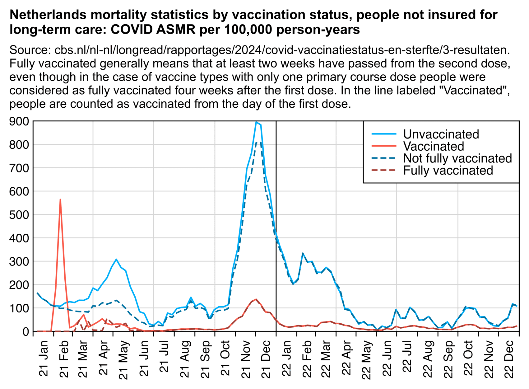 In my previous plot the number of deaths in unvaccinated people goes down a lot between late 2021 and mid-2022, but it's partially because many people were listed as unvaccinated until they got a booster dose.