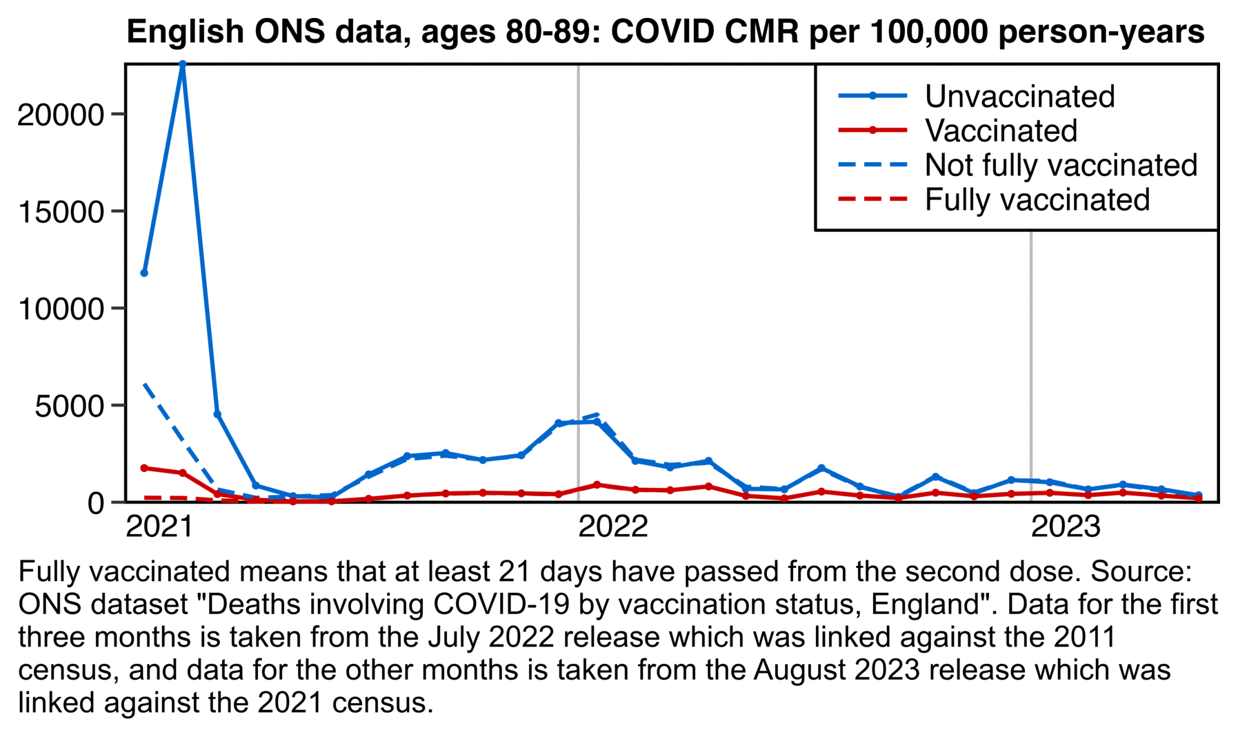 sub="Fully vaccinated means that at least 21 days have passed from the second dose. Source: ONS dataset \"Deaths involving COVID-19 by vaccination status, England\". Data for the first three months is taken from the July 2022 release which was linked against the 2011 census, and data for the other months is taken from the August 2023 release which was linked against the 2021 census."