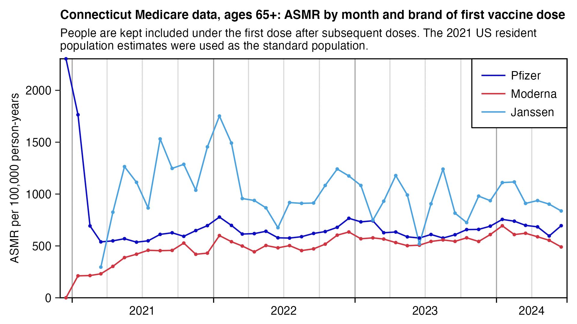 Kirsch's main thesis for why the Czech data showed that vaccines were deadly was that people who got a Moderna vaccine for their first dose had higher age-specific mortality rates than people who got a Pfizer vaccine for their first dose. However Kirsch had already made it into his main thesis in the preliminary version of his analysis at GitHub, even though at the time he was still claiming that the vaccines were distributed randomly and people were not allowed to choose which vaccine type they got. But if the vaccines were not actually distributed randomly then Kirsch's argument becomes much weaker, because then it's possible that the difference in mortality between Moderna and Pfizer can be explained by confounders instead.
