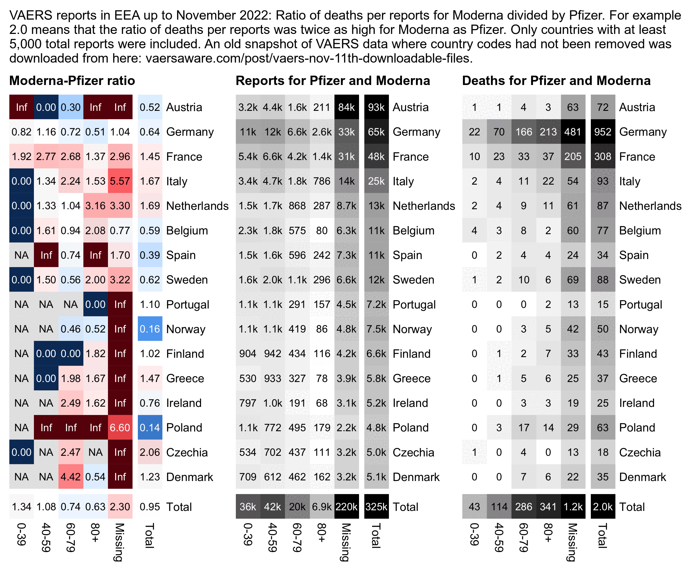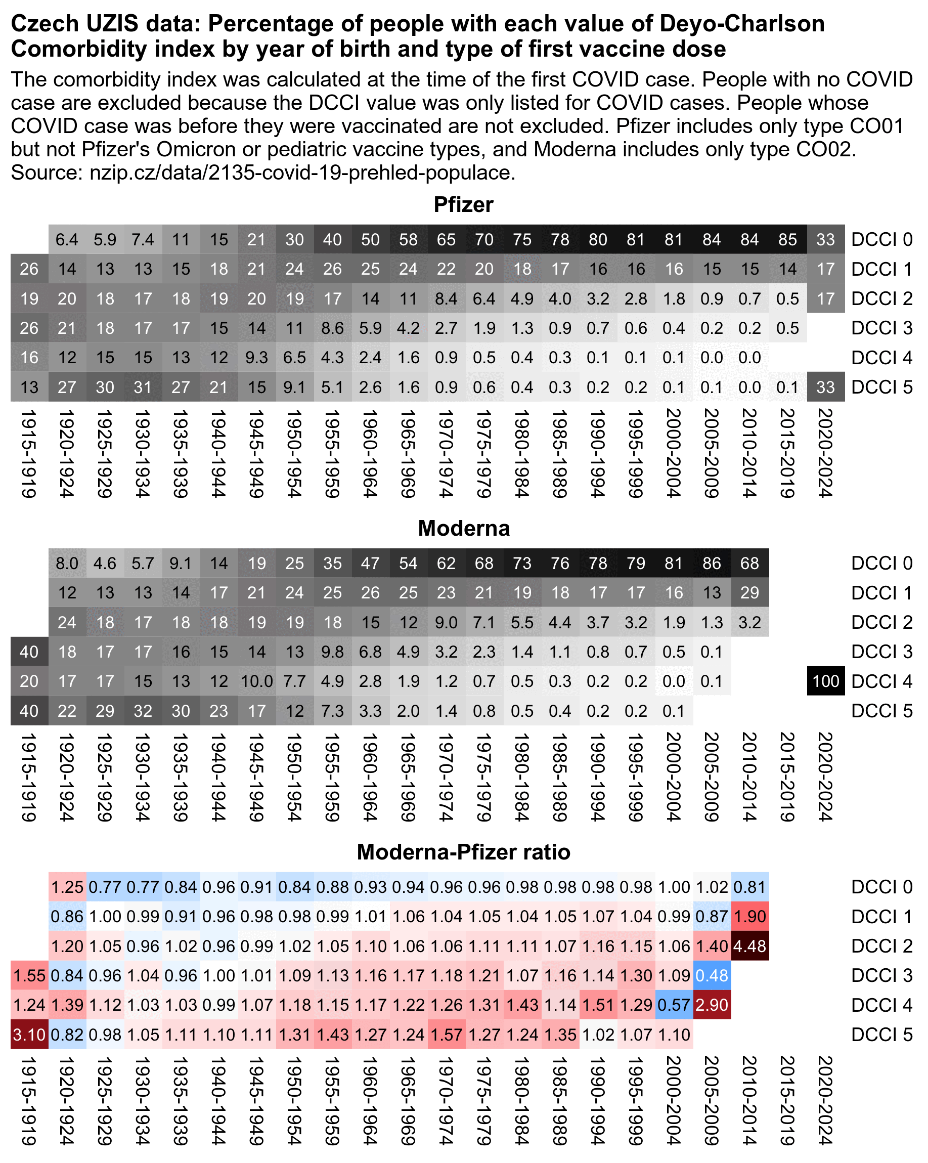 In November 2024 a new Czech dataset was published which was similar to the earlier record-level dataset analyzed by Kirsch, but the new dataset also included a column for a comorbidity index. And within most age groups the proportion of people with the highest value of the comorbidity index was higher for Moderna than Pfizer. [czech4.html#Comorbidity_index_by_age_group_and_vaccine_type_in_new_UZIS_data]