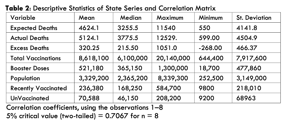 However, I will be more blunt and assert that his analysis is essentially worthless. Adjusting for State population not only has a "large impact", but makes it impossible to draw any meaningful conclusions, beyond the trivial one that total excess mortality strongly correlates with total population. Moreover, an analysis that did deal with rates of mortality and vaccination is unlikely to have yielded any meaningful conclusion anyway for this particular dataset, because rates of vaccination were very high in all Australian States. I will now elaborate on both points.