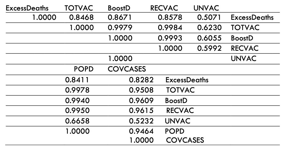 round(cor(t[,-(1:3)]),4) # excess_deaths total_vaccinations booster_doses # excess_deaths 1.0000 0.9648 0.9730 # total_vaccinations 0.9648 1.0000 0.9979 # booster_doses 0.9730 0.9979 1.0000 # population 0.9599 0.9978 0.9942 # recently_vaccinated 0.9733 0.9984 0.9993 # unvaccinated 0.5287 0.6230 0.6055 # population recently_vaccinated unvaccinated # excess_deaths 0.9599 0.9733 0.5287 # total_vaccinations 0.9978 0.9984 0.6230 # booster_doses 0.9942 0.9993 0.6055 # population 1.0000 0.9950 0.6663 # recently_vaccinated 0.9950 1.0000 0.5992 # unvaccinated 0.6663 0.5992 1.0000
