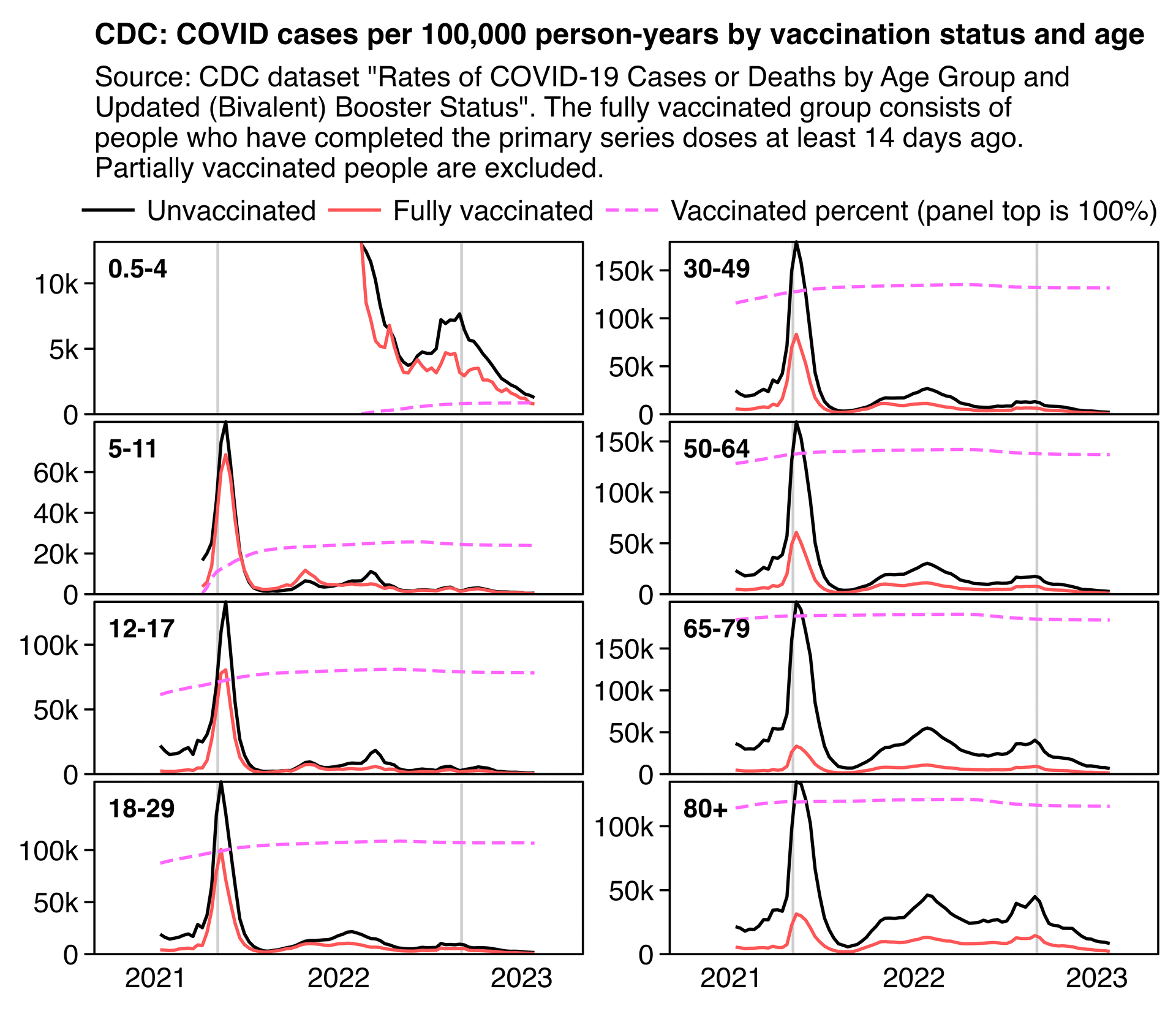 In the spreadsheet of vaccination data used by Allen, there's a note which says that the number of unvaccinated people is "based on the total Estimated Resident Population minus individuals who have a dose recorded in the Australian Immunisation Register". [https://www.health.gov.au/resources/publications/covid-19-vaccination-vaccination-data-10-november-2023] However if you look at the rows of the spreadsheet for people whose state of residence is Victoria, the rows for unvaccinated, recently vaccinated, and not recently vaccinated people only add up to 5,154,000, even though the resident population estimate of Victoria on December 31st 2022 was 6,704,300. So I don't know if the youngest ages are excluded from the calculation for the number of unvaccinated people.