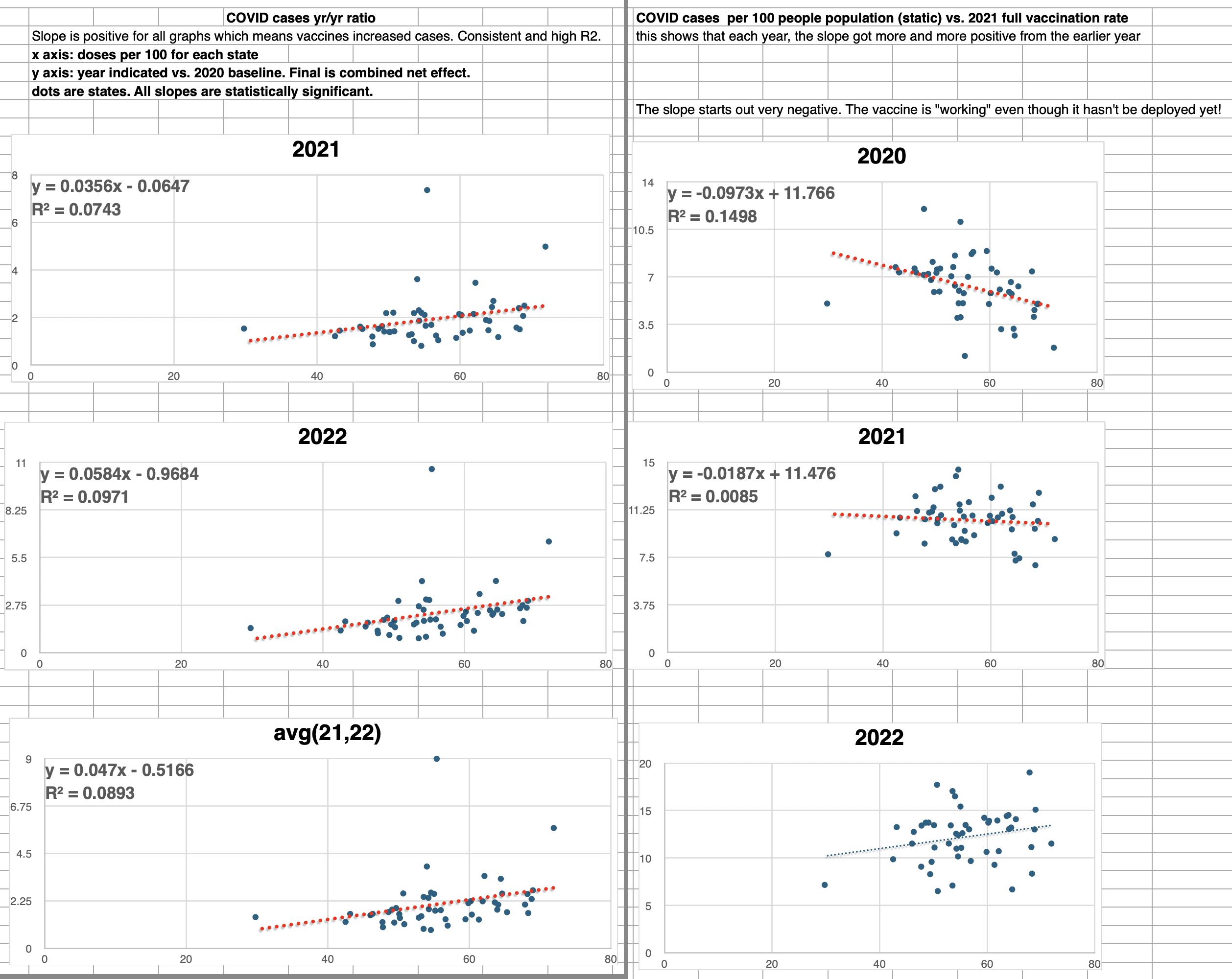 Kirsch wrote: "CDC state and county case data: x-axis=vax rate. y-axis=relative # of cases to baseline. Regression shows >1.5X higher cases in 2021, and >2X higher cases in 2022. 95% confidence slope increased in both years over baseline in BOTH all state and all county data. This is dispositive as there is nothing that is more fundamental than this data to resolve the question of cases. More vaccines→ more cases in both years."