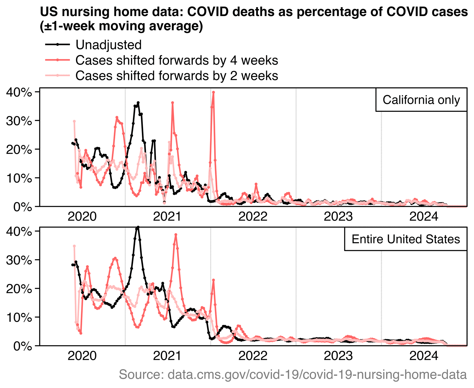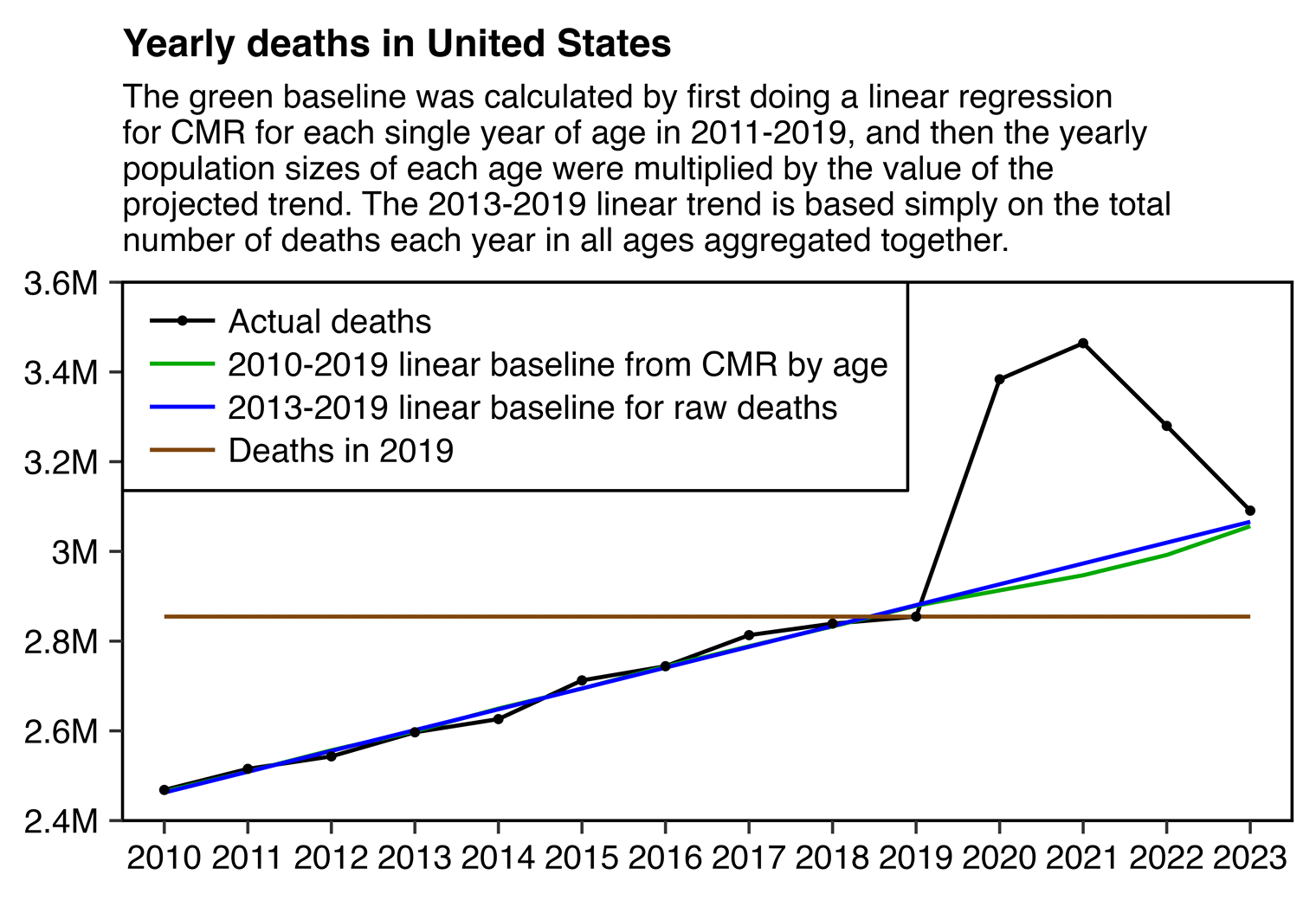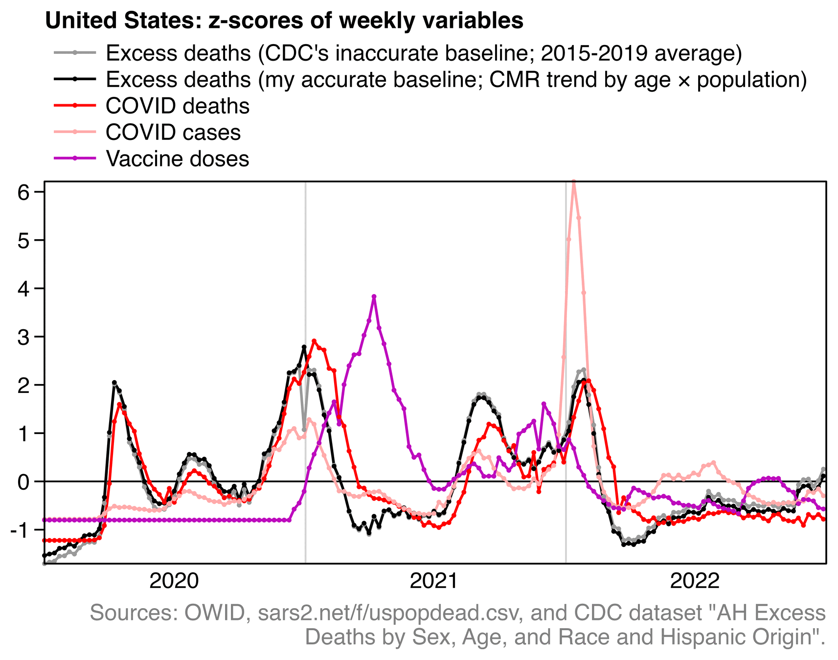 However with a more accurate method of calculating excess mortality, there should be close to zero excess mortality around March to May 2022 and around March 2021. At Mortality Watch if you plot ASMR in the United States with a 2010-2019 linear baseline, there's even a few weeks that get negative excess mortality in March and April of 2022. [https://www.mortality.watch/explorer/?c=USA&ct=weekly&df=2020%2520W01&bm=lin_reg] In CDC's primary dataset for excess deaths which uses a Farrington surveillance algorithm to calculate the baseline, there's also weeks with negative excess deaths in March and April of 2022. [https://www.cdc.gov/nchs/nvss/vsrr/covid19/excess_deaths.htm]