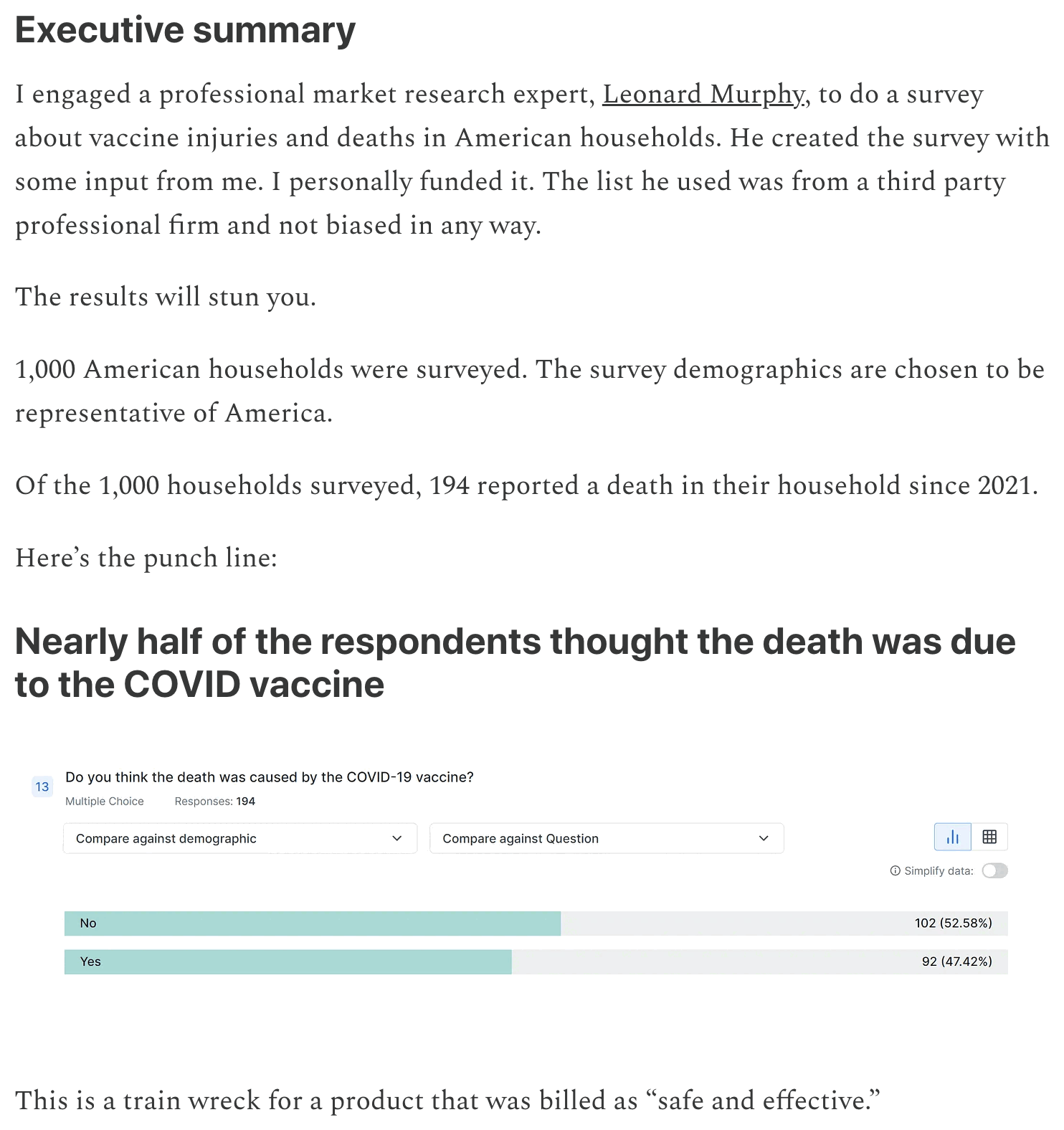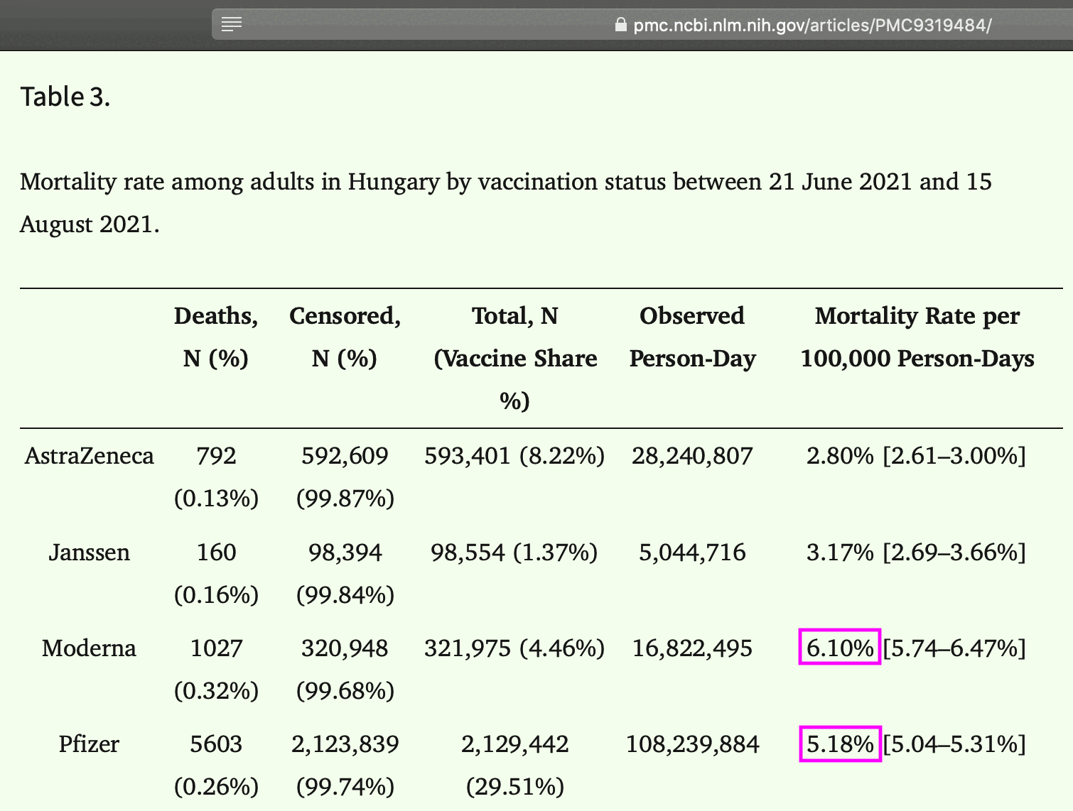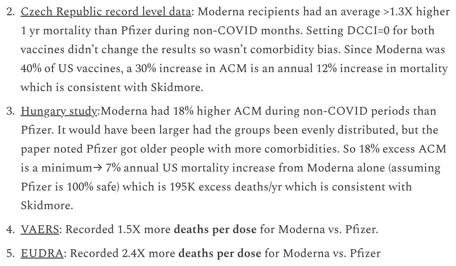 Kirsch wrote: "The Czech Republic record-level data obtained under FOIA request from the Czech government showed that people who got the Moderna vaccine were 30% more likely to die within 1 year of the shot than people who got the Pfizer vaccine. The 30% difference appeared in all age groups where there was sufficient data and it happened during NON-COVID time periods. People tried to attack this claiming that it was due to distribution bias, but we showed that was false. The reason this is such an important study is because you cannot compare vaccinated with unvaccinated death rates due to selection bias. But in the Czech Republic, the vaccines were randomly assigned and nobody had any clue which one was safer. So there was no systematic or systemic bias. So how can the death rates be 30% higher in every age group with sufficient data? The only way that can happen is if the Moderna vaccine is more deadly."