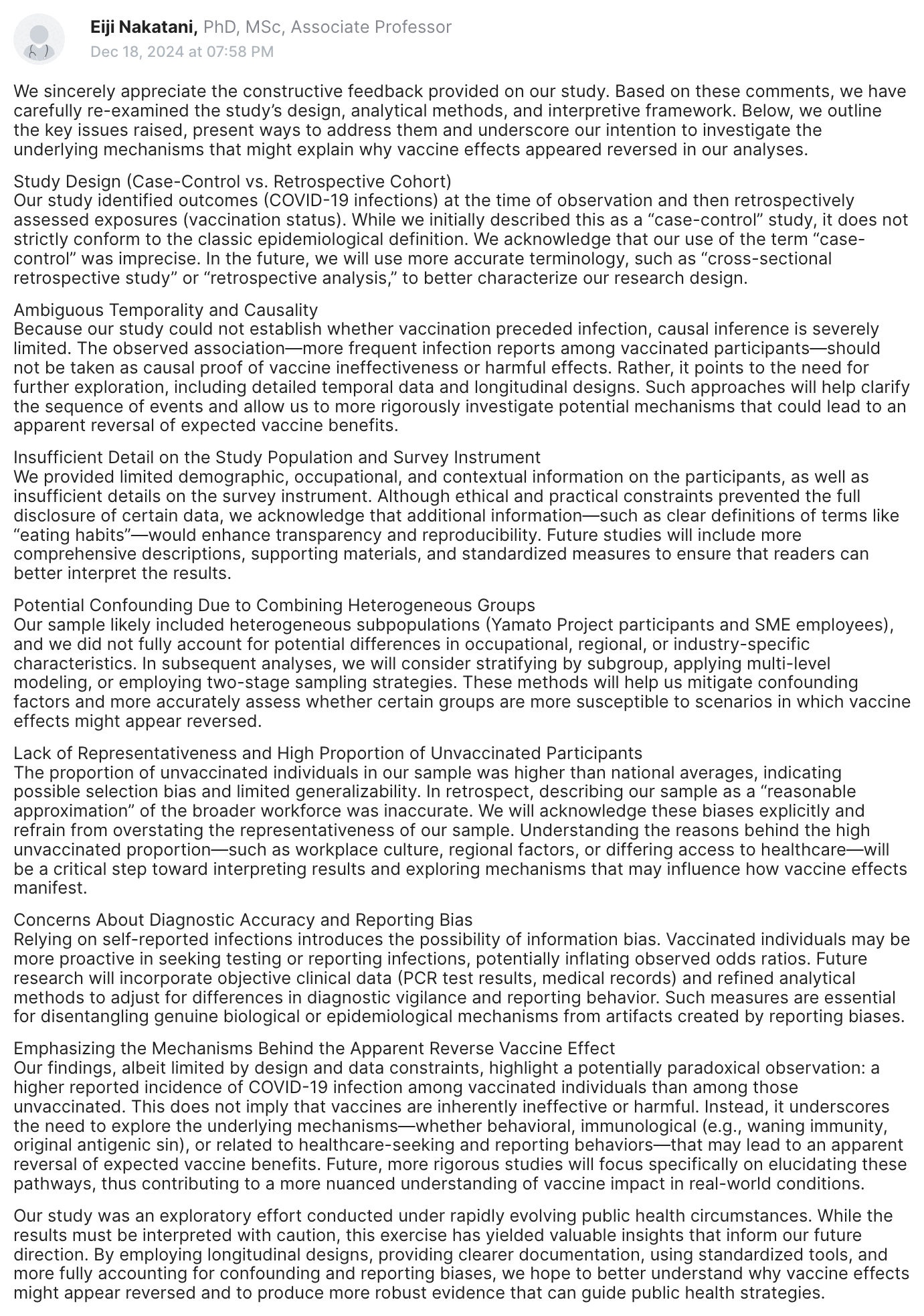 The Japanese paper was published at Cureus which allows readers to post comments about the paper. Someone called Sadao Suzuki posted the following comment: [https://www.cureus.com/articles/313843-behavioral-and-health-outcomes-of-mrna-covid-19-vaccination-a-case-control-study-in-japanese-small-and-medium-sized-enterprises]