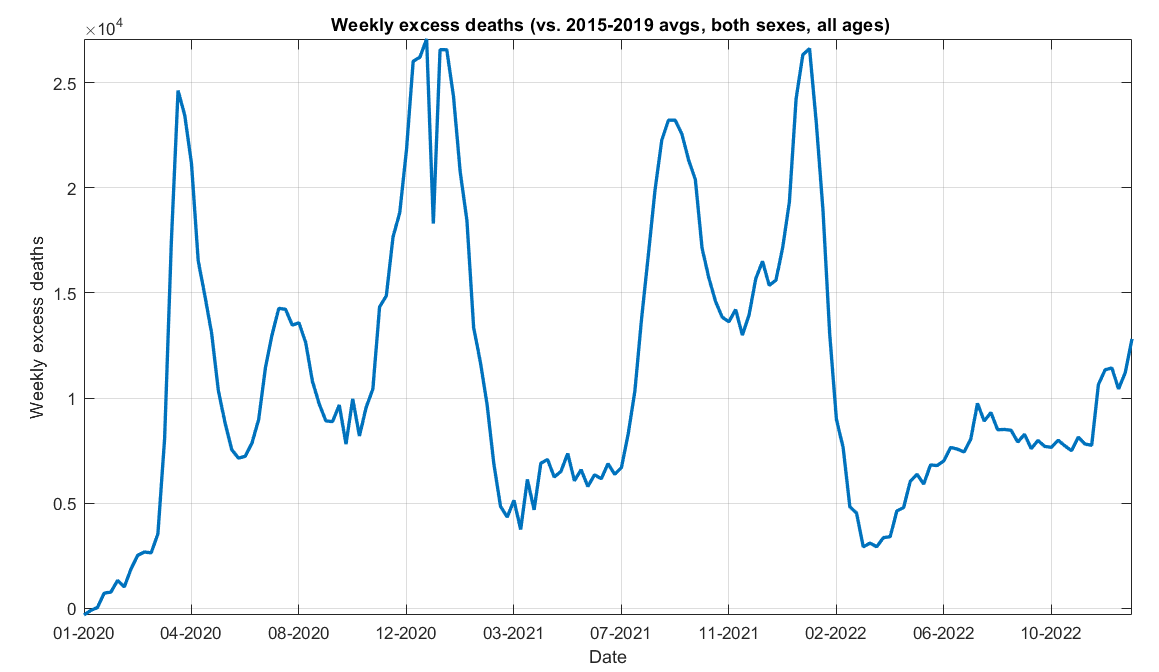 But anyway since Pantazatos used a 2015-2019 average baseline which exaggerated excess deaths in 2022 and 2021 relative to 2020, in his model where vaccines explained 5% of additional variance in excess mortality beyond COVID cases, it might have partially been because his baseline produced superfluous excess deaths in 2021 and 2022 which happened to partially coincide with periods when vaccine doses were administered. And because his model had a different term for each COVID wave, it allowed the weight of the COVID waves in 2021 and 2022 to be reduced in order to accommodate a higher weight to vaccines.