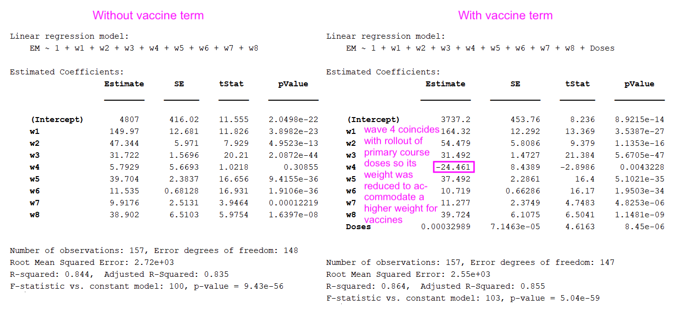And anyway why would COVID cases have a negative effect on excess mortality during wave 4 but a positive effect during other waves? Wave 4 was the only wave with a negative coefficient when the term for vaccines was included.
