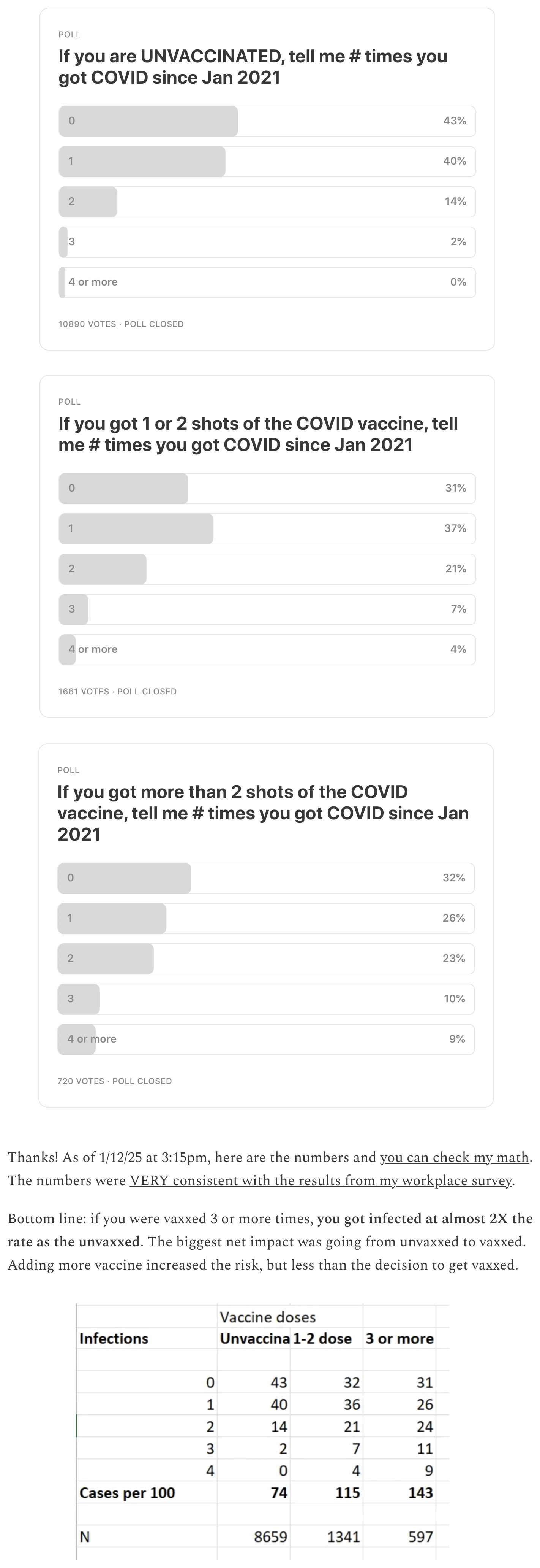Kirsch wrote: "New Japan study shows more vaccines→more cases as well: 'The odds of contracting COVID-19 increased with the number of vaccine doses: one to two doses (OR: 1.63, 95% CI: 1.08-2.46, p = 0.020), three to four doses (OR: 2.04, 95% CI: 1.35-3.08, p = 0.001), and five to seven doses (OR: 2.21, 95% CI: 1.07-4.56, p = 0.033).' This is consistent with Table 2 in the CC study."