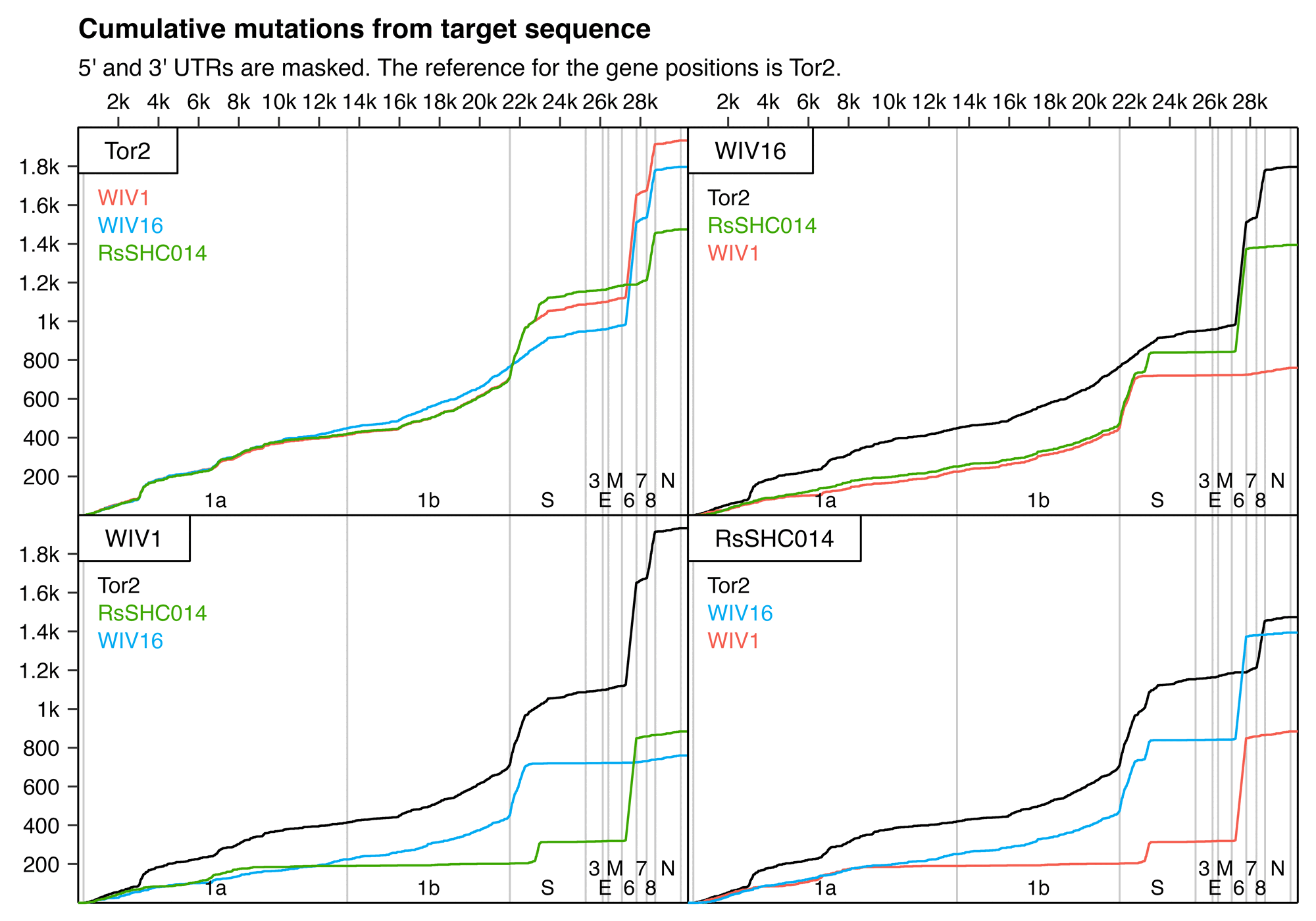 $ printf %s\\n NC_045512\ sars2 NC_004718\ sars1 MN996532\ ratg13 MG772933\ zc45 MG772934\ zxc21 MZ937000\ banal52 >accession $ cat accession|while read l m;do curl -s "https://eutils.ncbi.nlm.nih.gov/entrez/eutils/efetch.fcgi?db=nuccore&rettype=fasta&id=$l">$m.fa;done $ cat accession|while read l m;do curl -s "https://eutils.ncbi.nlm.nih.gov/entrez/eutils/efetch.fcgi?db=nuccore&rettype=fasta_cds_aa&id=$l">$m.aa;done $ head -n3 sars2.fa >NC_045512.2 Severe acute respiratory syndrome coronavirus 2 isolate Wuhan-Hu-1, complete genome ATTAAAGGTTTATACCTTCCCAGGTAACAAACCAACCAACTTTCGATCTCTTGTAGATCTGTTCTCTAAA CGAACTTTAAAATCTGTGTGGCTGTCACTCGGCTGCATGCTTAGTGCACTCACGCAGTATAATTAATAAC $ head -n3 sars2.aa >lcl|NC_045512.2_prot_YP_009724389.1_1 [gene=ORF1ab] [locus_tag=GU280_gp01] [db_xref=GeneID:43740578] [protein=ORF1ab polyprotein] [exception=ribosomal slippage] [protein_id=YP_009724389.1] [location=join(266..13468,13468..21555)] [gbkey=CDS] MESLVPGFNEKTHVQLSLPVLQVRDVLVRGFGDSVEEVLSEARQHLKDGTCGLVEVEKGVLPQLEQPYVF IKRSDARTAPHGHVMVELVAELEGIQYGRSGETLGVLVPHVGEIPVAYRKVLLRKNGNKGAGGHSYGADL
