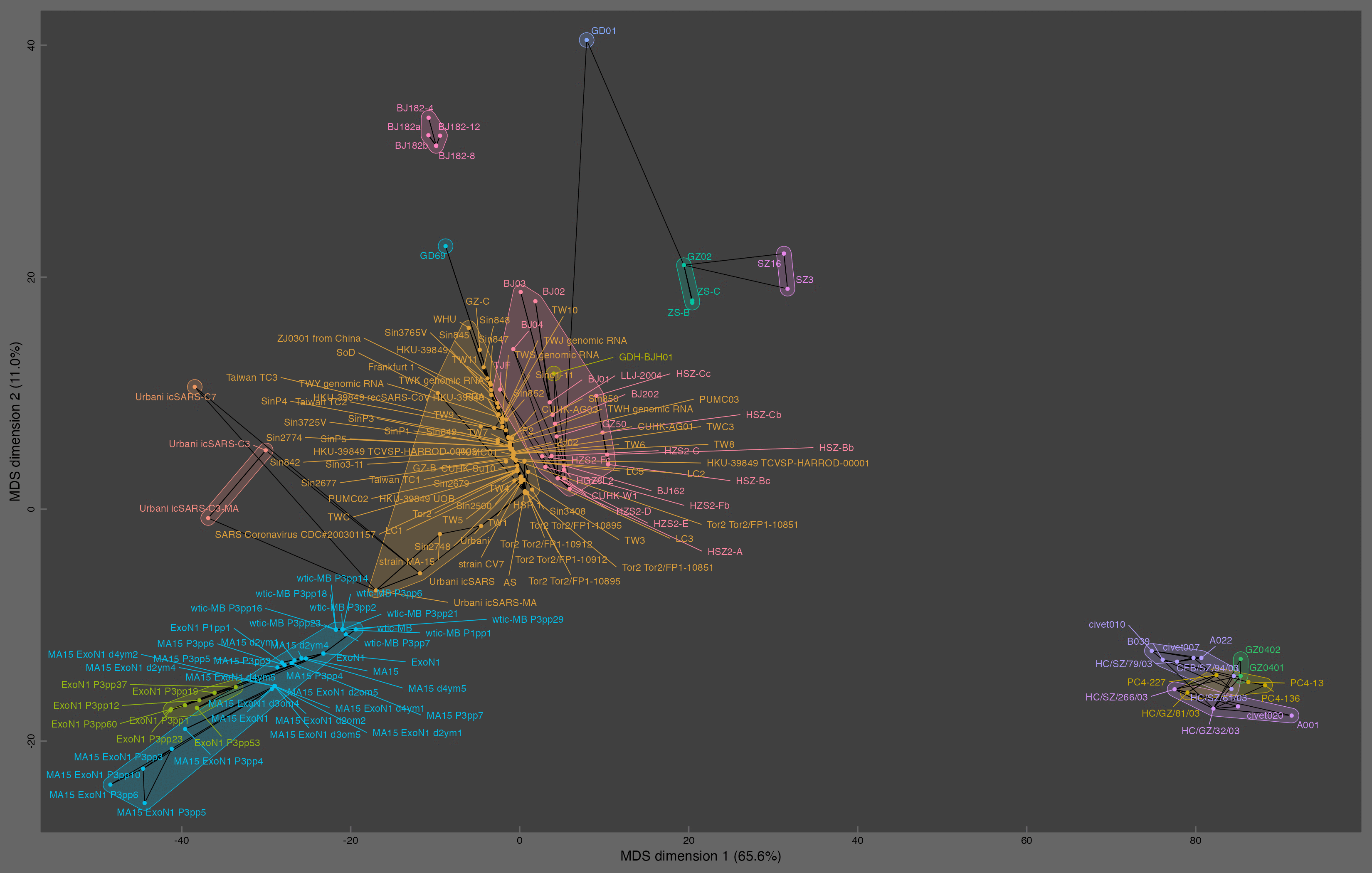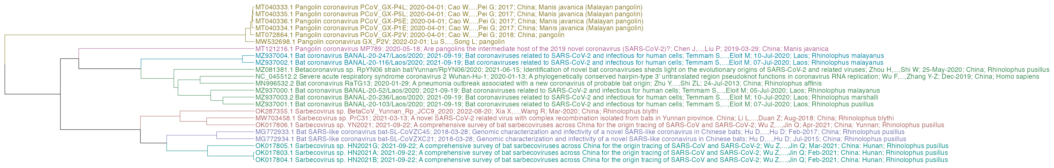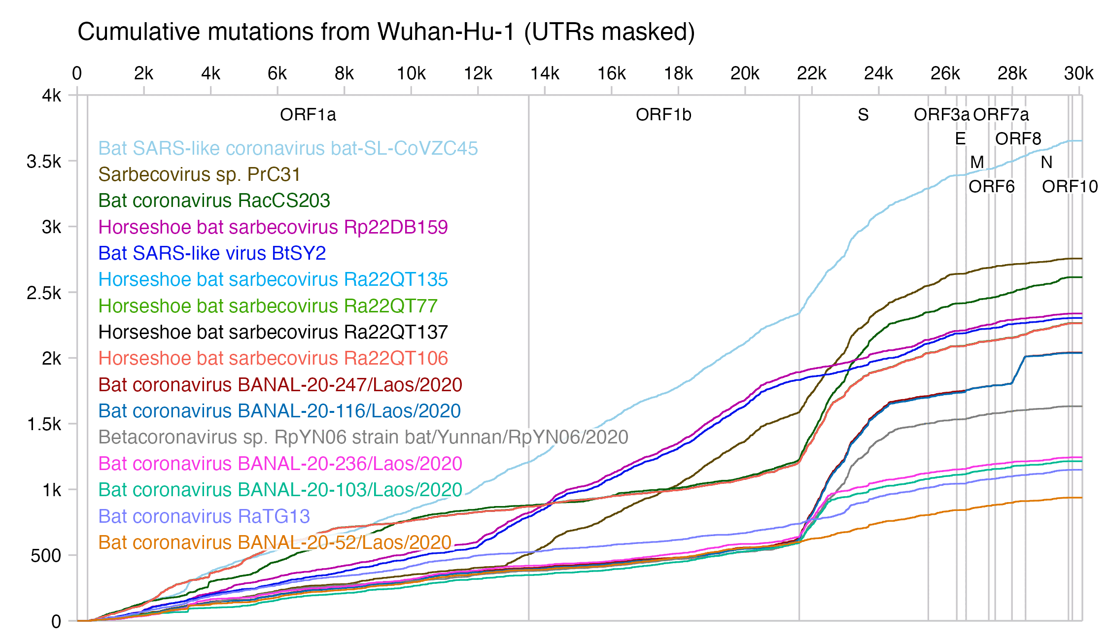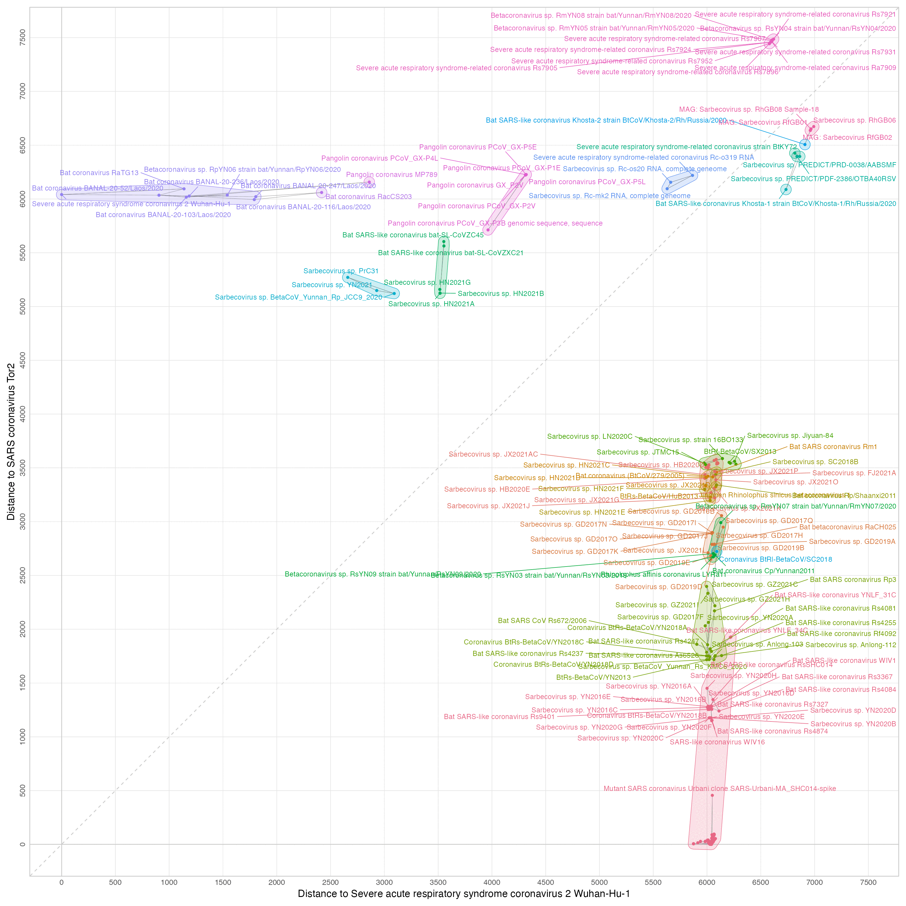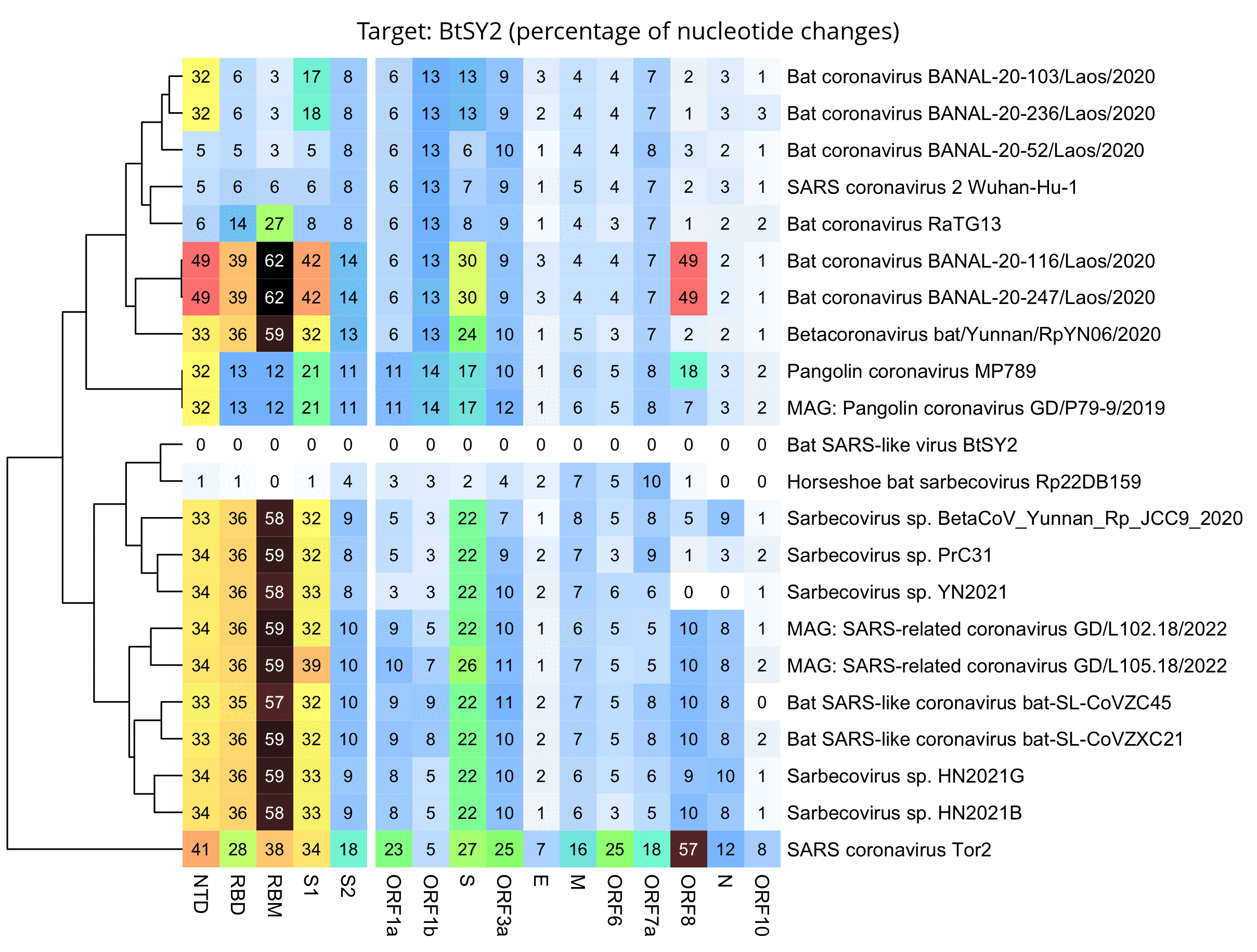 From the output above, you can see that the closest neighbor of SARS2 is BANAL-52 which has 905 nucleotide changes from SARS2.
