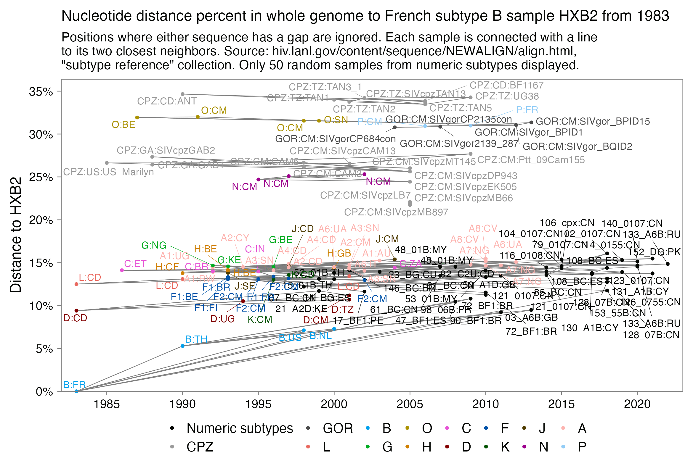 labs(x=NULL,y="Distance to SIVcpzMB66",title="Nucleotide distance percent in whole genome to to SIVcpzMB66 (closest SIV to early subtype B)",subtitle="Positions where either sequence has a gap are ignored. Source: hiv.lanl.gov/content/sequence/NEWALIGN/align.html, \"subtype reference\" collection. Only 50 random samples from numeric subtypes displayed."|>stringr::str_wrap(92))+