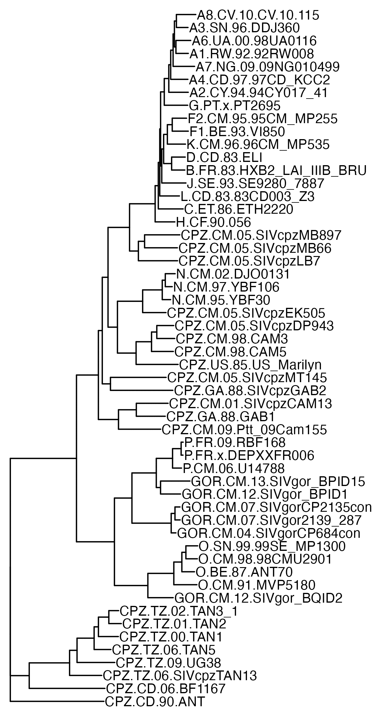 I'm using the Los Alamos HIV subtype reference as an example, which also contains HIV-1-like SIV sequences from chimpanzees and gorillas: https://www.hiv.lanl.gov/content/sequence/NEWALIGN/align.html. I picked only the oldest sample from each single-letter subtype along with all the SIV sequences: