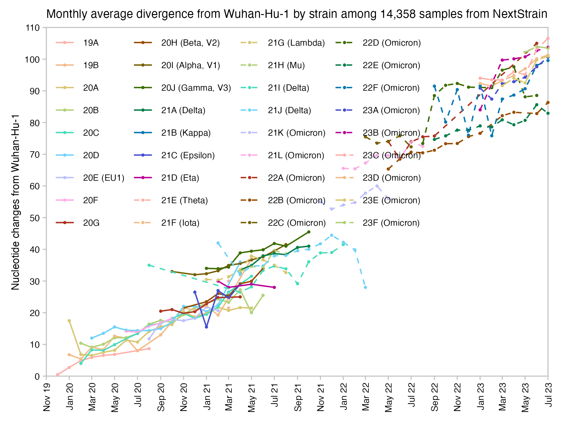 And then this code plots the collection year on the x-axis and the distance to a specified target sequence on the y-axis:
