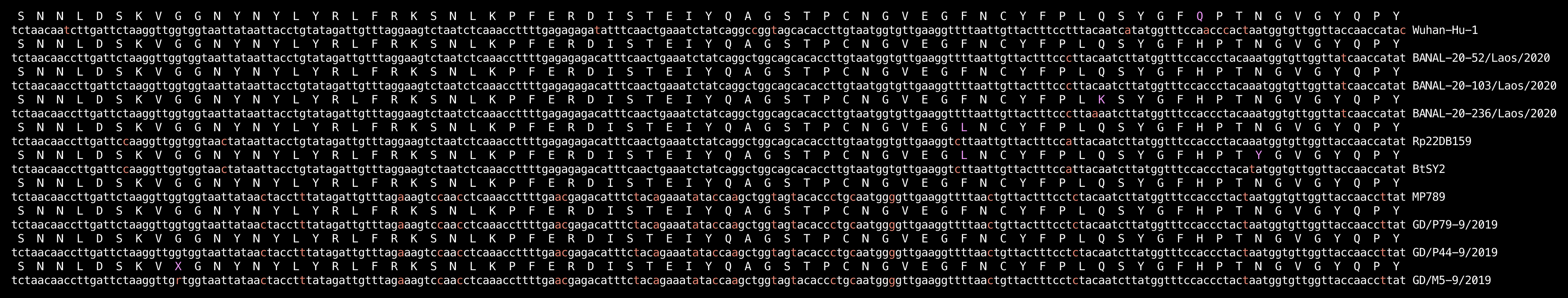 The code below creates a single FASTA file for the spike protein sequences of the viruses downloaded in the previous section. It then uses MAFFT to align the sequences and displays the alignment in the human-readable CLUSTAL format. From the output, you can see that the PRRA insert which encodes for the furin cleavage site is missing from each sequence except SARS2, even though BANAL-52 and RaTG13 include the QTNS part of the QTNSPRRA insert: