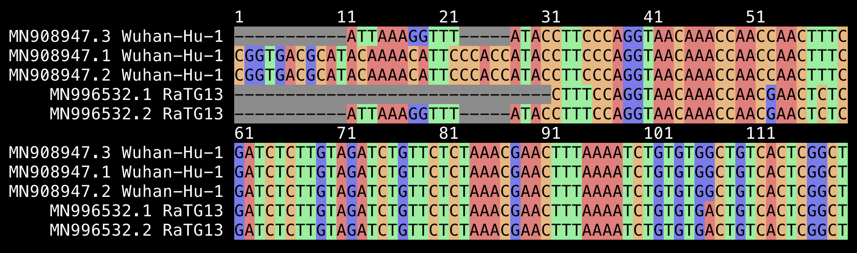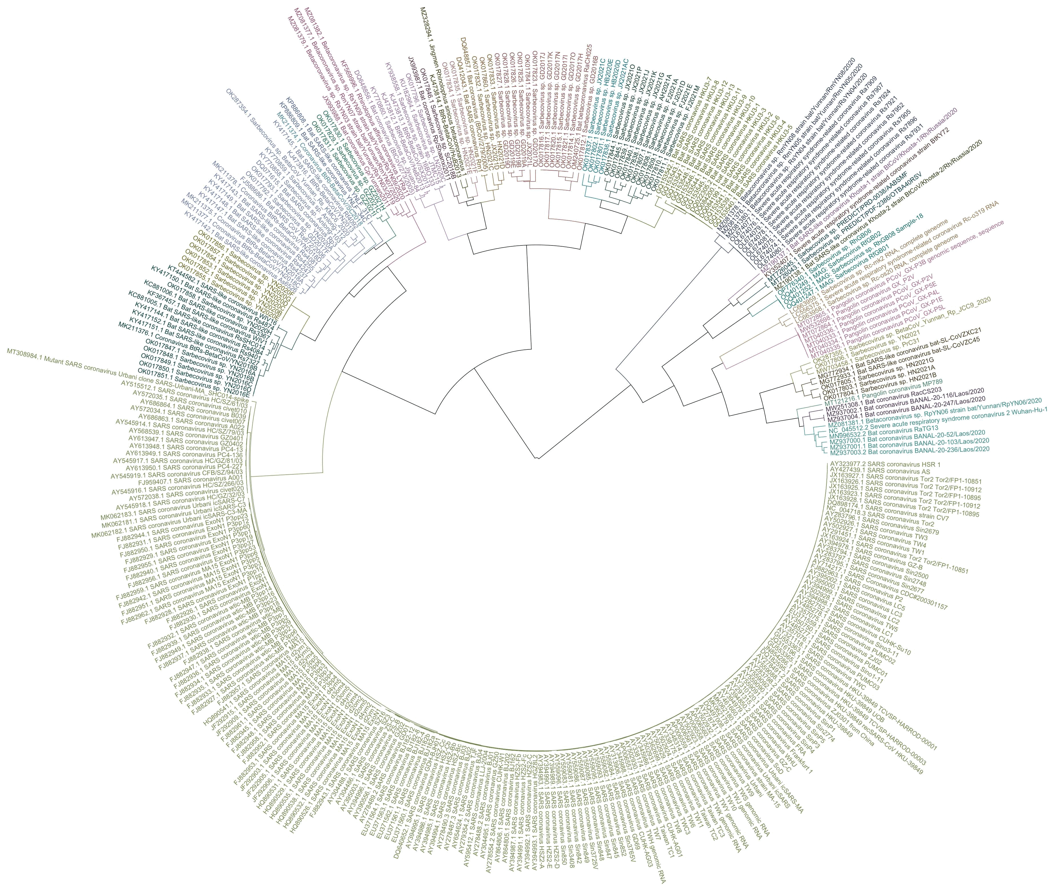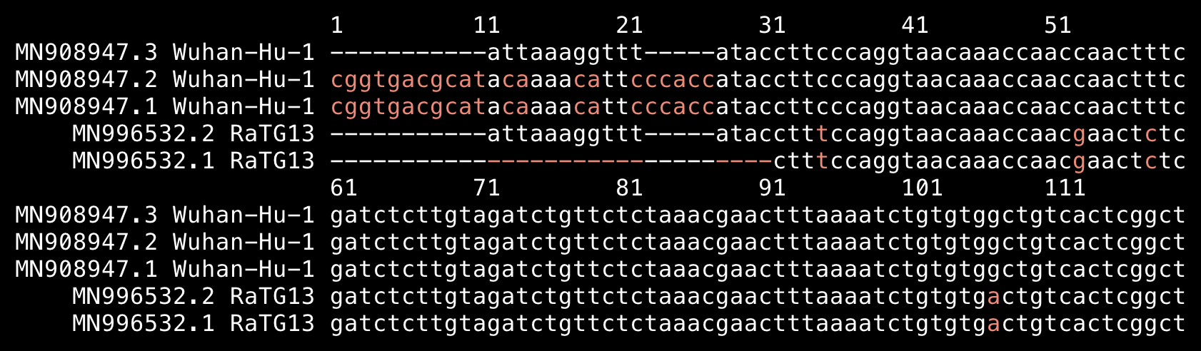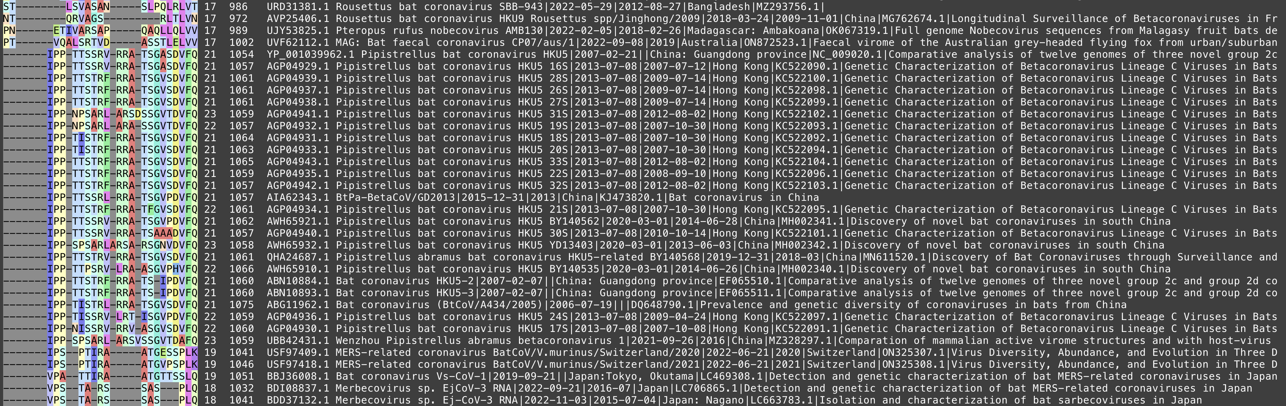 You can next repeat the same procedure for other SARS-like sequences, like SARS1 (NC_004718), a Kenyan bat virus BtKY72 (KY352407), a bat virus which is about 4000 nucleotide changes away from SARS1 (DQ648856), a bat virus which is about 100 nucleotide changes away from SARS1 (OK017854), and so on. Then you can concatenate all of the files you downloaded, remove duplicates, exclude partial sequences and monopartite sequences, and add the reference genome of SARS2. And then you can align the sequences with MAFFT: