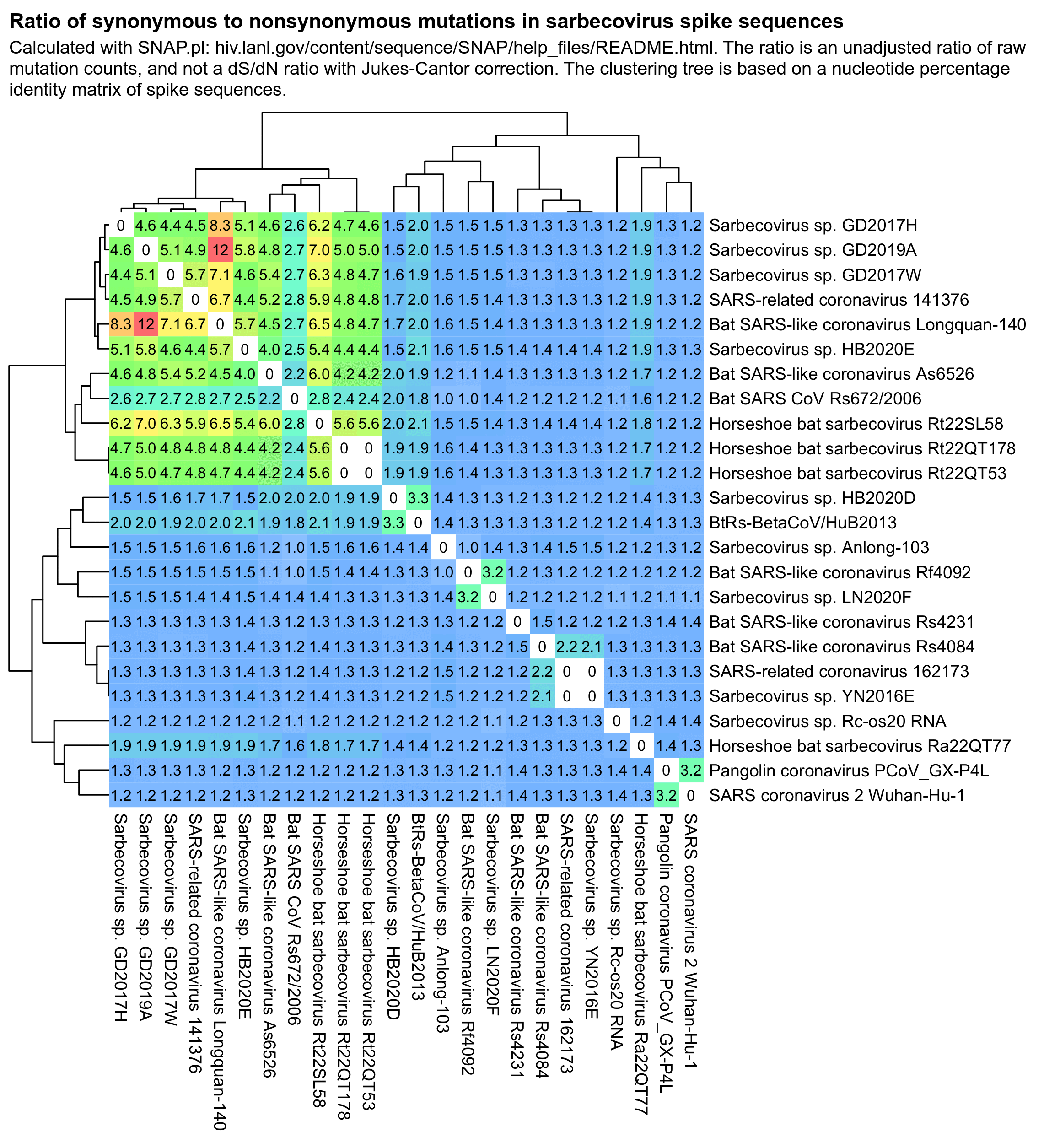 tit="Ratio of synonymous to nonsynonymous mutations in sarbecovirus spike sequences"
