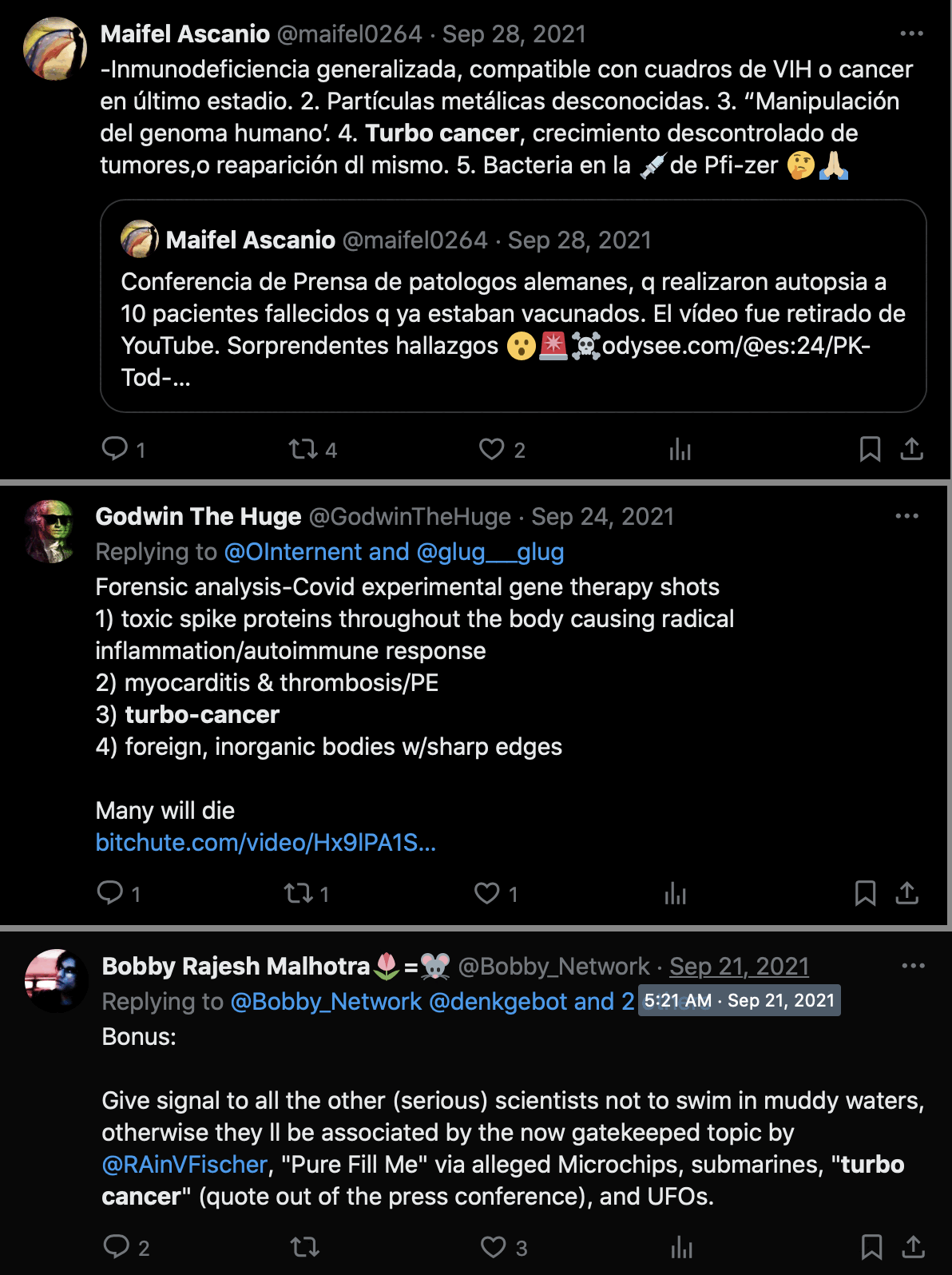 When I searched for the earliest tweets that matched the term "turbo cancer", many of the oldest tweets I found that connected the term to COVID vaccines referred to Burkhardt's pathology conference. The oldest tweet was posted a few hours after the conference by Bobby Rajesh Malhotra, who has done a lot of research exposing Füllmich as controlled opposition: [https://x.com/search?q=%22turbo%20cancer%22%20until%3A2021-11-1&f=live]