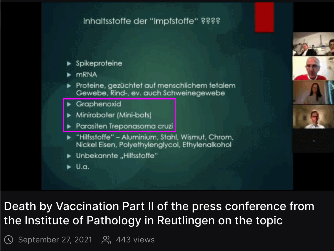 At time 8:27 Alex Bolland said this in the English dub: "If we look at the content of the vaccines, of course the spike proteins, mRNA, and graphene oxide - I've seen pictures of that, of groups, of people from Spain - I don't question this, whatever. I'm happy to be called - what do we say - what do you call them - conspiracy theorists, yes. I have also indications that there's mini-robots in the blood. The earliest time I heard of this was in 95 in a presentation from someone who was an expert. So I would say the people who are into this vaccination are 30 years ahead. Thousands of scientists must have worked on this." A bullet point in his slides seemed to also suggest that vaccines contained a parasite called Treponasoma cruzi, even though he didn't discuss the bullet point in his presentation: