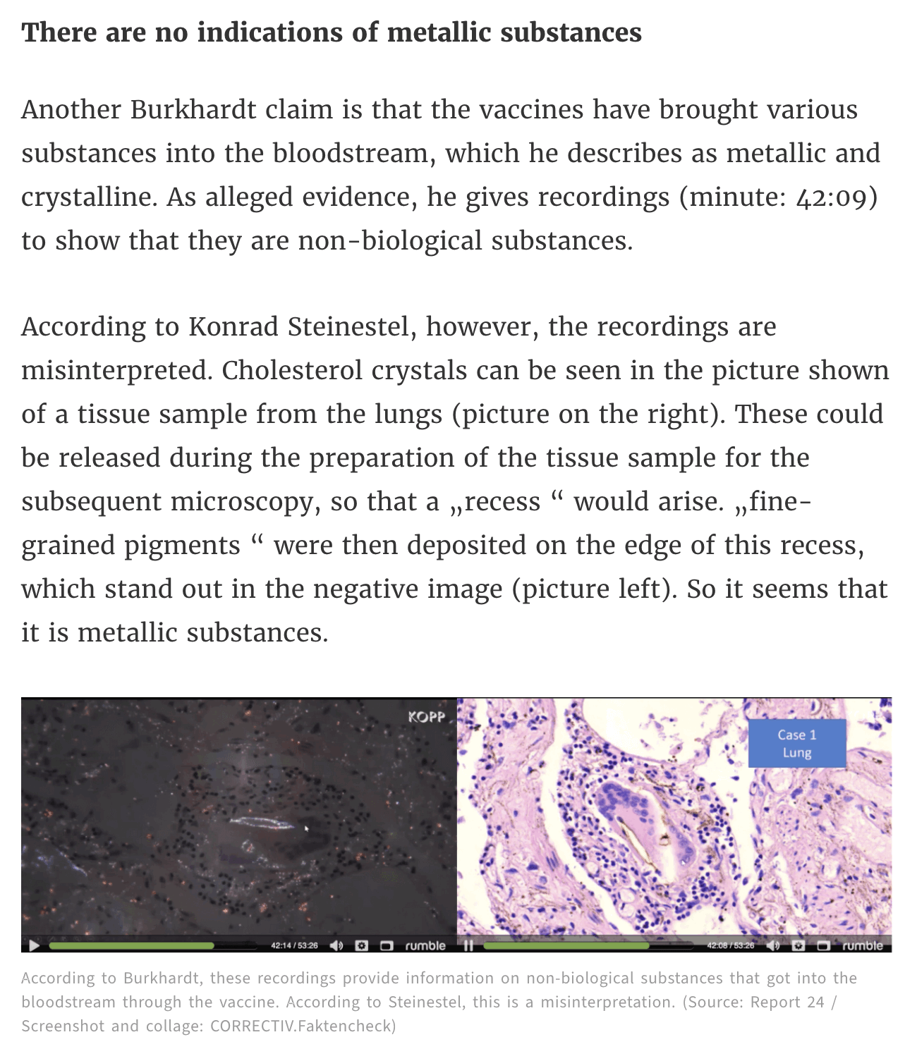 However Burkhardt also claimed that the tissue samples he analyzed contained metallic structures, but they may have in fact been cholesterol: [https://correctiv.org/faktencheck/2022/01/14/nein-diese-bilder-von-gewebeuntersuchungen-beweisen-nicht-dass-covid-19-impfungen-toedlich-sind/]