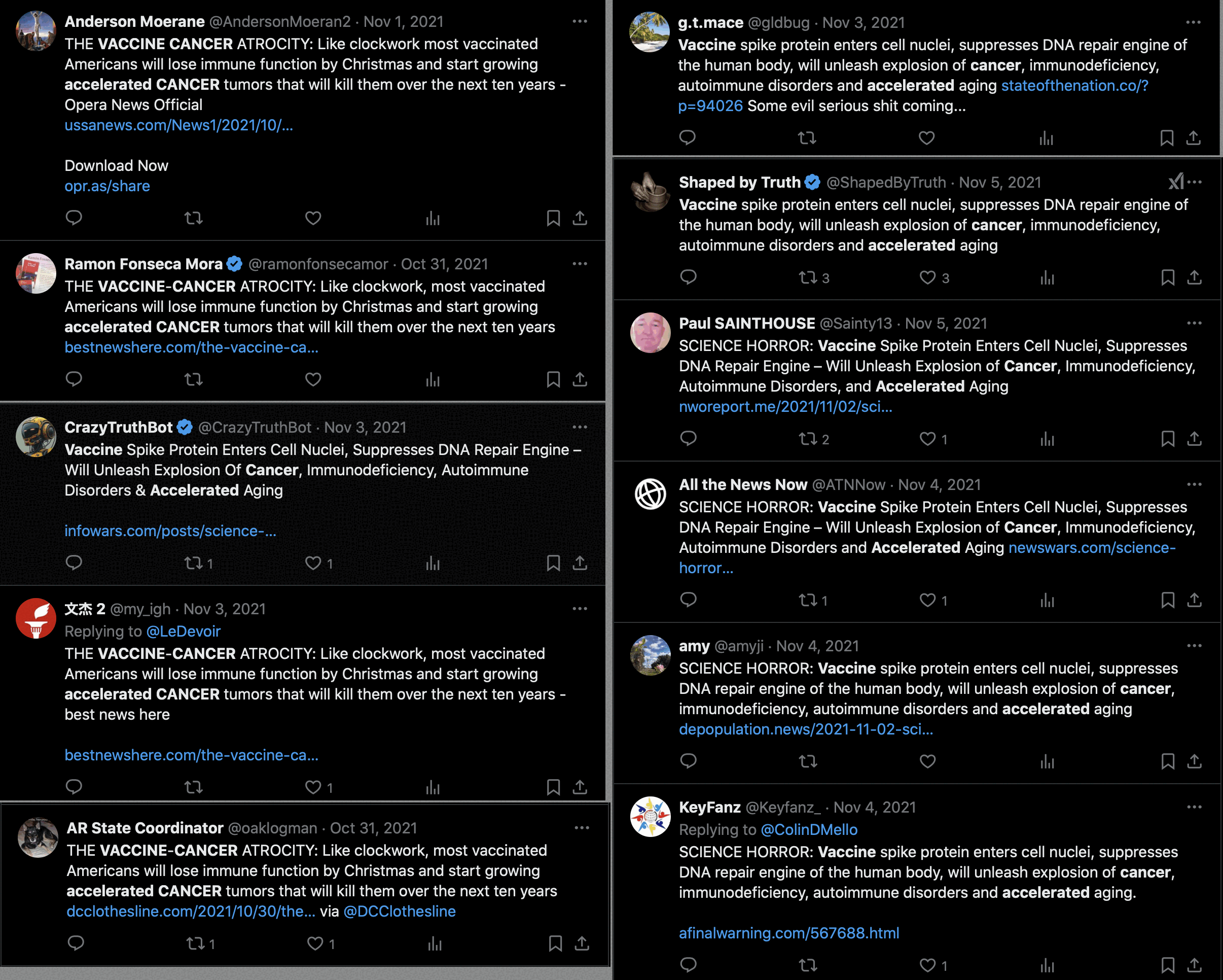 Some of the very earliest tweets about turbo cancer were posted by accounts that promote Miles Guo, which are likely bots: