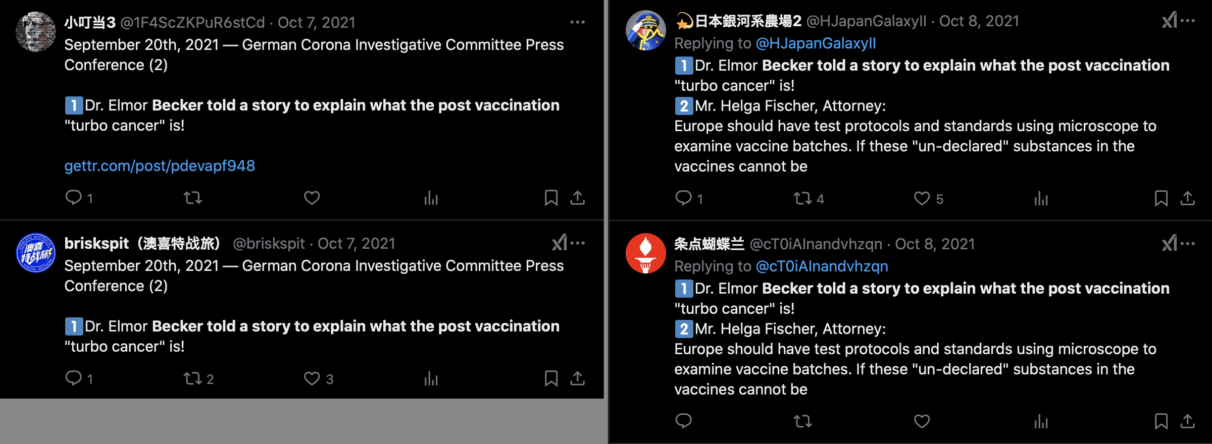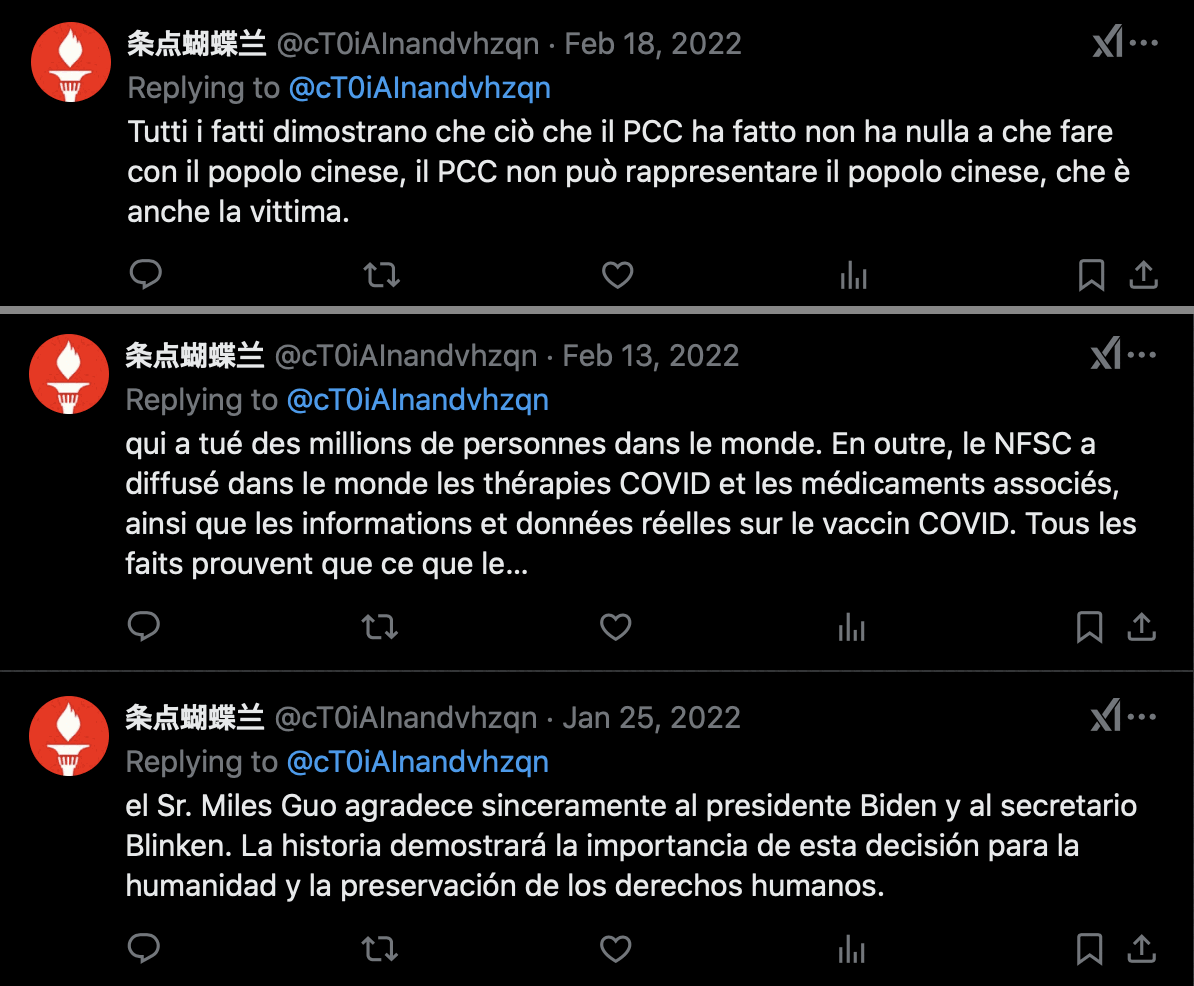 One reason why many of the accounts that promote Miles Guo seem like bots is that they post tweets in multiple different languages. For example the top right account in the screenshot above tweets in a mixture of Chinese, Japanese, and English. [https://x.com/HJapanGalaxyII]