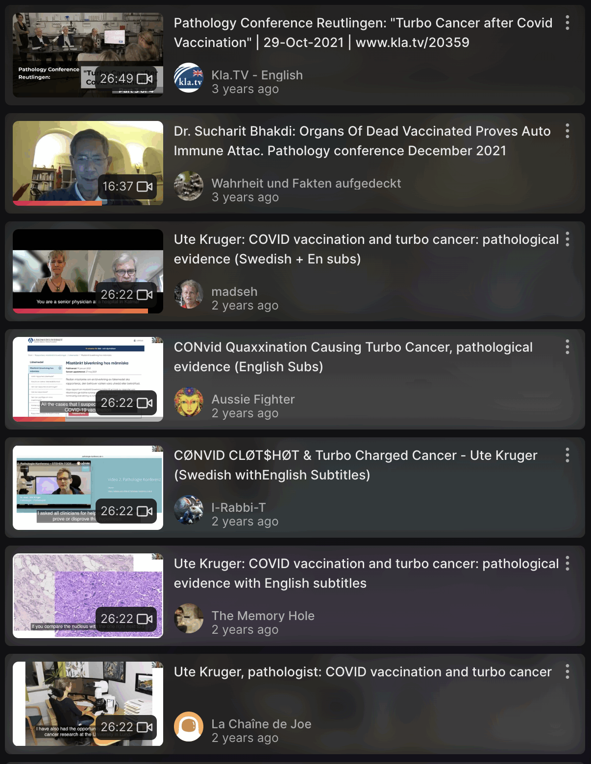 At Odysee the oldest result for the search term "turbo cancer" was a video of Burkhardt's pathology conference that was posted by KLA.tv in October 2021. The second-oldest video was a presentation by Sucharit Bhakdi from Burkhardt's second pathology conference which was held in December 2021. The next five results were videos of the German pathologist Ute Krüger: [https://odysee.com/$/search?q=%22turbo%20cancer%22]