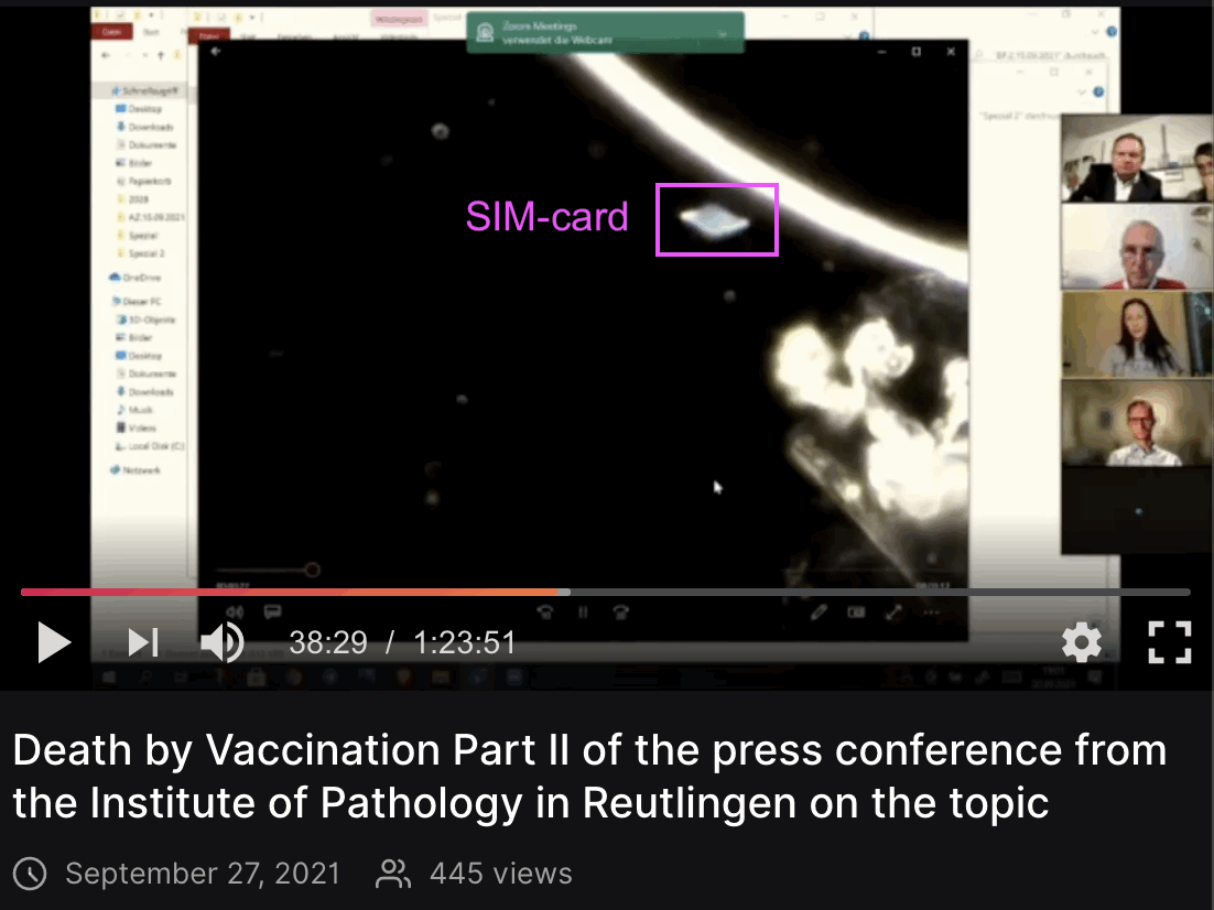 Next Uta Langer showed the image below and said in German "in a different batch of BioNTech we find this, which looks like - well, could be a chip":