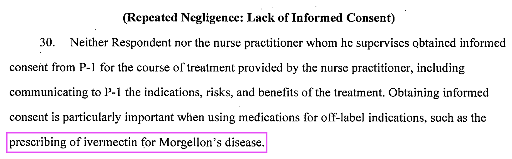 In 2019 the California Medical Board issued a complaint against Raphael Stricker, which said that Stricker had prescribed ivermectin as a treatment for Morgellons disease without obtaining informed consent: [https://lymescience.org/rogues/Raphael-Stricker/Raphael-Stricker-accusation-2019.pdf]