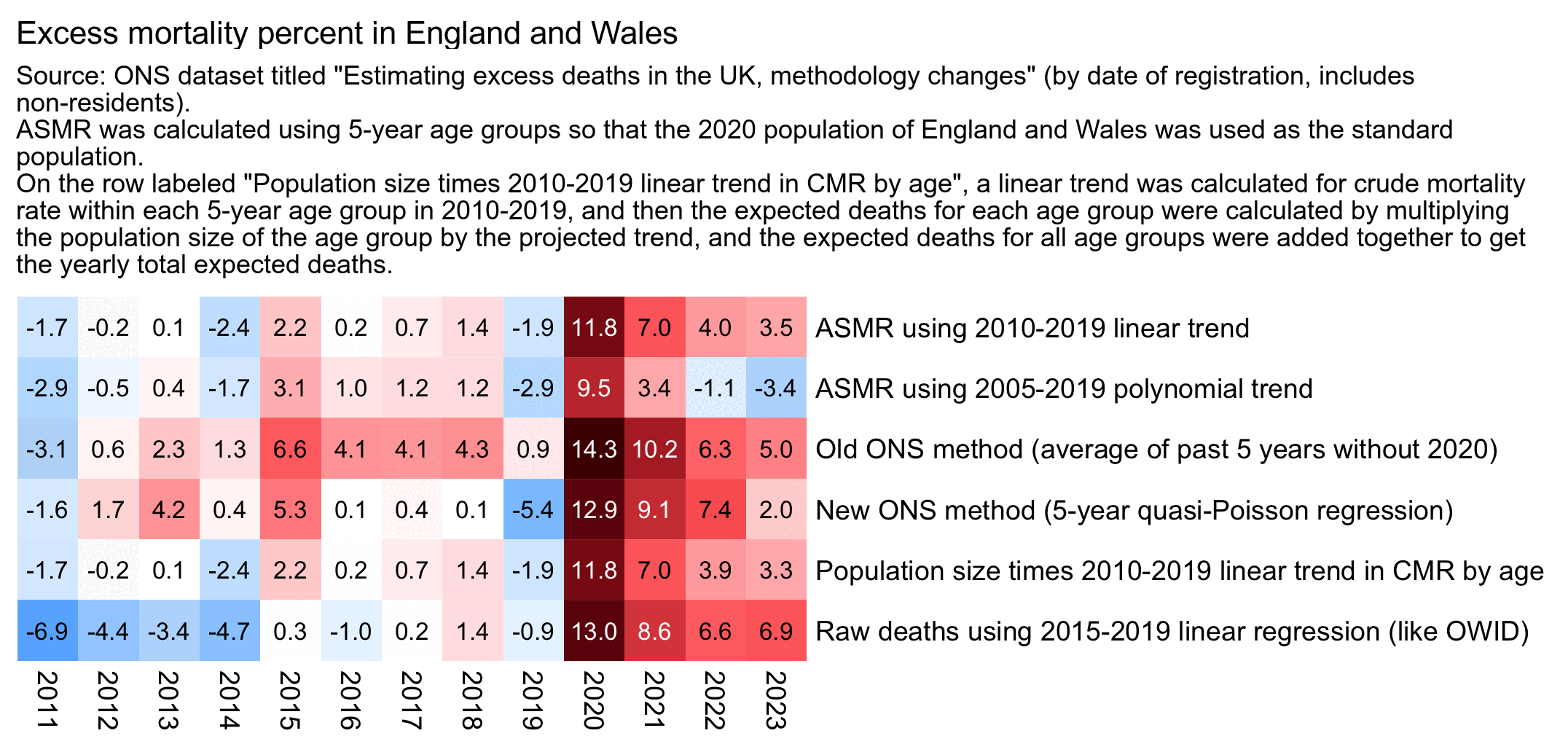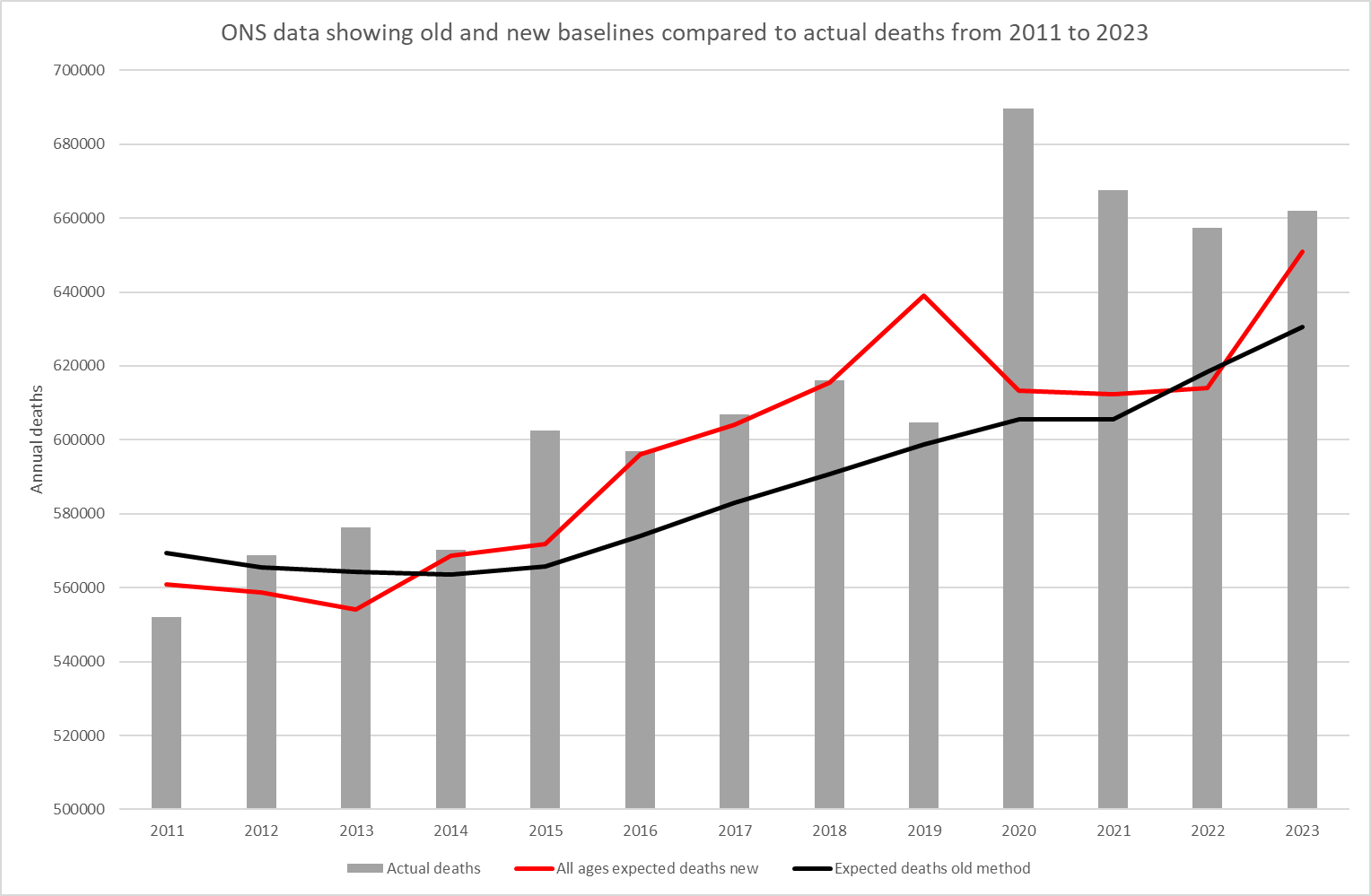 In February 2024 the UK ONS announced that they had changed the methodology they used to calculate excess mortality. [https://www.ons.gov.uk/peoplepopulationandcommunity/healthandsocialcare/causesofdeath/articles/estimatingexcessdeathsintheukmethodologychanges/february2024]