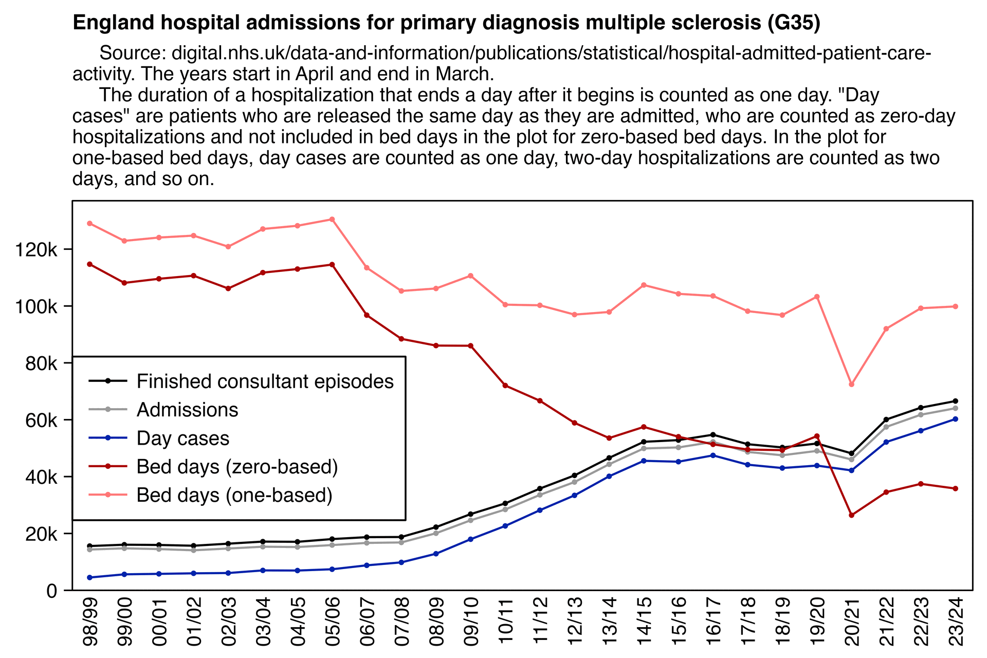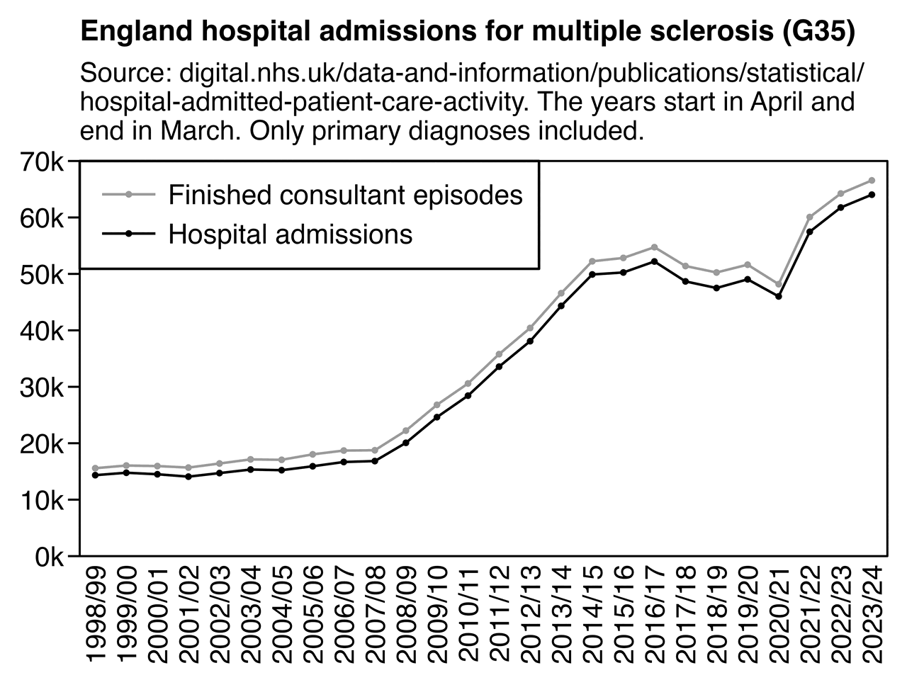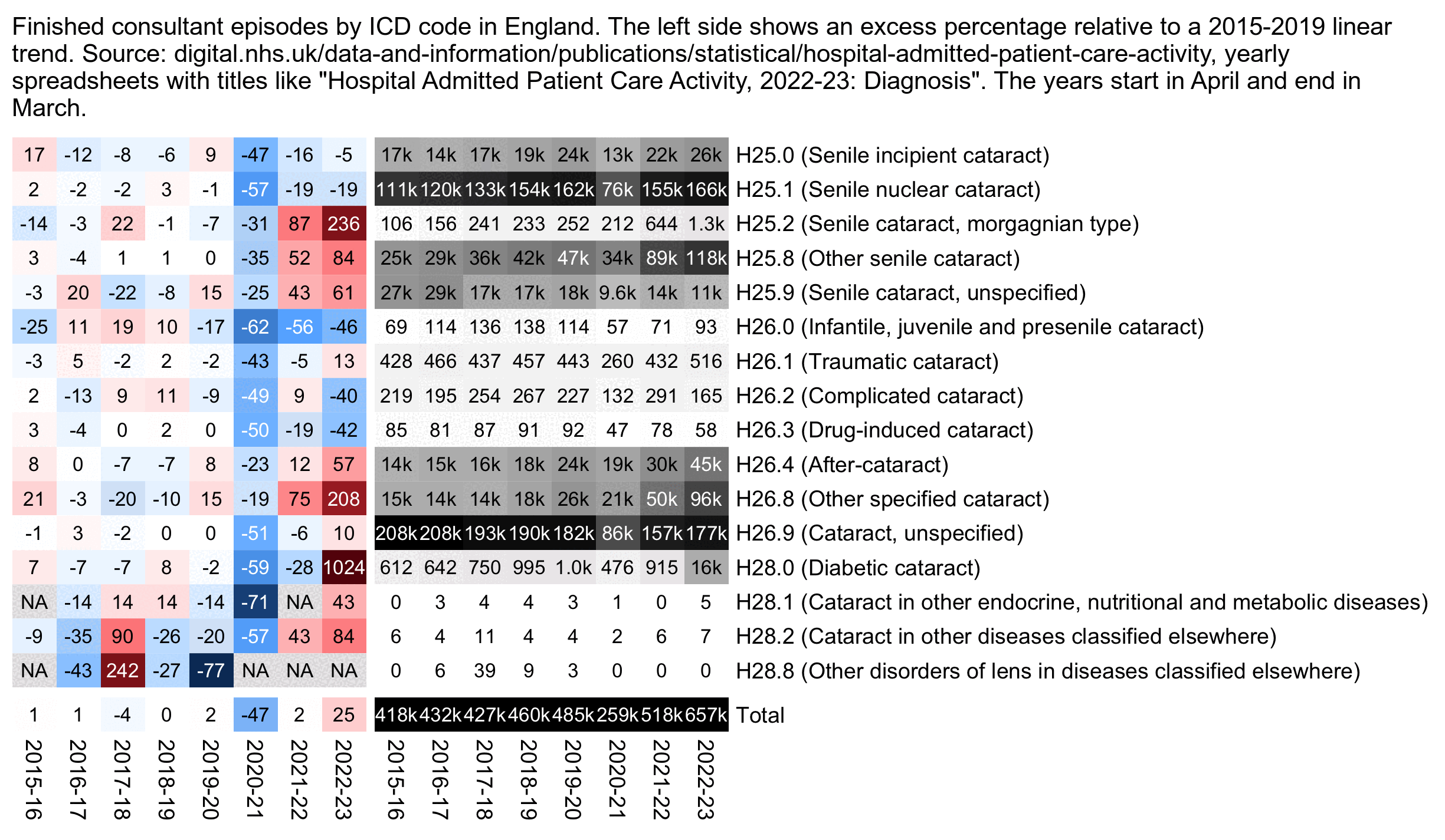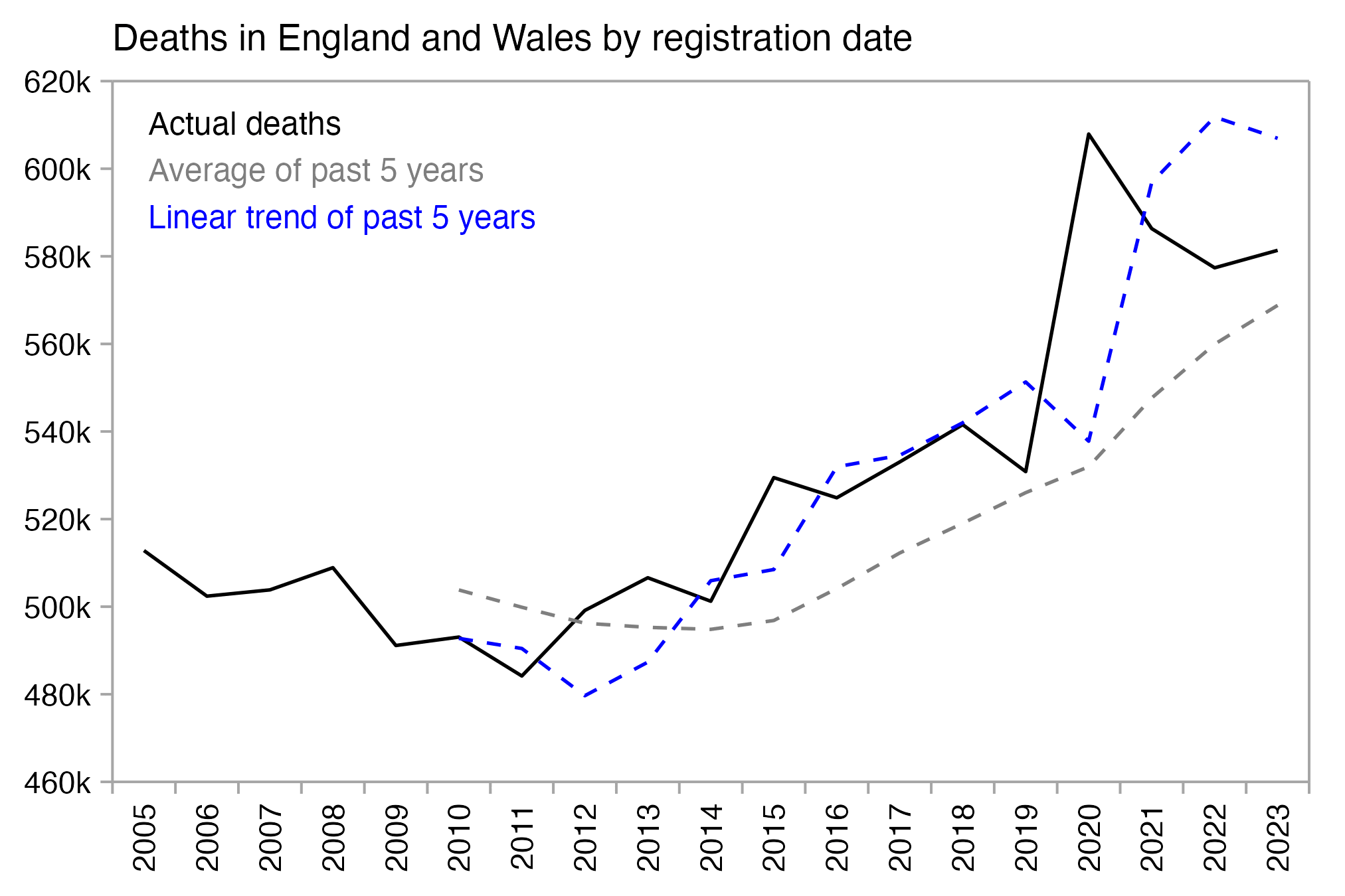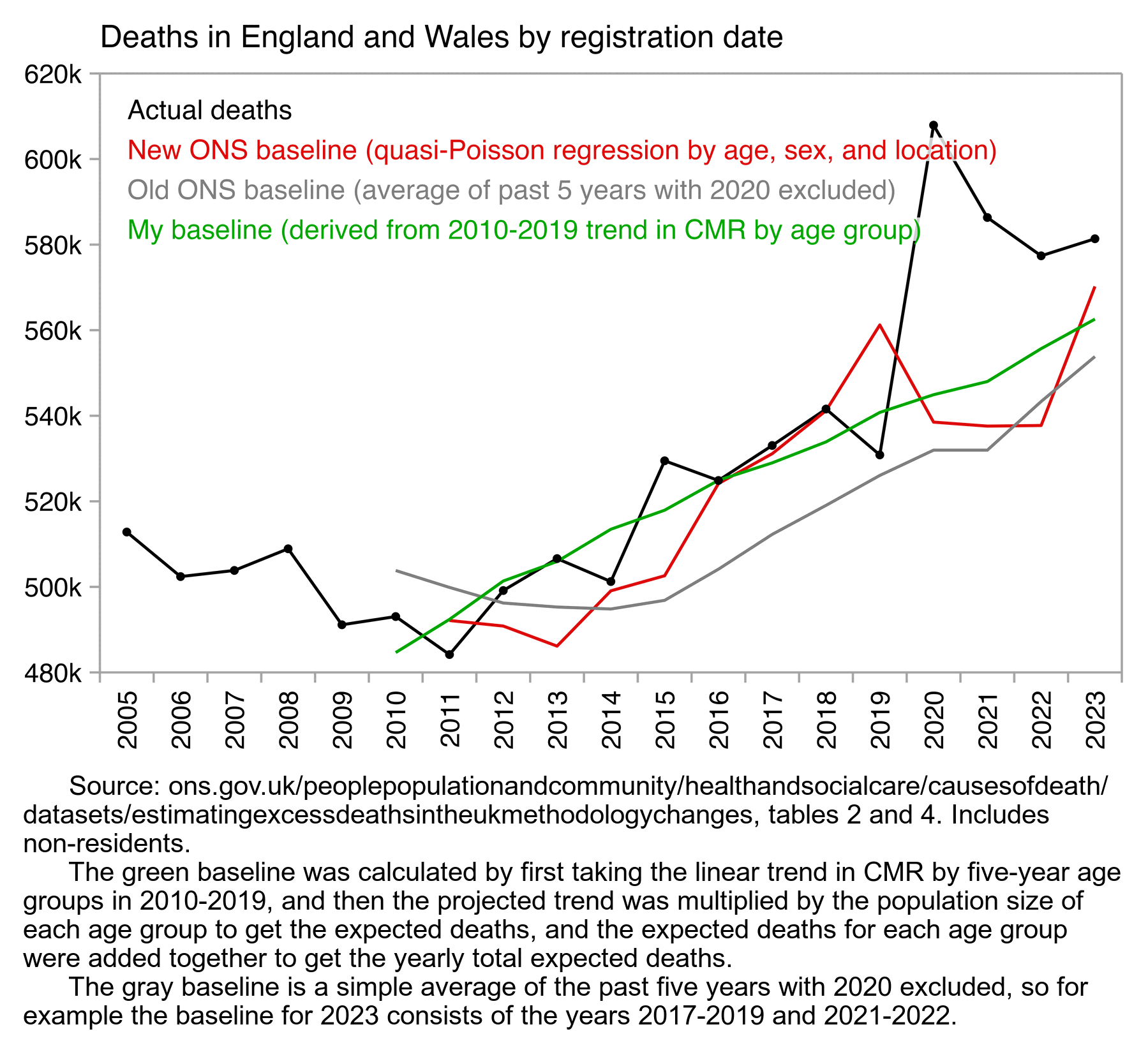 The ONS article about the new baseline methodology was accompanied by a spreadsheet which shows monthly and weekly deaths in the years 2005 to 2023 by age, region, and sex. In the code below I calculated the yearly sum of deaths in England and Wales based on Table 2 of the spreadsheet. When I used the average of the five previous years as the baseline for each year, there was a total of 68,840 excess deaths in 2016 to 2019. But when I used a linear trend of the five previous years as the baseline for each year, there's a total of -29,476 excess deaths in 2016 to 2019 instead. So difference is about 100,000 deaths, which is similar to the difference between the new and old ONS method that was mentioned by Craig: