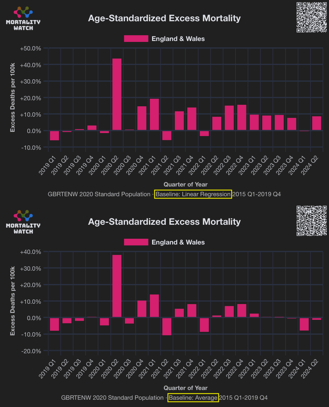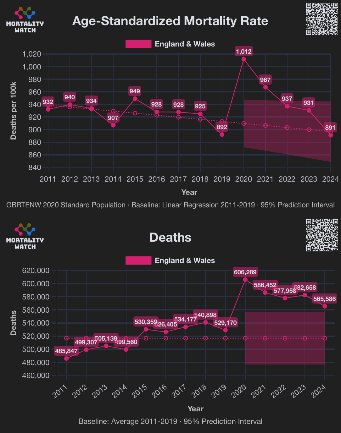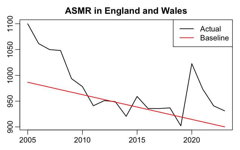 At Mortality Watch, England and Wales gets negative excess ASMR in 2024 is you use a 2011-2019 linear baseline: [https://mortality.watch/explorer/?c=GBRTENW&t=asmr&df=2011&bm=lin_reg]