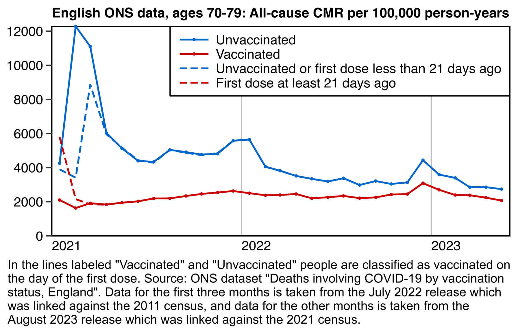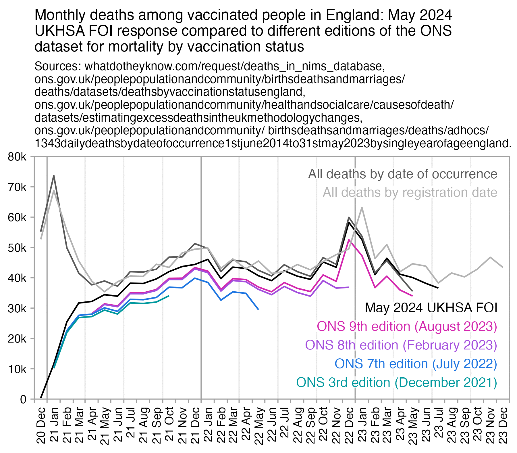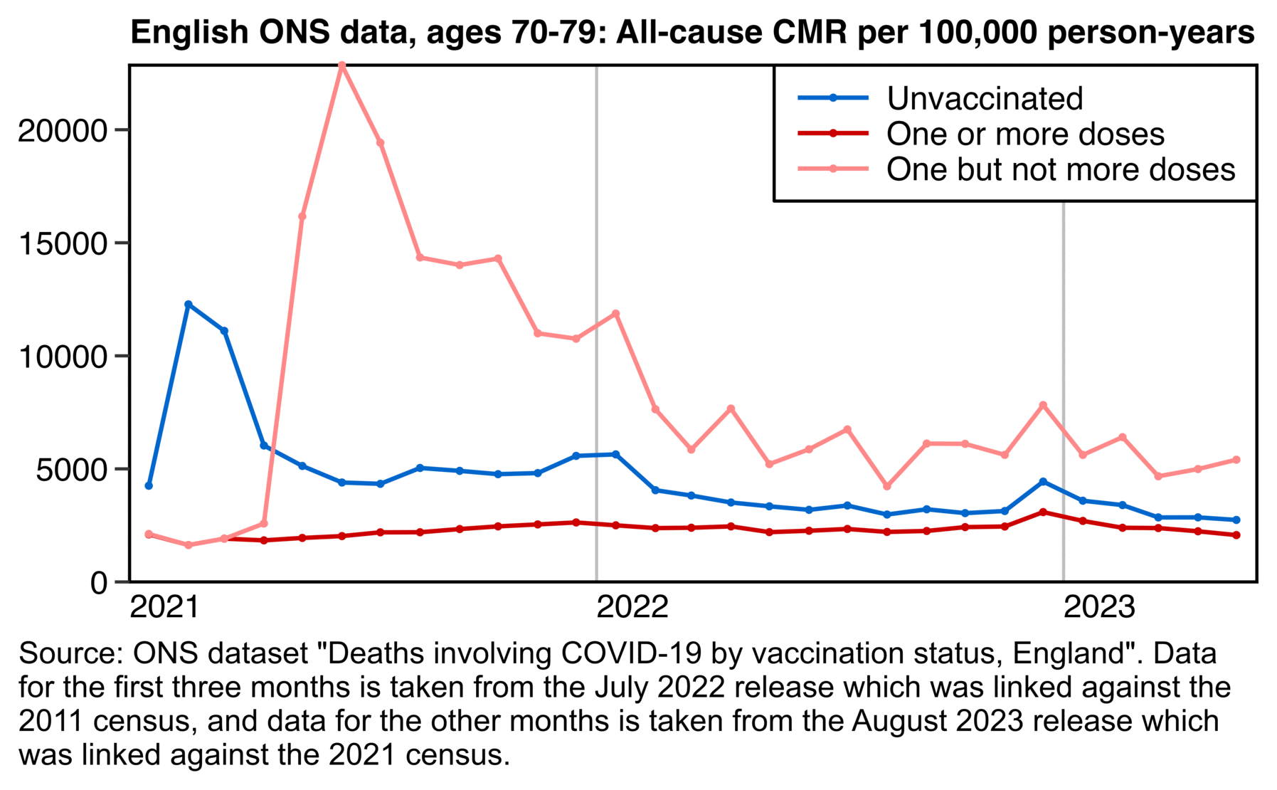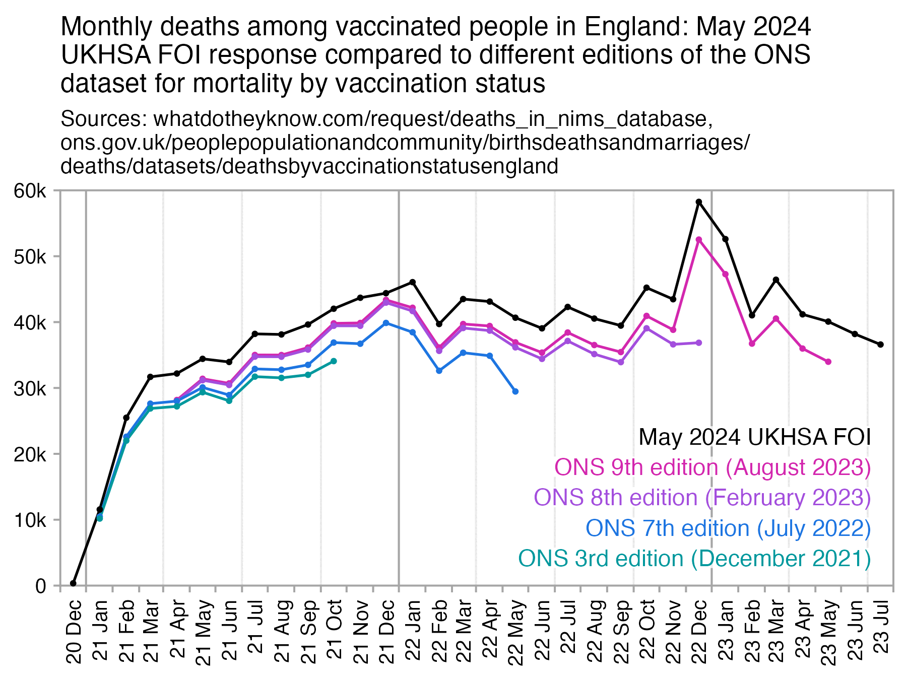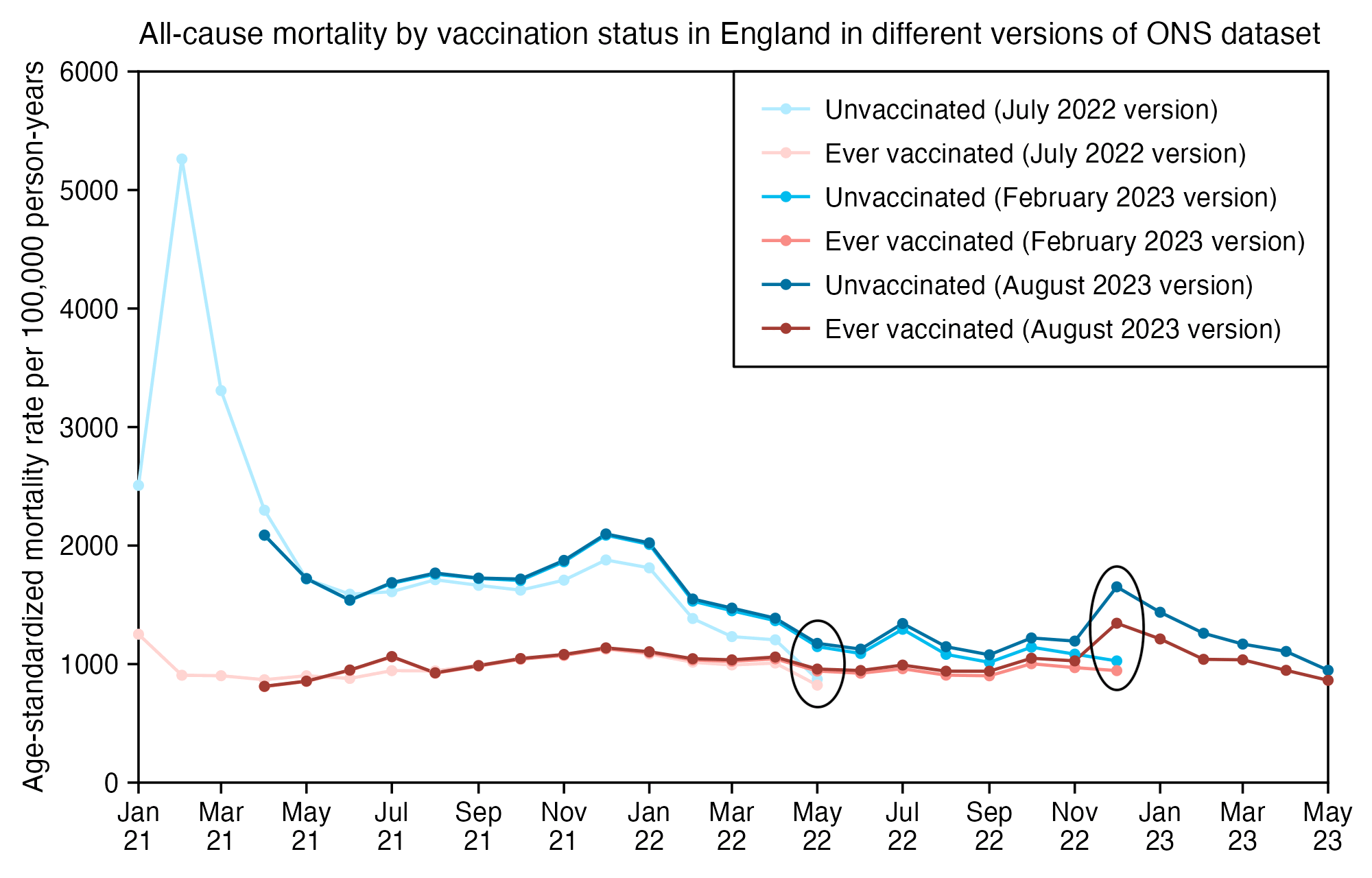 The 9th and final version of the ONS dataset for deaths by vaccination status was published in August 2023. It included data up to May 2023, but the reason why June and July were excluded from the release was probably because they were still missing too many deaths because of a registration delay. In May it looked like the trend was that the unvaccinated ASMR was soon about to cross below the ever vaccinated ASMR: [https://x.com/mothrfunkr/status/1774625071140893040]