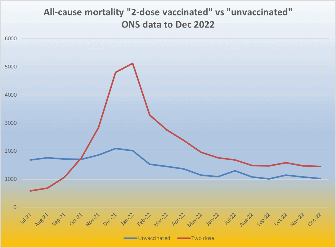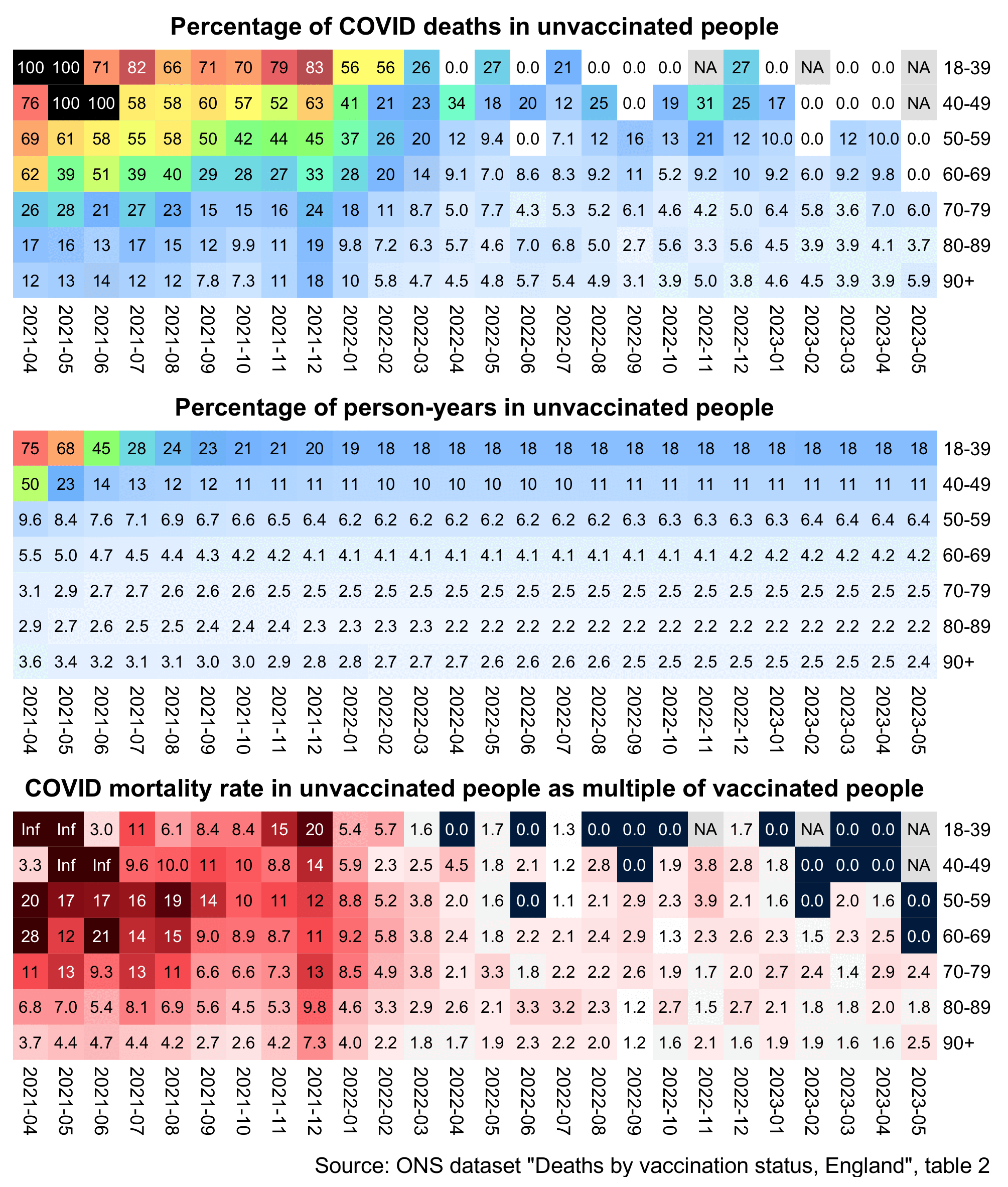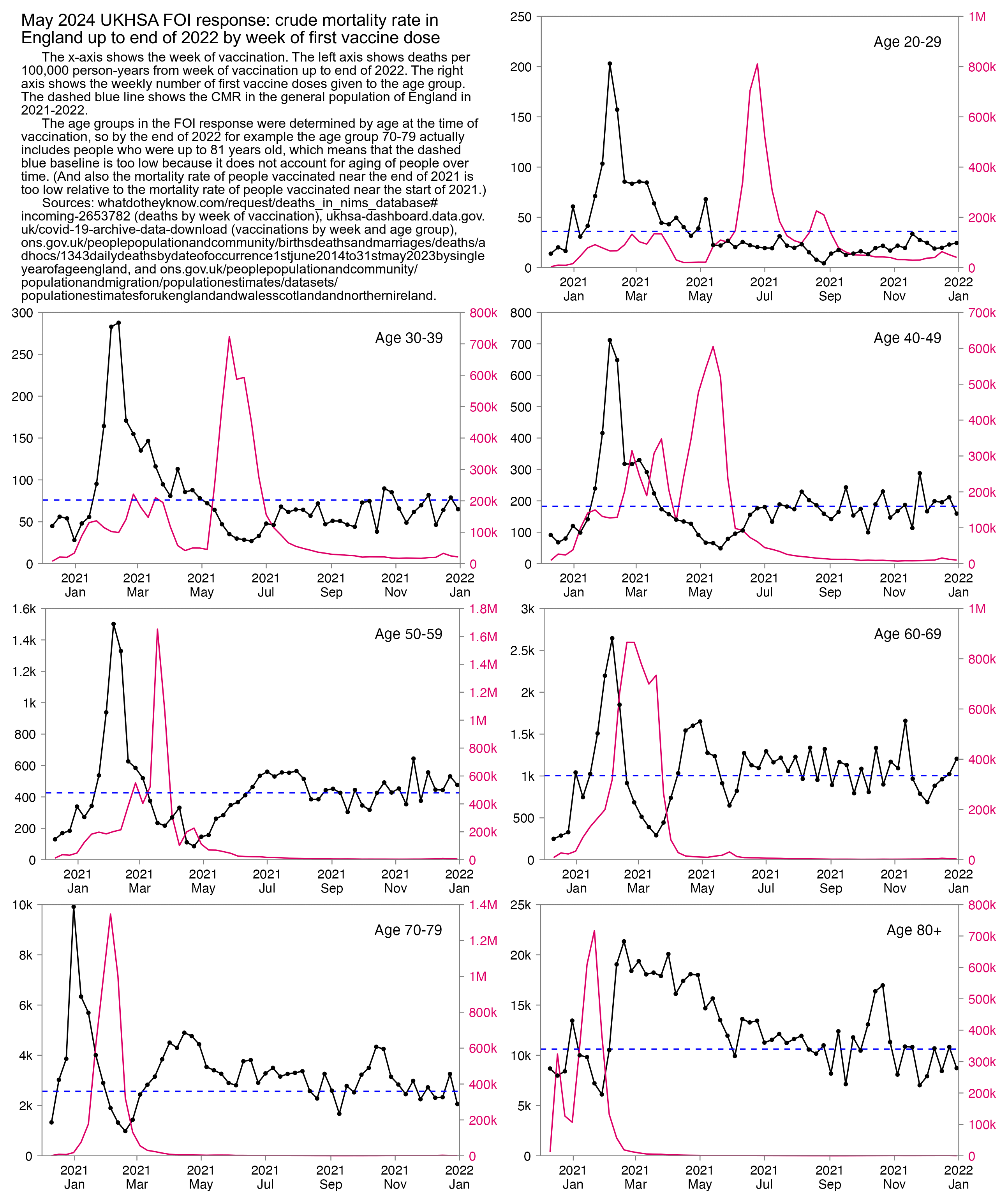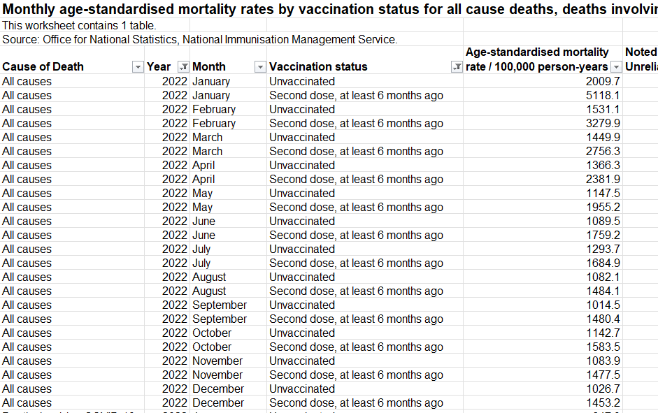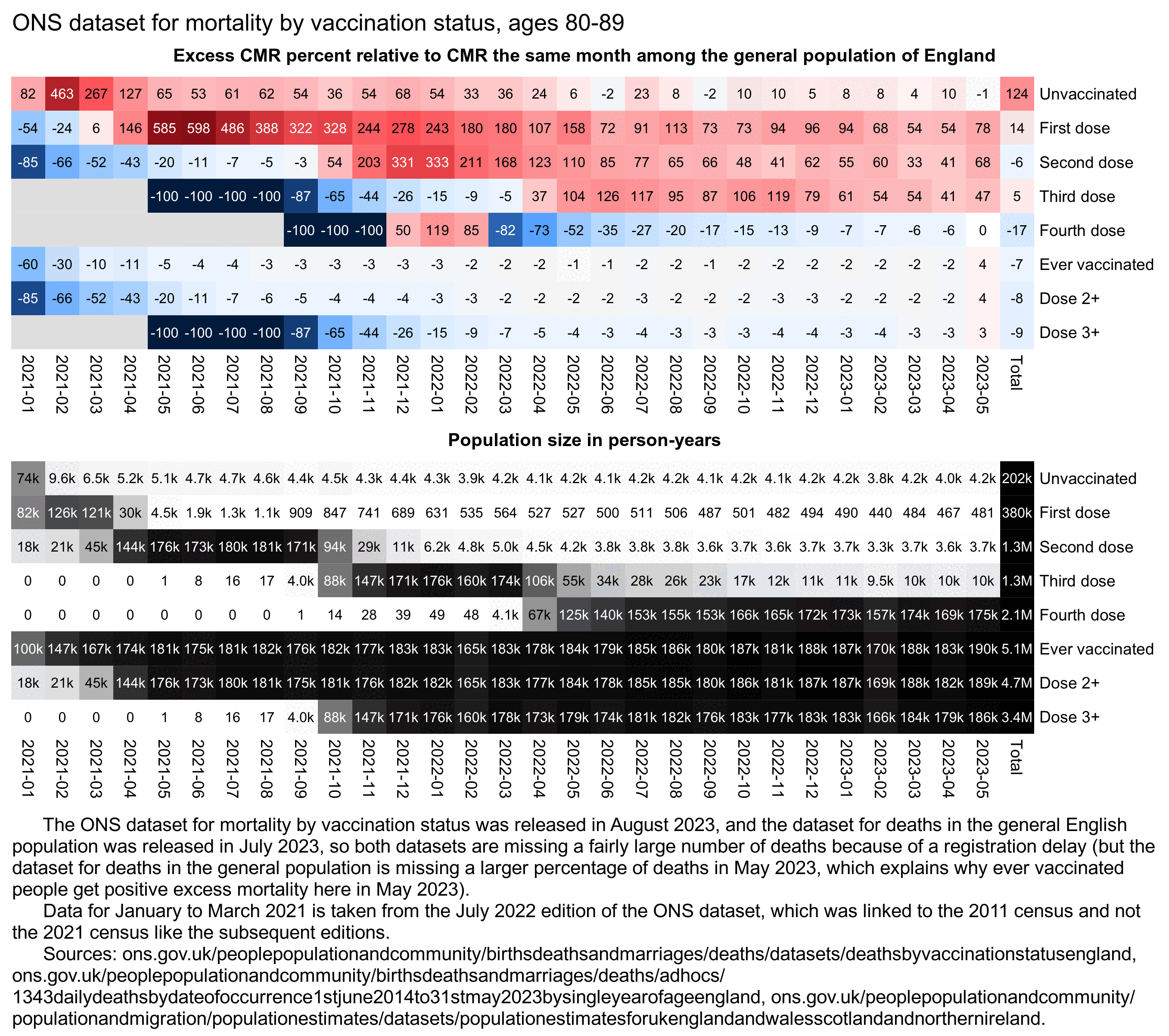 The 9th and final version of the ONS dataset for deaths by vaccination status was published in August 2023. It included data up to May 2023, but the reason why June and July were excluded from the release was probably because they were still missing too many deaths because of a registration delay. In May it looked like the trend was that the unvaccinated ASMR was soon about to cross below the ever vaccinated ASMR: [https://x.com/mothrfunkr/status/1774625071140893040]