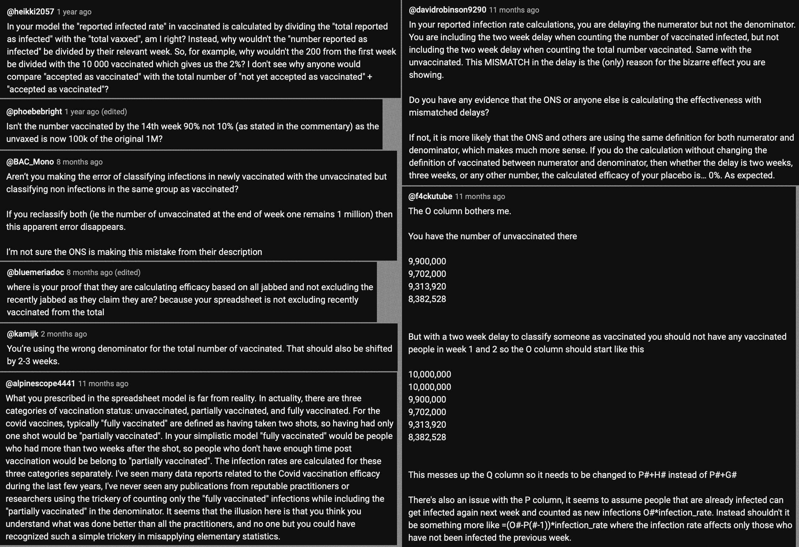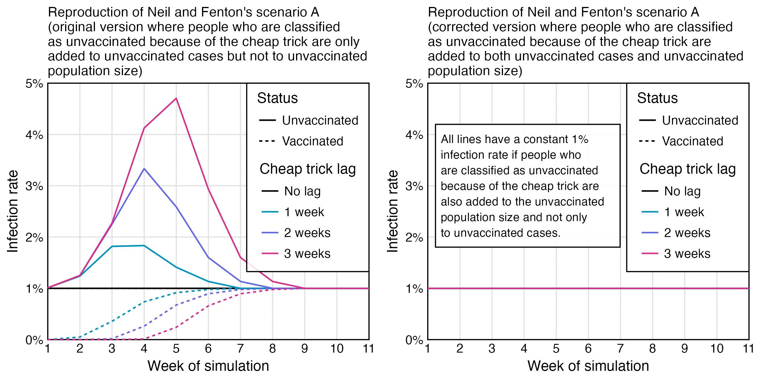 Added in February 2025: Neil and Fenton now wrote that when they tried to submit their cheap trick paper to a journal, it didn't pass peer review. [https://wherearethenumbers.substack.com/p/dirty-deeds-done-dirt-cheap] They published a list of comments written by one of their reviewers, who didn't seem to initially understand that the classification delay was only applied to the numerator in the simulations, because the reviewer wrote: "Can you explain why in Figure 1, Panel A, the infection rate would increase for the unvaccinated in week 2? The unvaccinated group is composed of vaccinated people and unvaccinated people because of the delay but both groups have been assigned an infection rate of 1% right? And why is the rate for the unvaccinated group consistent across time regardless of the amount of delay used?" The reviewer also wrote: "Do you have a citation for the statement that miscategorisation selection biases inevitably exaggerate vaccine efficacy? I would expect nondifferential exposure misclassification to move the effect estimate towards the null while differential exposure misclassification could bias the estimate in any direction. See Rothman, page 137." Like me, the reviewer also pointed out that the methodology of the simulations was not described in a detailed enough way: "I'd like more information on the simulation methods. For example, how are you calculating vaccine effectiveness? And how do you treat the infected population - do they recover, are they eligible for reinfection?" Then Neil and Fenton wrote that they added a supplementary file to their paper which described the methodology of their simulations more clearly, so now the same reviewer wrote: