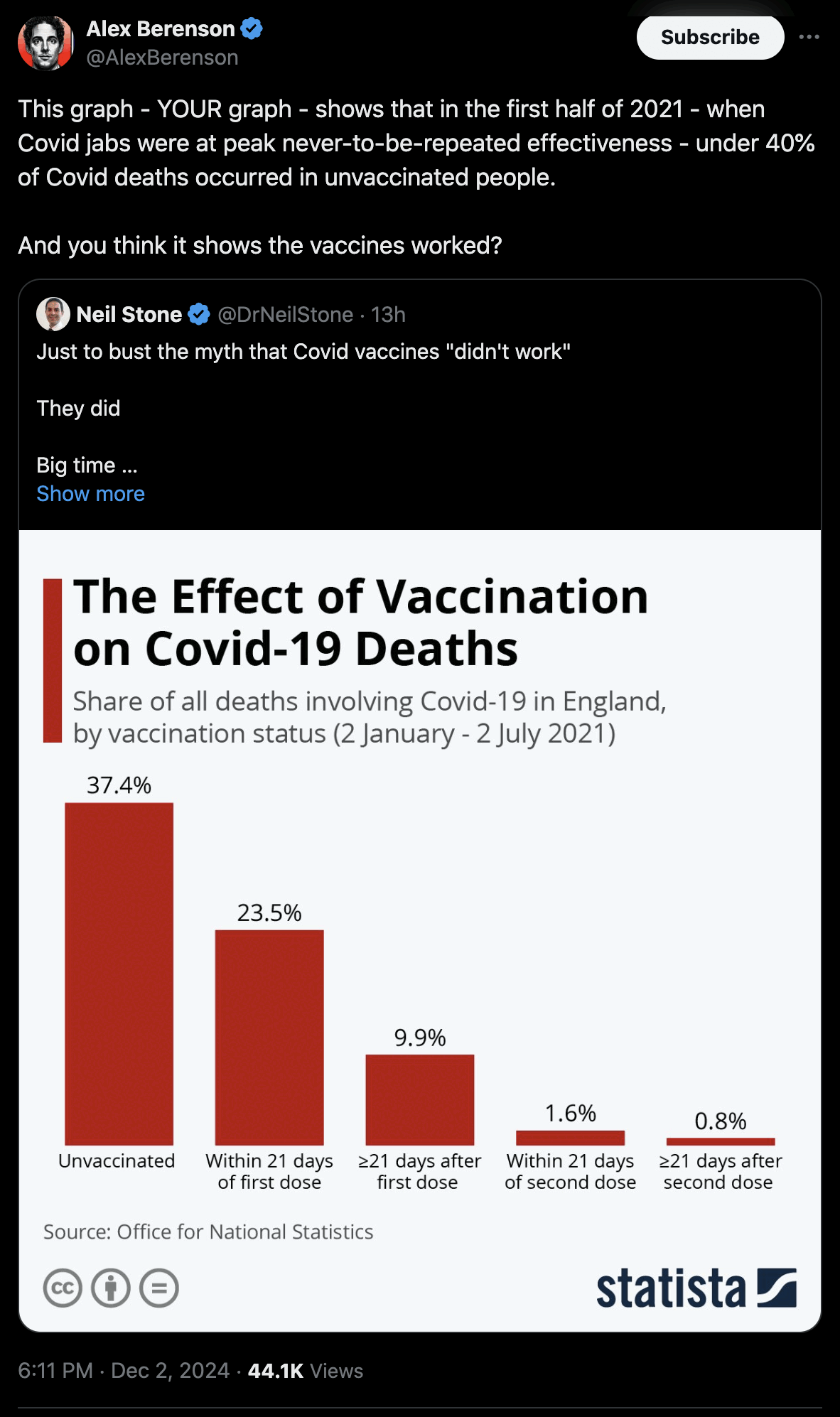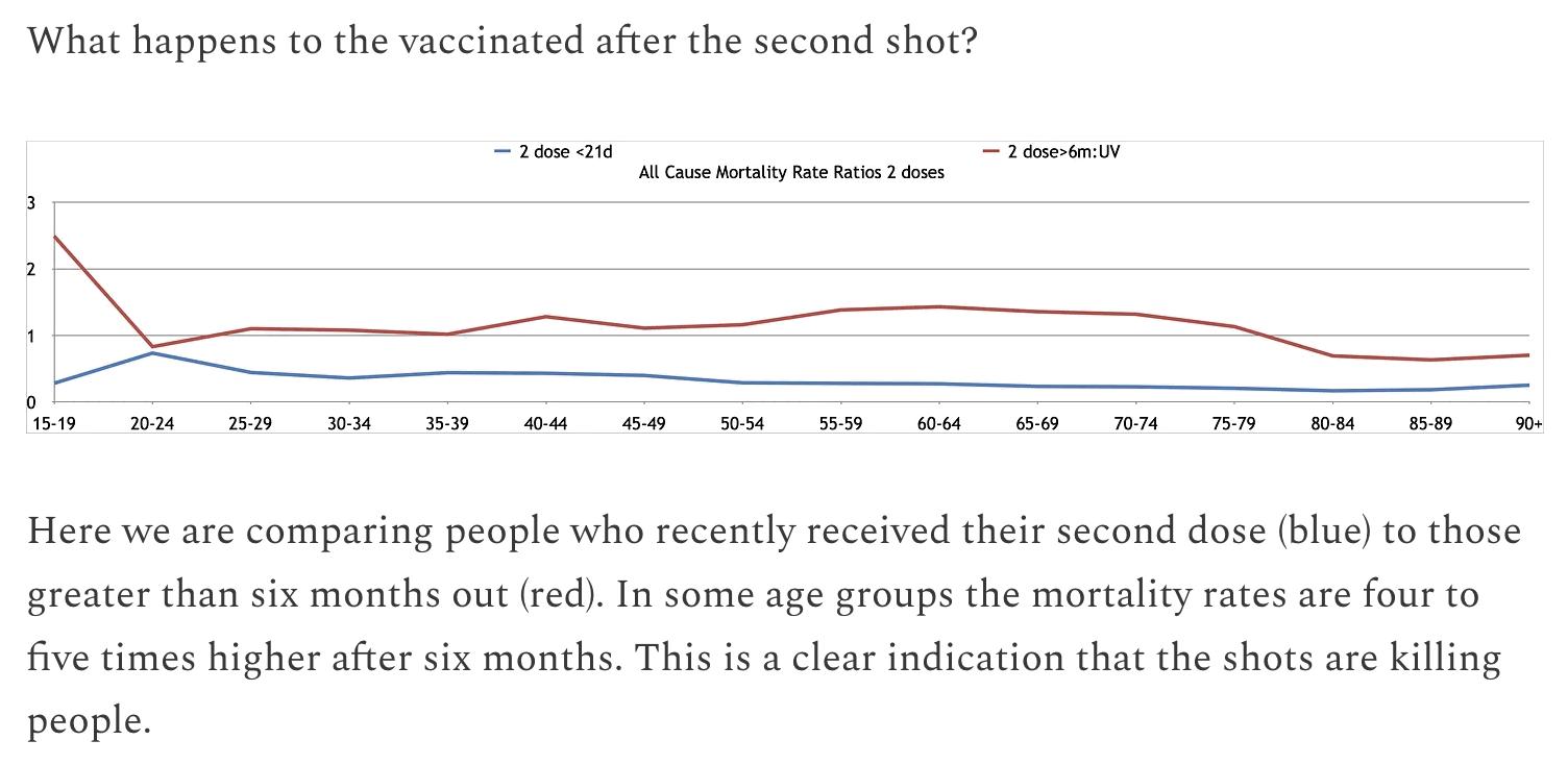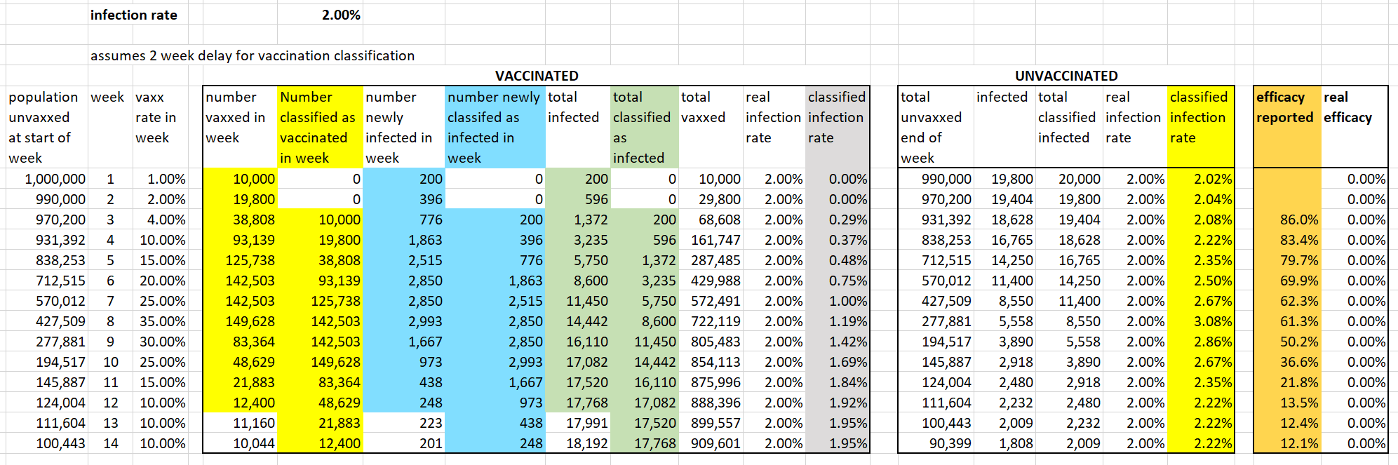Neil and Fenton failed to cite any actual study which would've worked like their simulation, but they responded to the Substack comments by adding this note to their Substack post: "6 May 2023 Update: Quite a few people have asked why we are including those vaccinated within the last 21 days in the 'total vaccinated' denominator for the vaccinated infection rate if such people are classified as unvaccinated. The answer is that, while those infected within 21 days are classified as unvaccined in observational trials, those who are not infected are generally treated as vaccinated. In observational studies, which is what we are simulating here, there is no pre-defined vaccine and control group as there would be in a controlled trial. And, unlike a controlled trial, people are getting vaccinated at different times. Hence, everything is driven by looking at 'cases' i.e. those defined to have been infected in any given week; all those infected within 21 days of a vaccination are classified as unvaccinated. However, for the efficacy calculation at any time, for the 'denominators' they simply use the total number of people vaccinated so far (e.g. from NIMS) and for this, there is generally no '21 day delay'." However they didn't cite any source for their claim that there was generally no 21-day delay applied to the denominator.