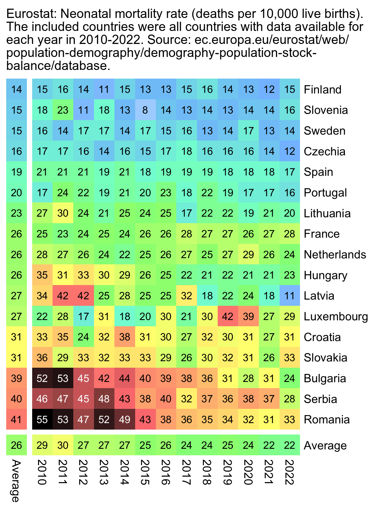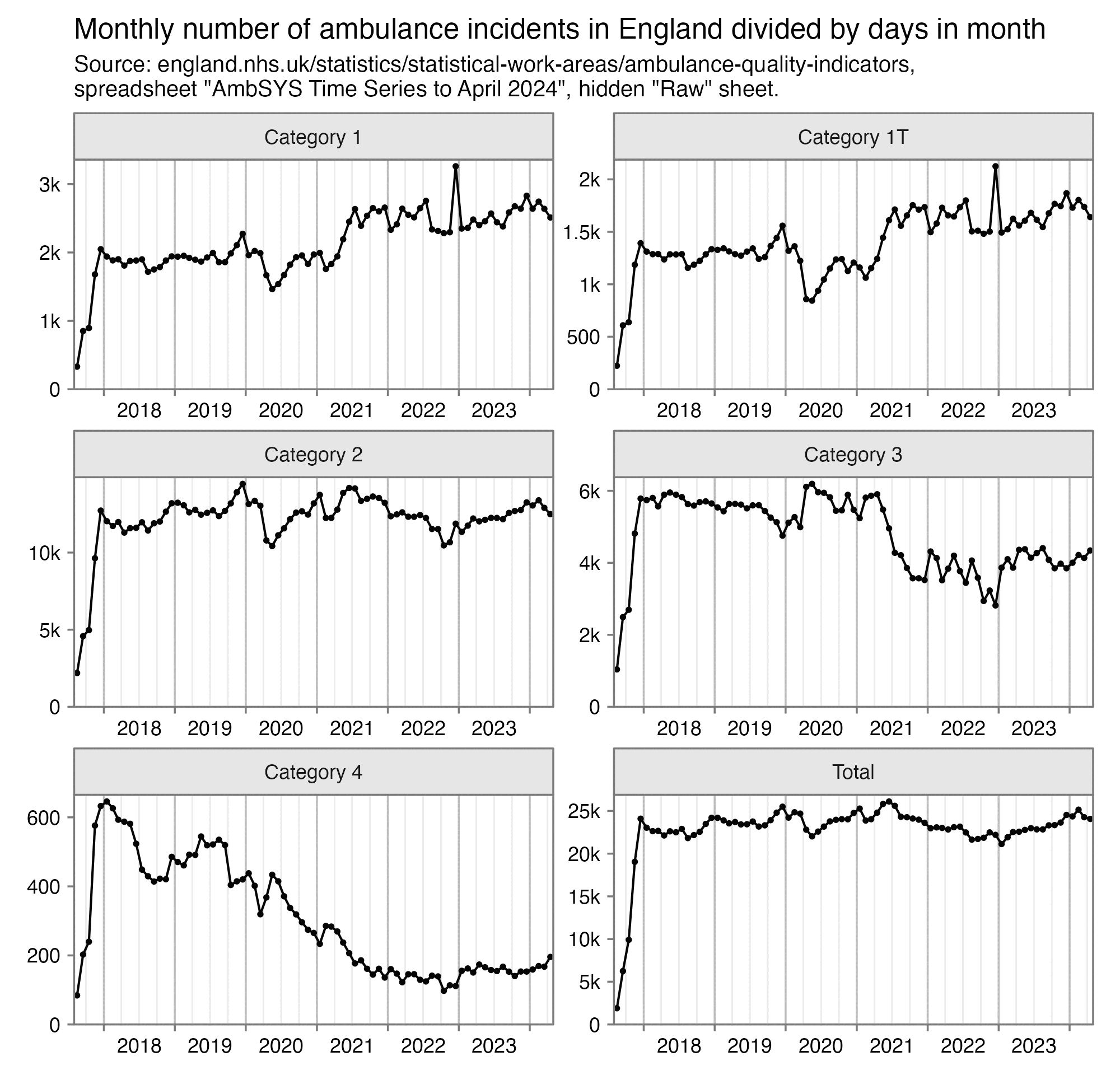 t=CJ(year=2013:2023) t$still=c(3286,3252,3032,3065,2840,2579,2399,2292,2473,2266,2128) t$born=c(778646,779059,779688,776978,757329,733166,714426,686712,696436,673625,658880) # stillbirths per thousand live births t[,rate:=still/born*1e3] # fit linear trend to stillbirth rate in 2016-2019 t$base=predict(lm(rate~year,t[year%in%2016:2019]),t) # standard deviation of actual minus baseline rate in 2016-2019 sd=t[year%in%2016:2019,sd(rate-base)] # excess stillbirth rate in 2015 as a z-score t[year==2015,(rate-base)/sd] # -14.42161 (-14 sigma impossible black swan event!)