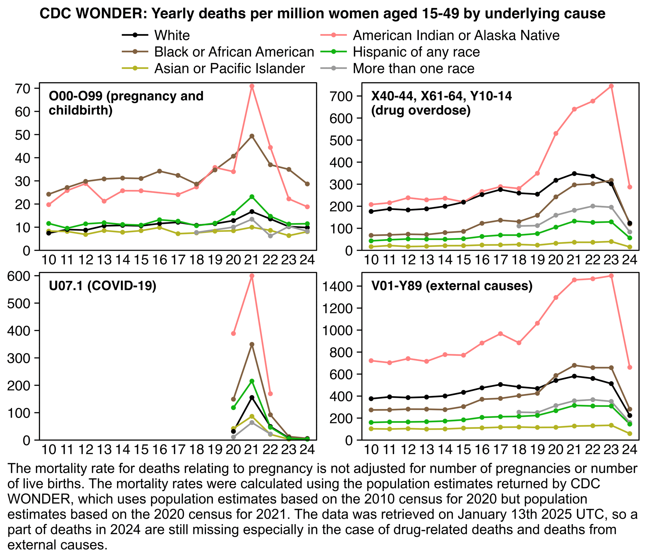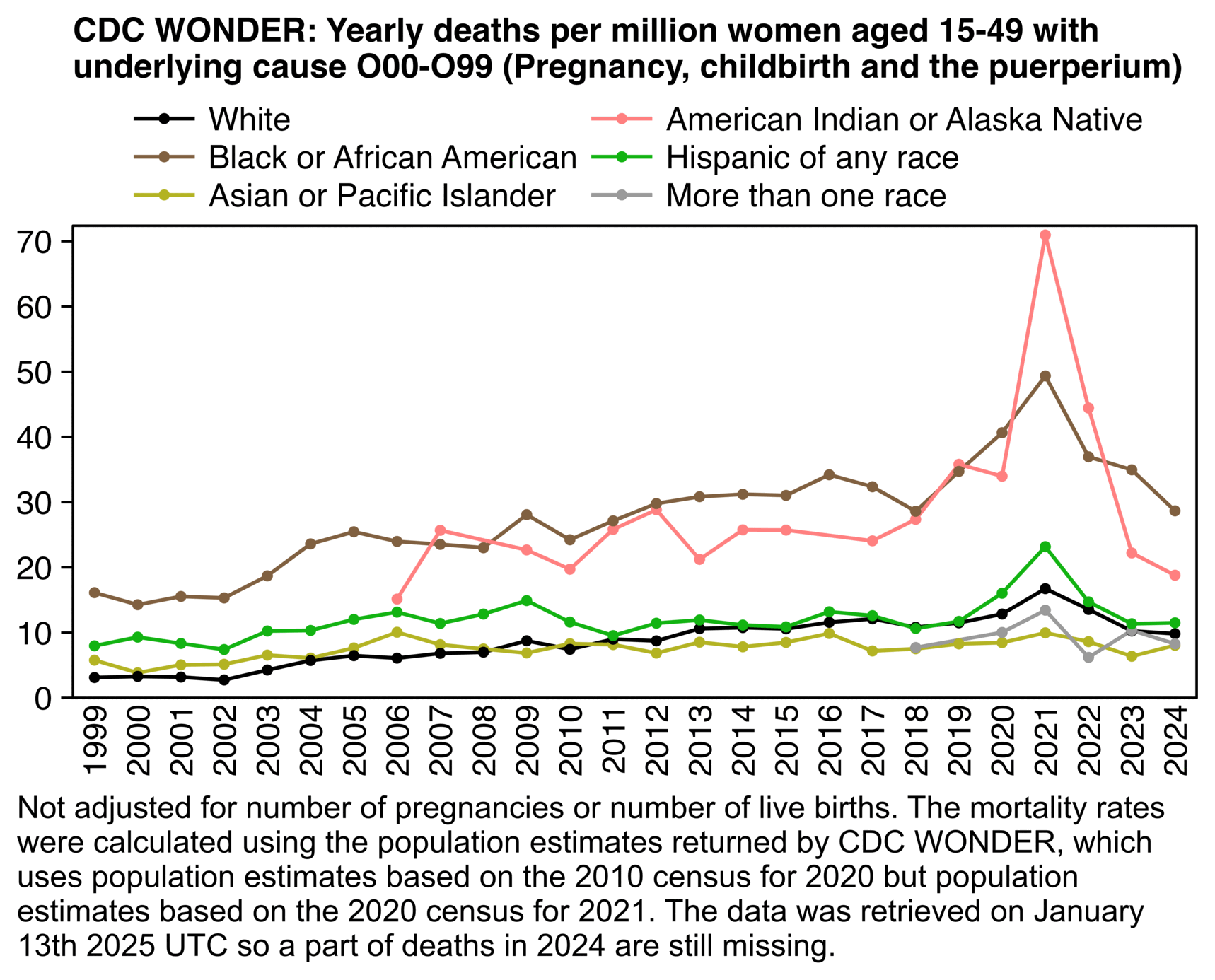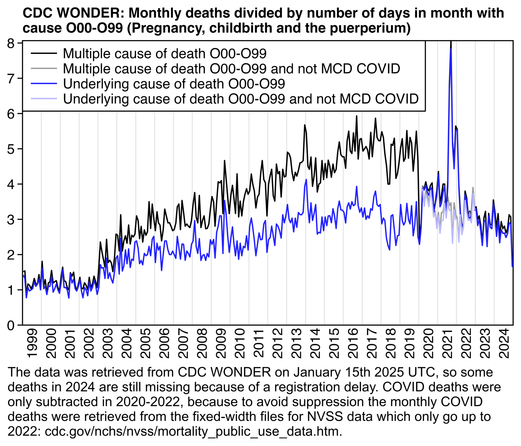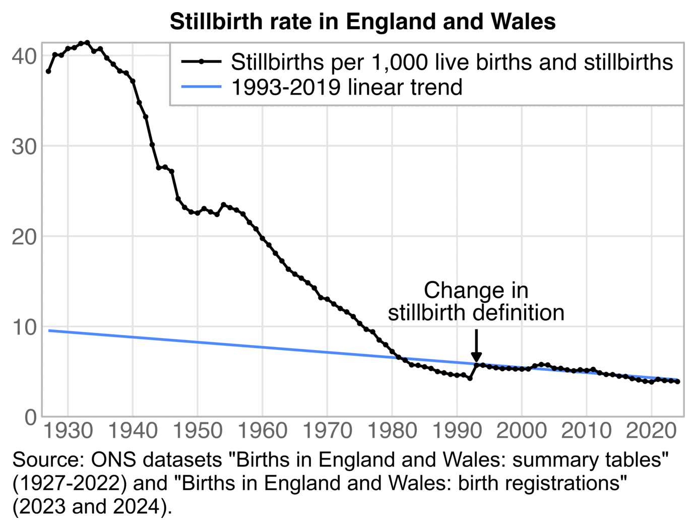 The definition of stillbirth was changed between 1992 and 1993, so in the next plot I used the 1993-2019 linear trend as the baseline, but the stillbirth rate was below the baseline each year in 2021-2024: