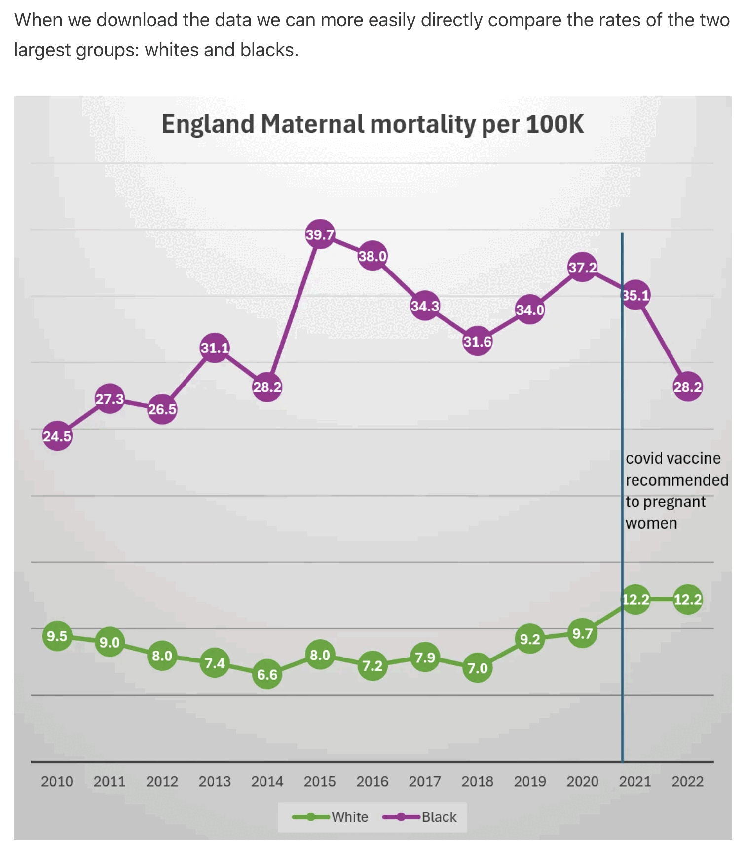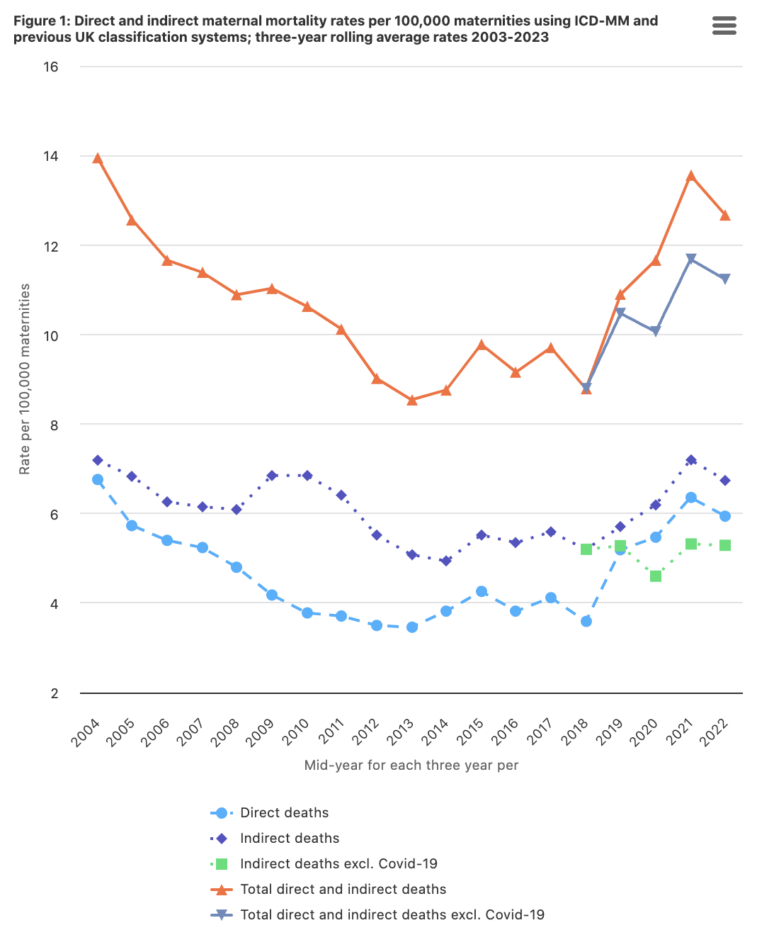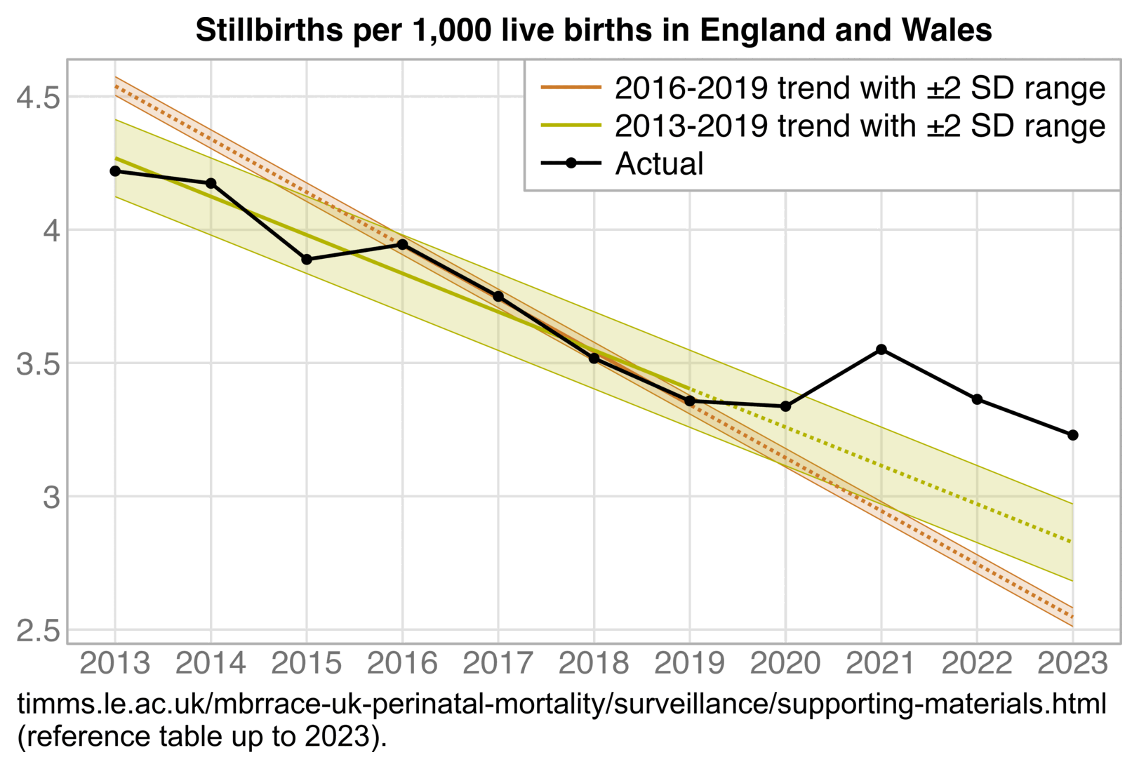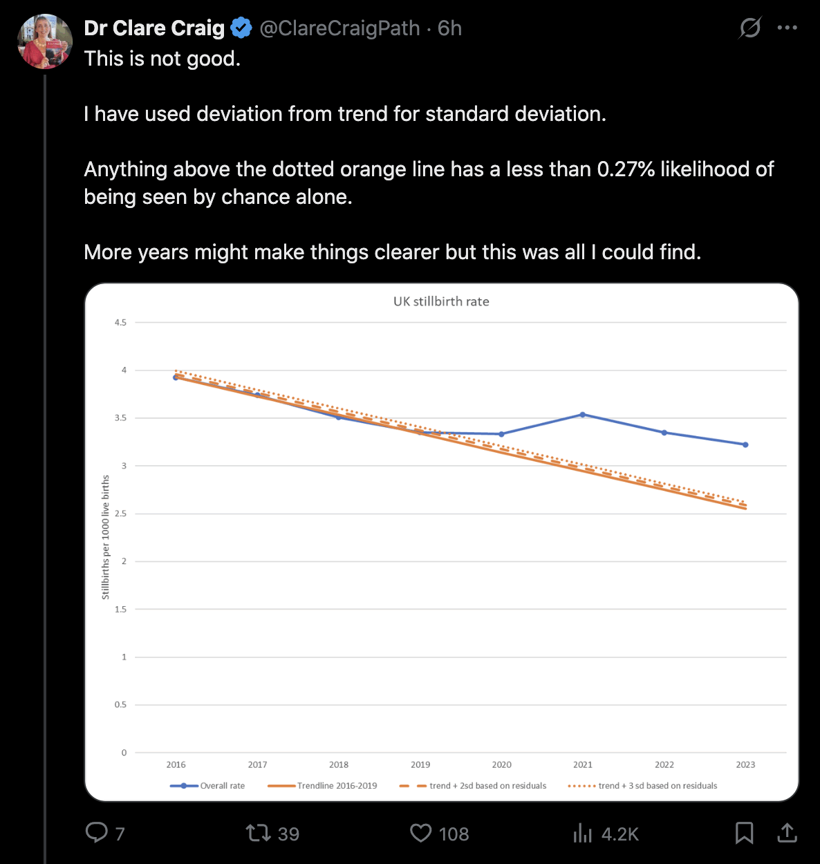 Clare Craig misleadingly started her x-axis from 2016 even though her source dataset had data going back to 2013. With a 2013-2019 linear trend there's only about 6 sigma excess deaths in 2023 and not about 39 sigma excess deaths (even though it's still not too useful to express excess mortality as z-scores like this, unless you are trying to bamboozle statistically unsavvy people into thinking that there is a gazillion sigma black swan event): [https://timms.le.ac.uk/mbrrace-uk-perinatal-mortality/surveillance/supporting-materials.html]