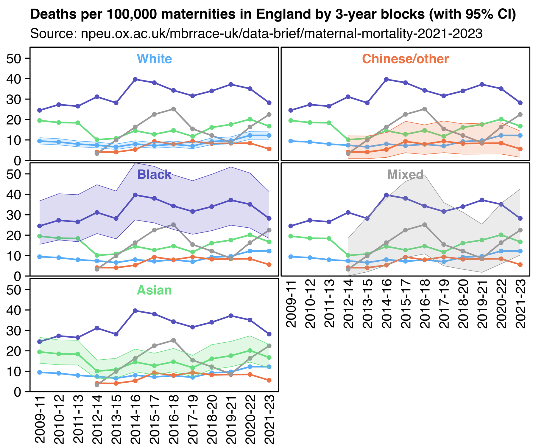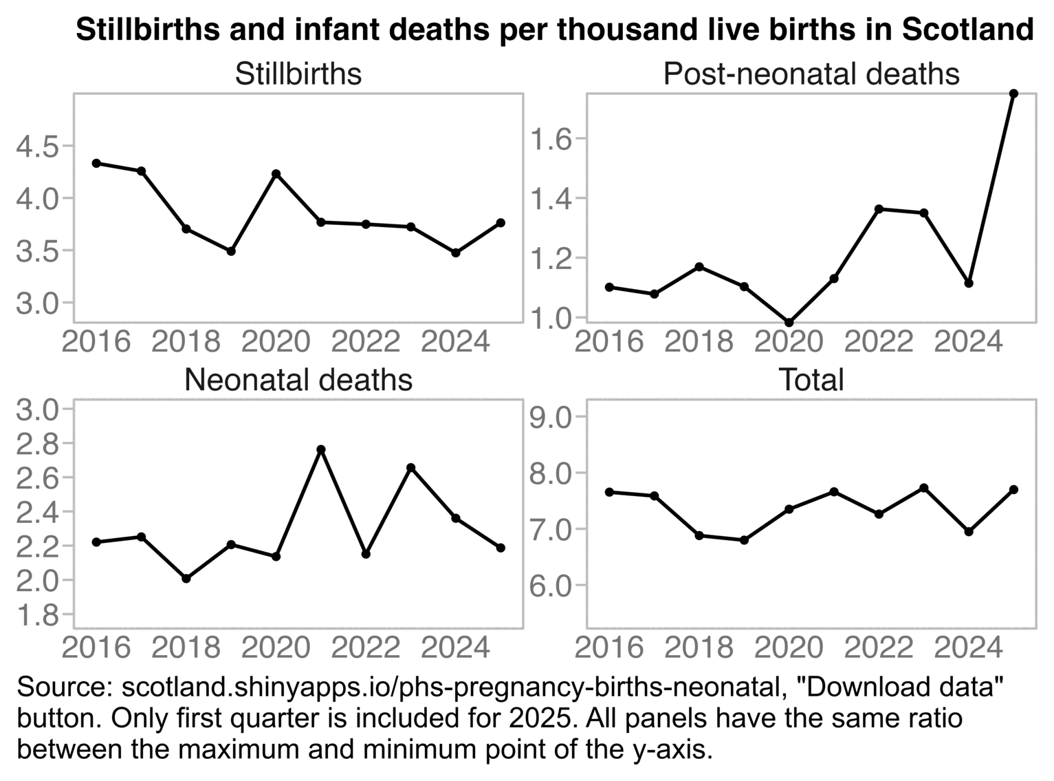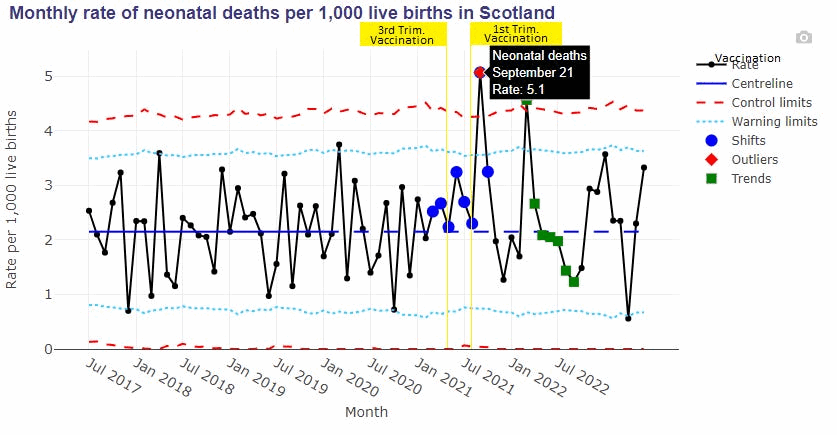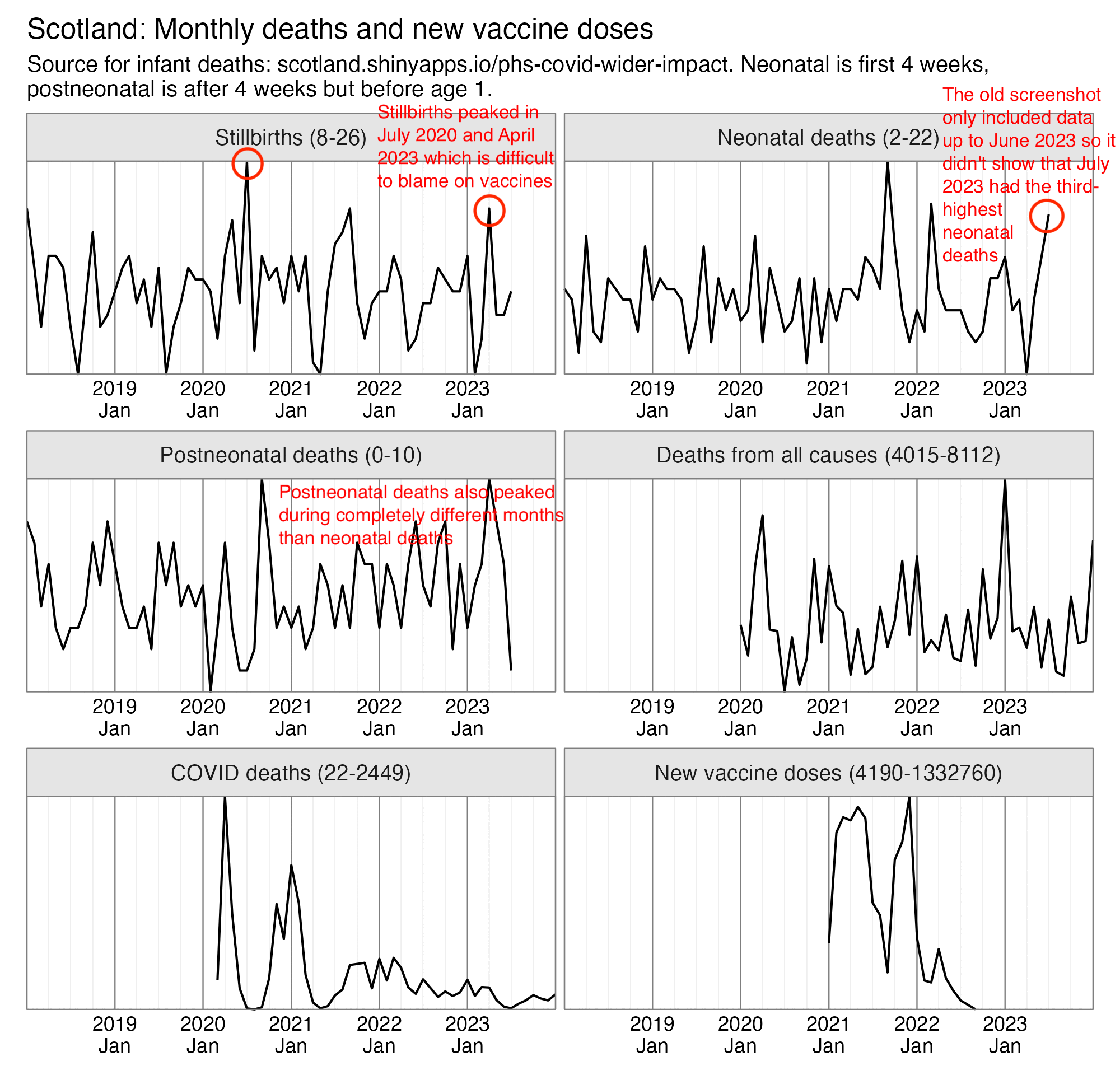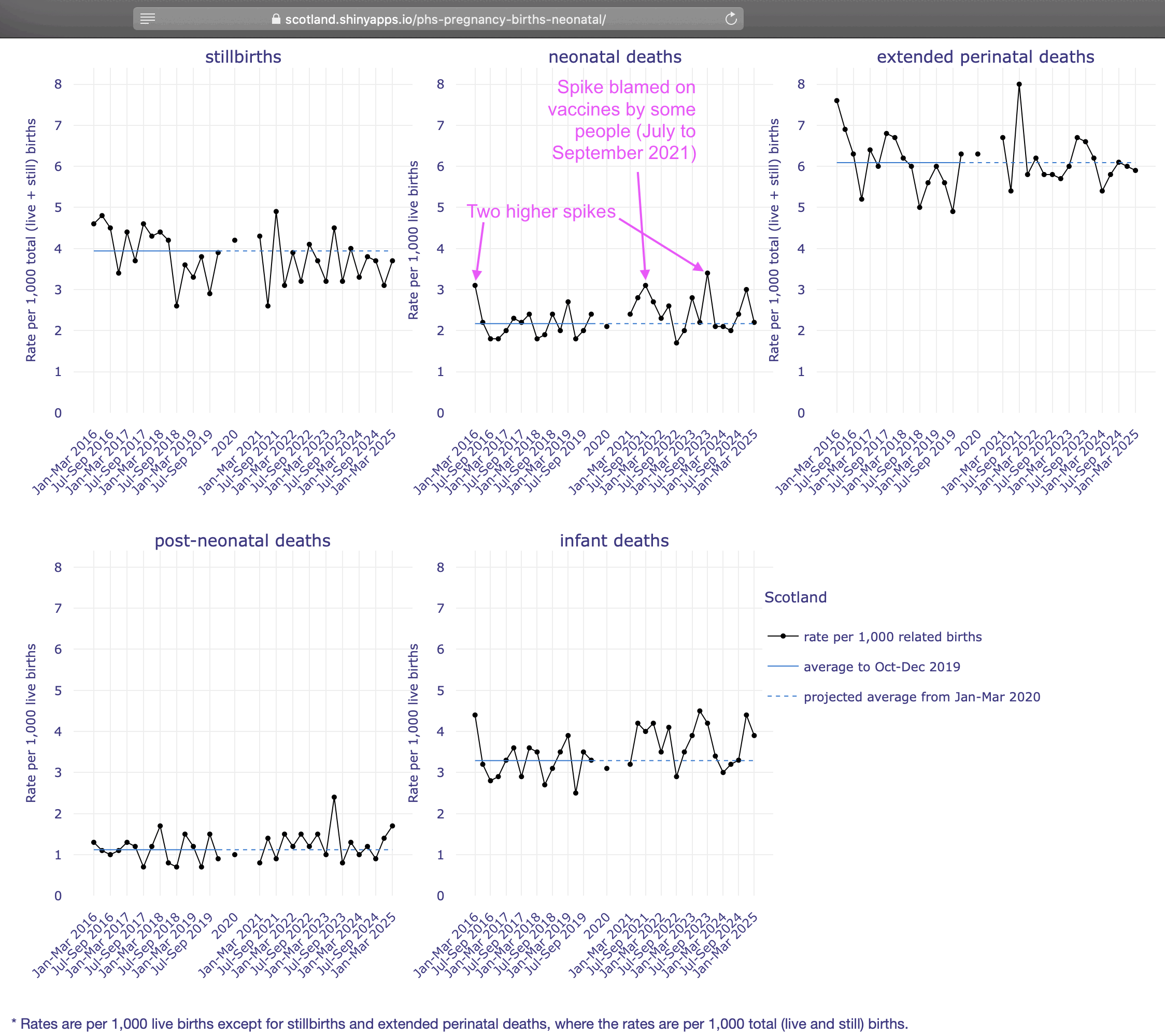 Clare Craig misleadingly started her x-axis from 2016 even though her source dataset had data going back to 2013. With a 2013-2019 linear trend there's only about 6 sigma excess deaths in 2023 and not about 39 sigma excess deaths (even though it's still not too useful to express excess mortality as z-scores like this, unless you are trying to bamboozle statistically unsavvy people into thinking that there is a gazillion sigma black swan event): [https://timms.le.ac.uk/mbrrace-uk-perinatal-mortality/surveillance/supporting-materials.html]