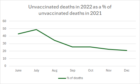 Similarly in the July 2022 release of the ONS dataset, the last month of data included was May 2022 when unvaccinated people had only about 6% higher ASMR than vaccinated people, and it looked like the trend was that unvaccinated ASMR was soon about to cross below vaccinated ASMR. But in the next release after more missing deaths were added, the unvaccinated ASMR in May 2022 became about 22% higher than vaccinated ASMR: