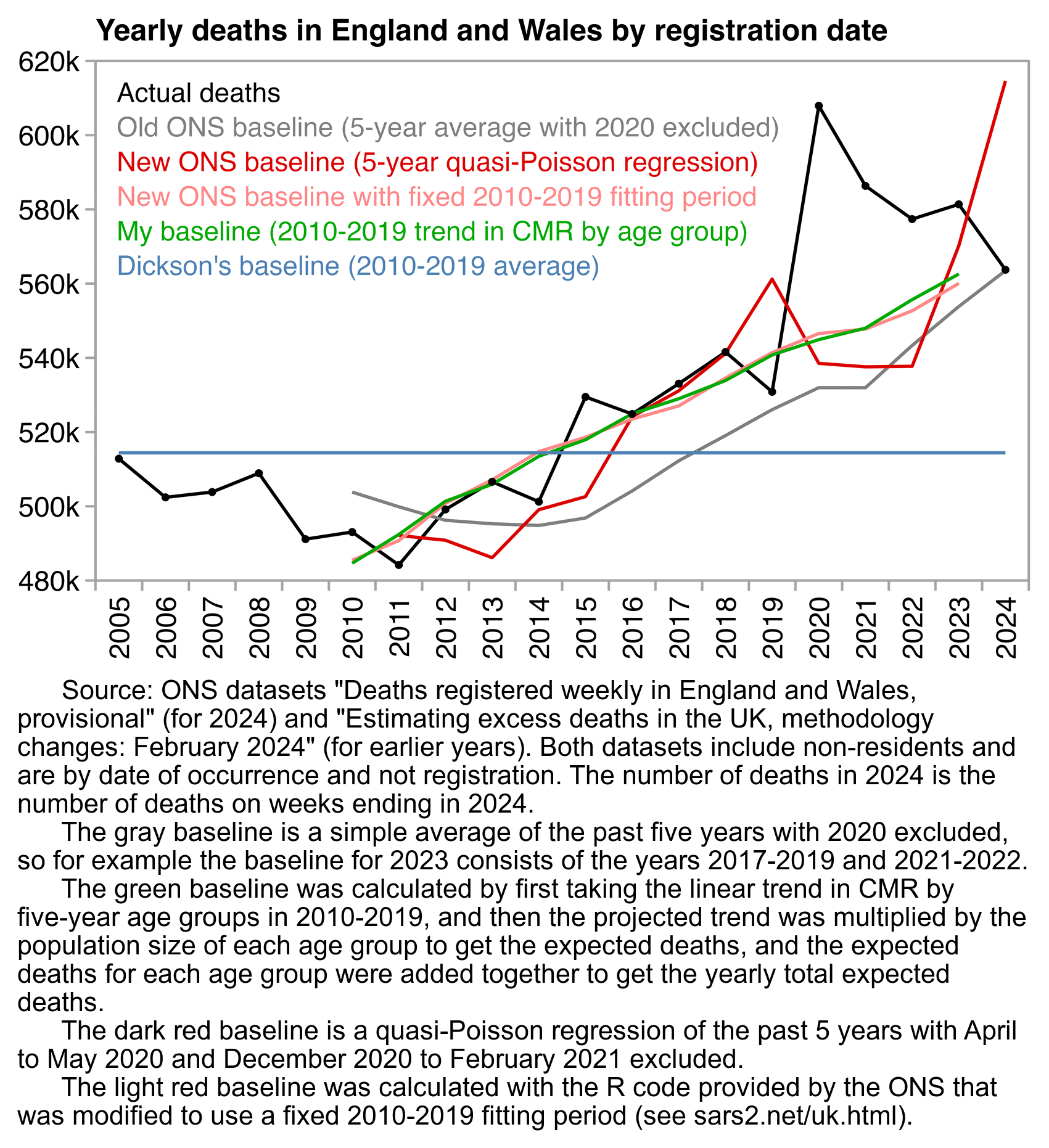 A lot of people were saying that the new method inflated excess deaths because 2020 and later years were included in the fitting period of the baseline, but people didn't realize that the old method also included the years 2021-2023. The old 5-year average underestimated excess deaths because UK has an increasing trend in deaths because of the aging population, but the old method overestimated excess deaths relative to the prepandemic trend because 2021-2023 were included in the baseline fitting period. So the old method was inaccurate in two ways, which ended up partially canceling each other out starting from the year 2022 when 2021 started to be included in the baseline fitting period.